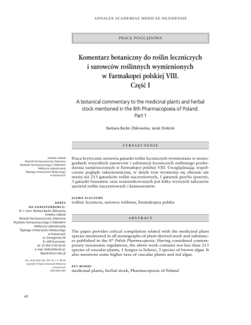 ANNALES ACADEMIAE MEDICAE SILESIENSIS PRACA POGLĄDOWA Komentarz botaniczny do roślin leczniczych i surowców roślinnych wymienionych w Farmakopei polskiej VIII. Część I A botanical commentary to the medicinal plants and herbal stock mentioned in the 8th Pharmacopoeia of Poland. Part 1 Barbara Bacler-Żbikowska, Jacek Drobnik STRESZCZENIE Katedra i Zakład Botaniki Farmaceutycznej i Zielarstwa Wydziału Farmaceutycznego z Oddziałem Medycyny Laboratoryjnej Śląskiego Uniwersytetu Medycznego w Katowicach Praca krytycznie zestawia gatunki roślin leczniczych wymieniane w monografiach wszystkich surowców i substancji leczniczych roślinnego pochodzenia zamieszczonych w Farmakopei polskiej VIII. Uwzględniając współczesne poglądy taksonomiczne, w dziele tym wymienia się obecnie nie mniej niż 213 gatunków roślin naczyniowych, 1 gatunek grzyba (porost), 3 gatunki brunatnic oraz wzmiankowanych jest kilka wyższych taksonów spośród roślin naczyniowych i krasnorostów. S Ł O WA K L U C Z O W E ADRES rośliny lecznicze, surowce roślinne, Farmakopea polska D O KO R E S P O N D E N C J I : Dr n. farm. Barbara Bacler-Żbikowska Katedra i Zakład Botaniki Farmaceutycznej i Zielarstwa Wydziału Farmaceutycznego z Oddziałem Medycyny Laboratoryjnej Śląskiego Uniwersytetu Medycznego w Katowicach ul. Ostrogórska 30 41–200 Sosnowiec tel. 32 364 13 60 do 63 e-mail: [email protected], [email protected] A B S T R AC T The paper provides critical compilation related with the medicinal plant species mentioned in all monographs of plant-derived stock and substances published in the 8th Polish Pharmacopoeia. Having considered contemporary taxonomic regulations, the above work contains not less than 213 species of vascular plants, 1 fungus (a lichen), 3 species of brown algae. It also mentions some higher taxa of vascular plants and red algae. Ann. Acad. Med. Siles. 2011, 65, 1–2, 48–60 Copyright © Śląski Uniwersytet Medyczny w Katowicach ISSN 0208-5607 48 KEY WORDS medicinal plants, herbal stock, Pharmacopoeia of Poland ROĝLINY LECZNICZE I SUROWCE ROĝLINNE WSTĘP Przynależność gatunkowa naturalnych surowców leczniczych jest tradycyjnym zagadnieniem, którym interesuje się farmakognozja i towaroznawstwo zielarskie. Gatunki macierzyste dostarczające niektórych surowców leczniczych nie są jednak określone wprost. Ponadto czasami dane w farmakopeach nie oddają postępu badań nad klasyfikacją roślin. Niniejsza praca skupia się więc na tym zagadnieniu. Farmakopea określa podstawowe wymagania jakościowe oraz metody badań surowców i produktów leczniczych i ich opakowań oraz surowców farmaceutycznych. Do 2008 roku ukazało się siedem numerowanych wydań farmakopei polskiej: − Pharmacopoea Regni Poloniae, nazywana potocznie Farmakopeą polską I, wydana w 1817 r. [1], po niej obowiązywały farmakopee państw zaborczych, w tym tzw. Farmakopee szpitalne (np. 1838, 1860). − Farmakopea polska II (1937, dodruk 1946), − Farmakopea polska III (1954), − Farmakopea polska IV – tom 1 (1965), tom 2 (1970), − Farmakopea polska V – tomy 1–5 (1990, 1993, 1996, 1998, 1999), wraz z suplementem (1995), − Farmakopea polska VI (2002) z suplementem (2005); stanowi komplikację tomów FP V, z poprawkami, to ostatnia polska farmakopea „narodowa”, − Farmakopea polska VII (2007) będąca tłumaczeniem Farmakopei europejskiej 5.x, ukazał się tylko pierwszy tom z suplementem, potem rozpoczęto prace nad FP VIII, ze względu na ukazanie się Farmakopei europejskiej 6.0. Z chwilą wejścia do Unii Europejskiej Polska została zobowiązana do ratyfikacji Konwencji o opracowaniu Farmakopei europejskiej. Od 2006 r. uczestniczymy w pracach Komisji ds. Farmakopei Europejskiej. Zgodnie z postanowieniami Konwencji o opracowaniu farmakopei europejskiej, kraje Unii zobligowano do podjęcia działań zmierzających do zapewnienia, aby monografie Farmakopei europejskiej stały się oficjalnymi standardami stosowanymi w poszczególnych krajach, zastępując wymagania farmakopej narodowych. Wprowadzenie do Farmakopei polskiej polskojęzycznej wersji wymagań Farmakopei europejskiej stało się sposobem realizacji wymagań ww. Konwencji. Od 1 stycznia 2008 r. obowiązuje w Unii Europejskiej nowe, 6. wydanie Farmakopei europejskiej, którego polska wersja opublikowana została jako 8. wydanie Farmakopei polskiej (FP VIII). Zgodnie z prawem farmaceutycznym, monografie nieposiadające odpowiedników w Farmakopei europejskiej (monografie narodowe) opublikowane są w wersji obowiązującej w części podstawowej wydania VI Farmakopei polskiej (FP VI z 2002 r.) i powinny być stosowane zgodnie ze wskazówkami podanymi we Wstępie do tomu 1 FP VII. W związku z tym monografie oraz niektóre działy zamieszczone w części podstawowej wydania Farmakopei polskiej VI, nieposiadające odpowiedników w Farmakopei europejskiej i Farmakopei polskiej VII (w tym monografie preparatów galenowych), pozostają nadal obowiązujące. Farmakopea polska VIII jest dokładnym przekładem Farmakopei europejskiej 6. Suplementy z 2009 i 2010 zawierają teksty i monografie nowe, tzn. wcześniej niezamieszczane, oraz materiały znowelizowane. Teksty te w całości zastępują tym samym odpowiednie teksty FP VIII z 2008 r. W Suplementach zastosowano kontynuację numeracji stron z FP VIII, ponieważ stanowią one integralną część tej publikacji. Od 2009 r. rozpoczęto aktualizację (zgodnie z wymogami ogólnymi i metodyką FP VIII/Ph. Eur.) grupy 140 monografii narodowych, w tym 10 monografii substancji roślinnych, opublikowanych w części podstawowej FP VI z 2002 r. W Suplemencie 2009 FP VIII wprowadzono nowy dział pt. Monografie narodowe, zawierający monografię dotyczą wody (Aqua pro usu officinale). W Suplemencie 2010 dział ten rozszerzono o dalsze monografie, w tym 14 opisujących mieszanki ziołowe i 5 dotyczących substancji roślinnych, wchodzących w ich skład, których monografii brak w FP