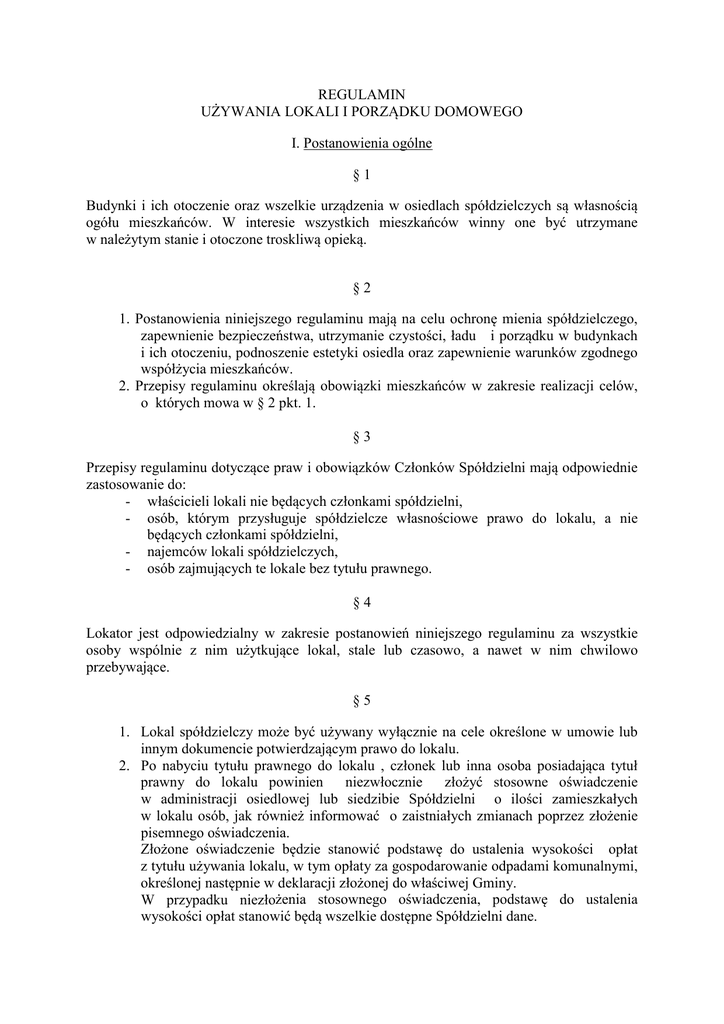 REGULAMIN UŻYWANIA LOKALI I PORZĄDKU DOMOWEGO I. Postanowienia ogólne §1 Budynki i ich otoczenie oraz wszelkie urządzenia w osiedlach spółdzielczych są własnością ogółu mieszkańców. W interesie wszystkich mieszkańców winny one być utrzymane w należytym stanie i otoczone troskliwą opieką. §2 1. Postanowienia niniejszego regulaminu mają na celu ochronę mienia spółdzielczego, zapewnienie bezpieczeństwa, utrzymanie czystości, ładu i porządku w budynkach i ich otoczeniu, podnoszenie estetyki osiedla oraz zapewnienie warunków zgodnego współżycia mieszkańców. 2. Przepisy regulaminu określają obowiązki mieszkańców w zakresie realizacji celów, o których mowa w § 2 pkt. 1. §3 Przepisy regulaminu dotyczące praw i obowiązków Członków Spółdzielni mają odpowiednie zastosowanie do: - właścicieli lokali nie będących członkami spółdzielni, - osób, którym przysługuje spółdzielcze własnościowe prawo do lokalu, a nie będących członkami spółdzielni, - najemców lokali spółdzielczych, - osób zajmujących te lokale bez tytułu prawnego. §4 Lokator jest odpowiedzialny w zakresie postanowień niniejszego regulaminu za wszystkie osoby wspólnie z nim użytkujące lokal, stale lub czasowo, a nawet w nim chwilowo przebywające. §5 1. Lokal spółdzielczy może być używany wyłącznie na cele określone w umowie lub innym dokumencie potwierdzającym prawo do lokalu. 2. Po nabyciu tytułu prawnego do lokalu , członek lub inna osoba posiadająca tytuł prawny do lokalu powinien niezwłocznie złożyć stosowne oświadczenie w administracji osiedlowej lub siedzibie Spółdzielni o ilości zamieszkałych w lokalu osób, jak również informować o zaistniałych zmianach poprzez złożenie pisemnego oświadczenia. Złożone oświadczenie będzie stanowić podstawę do ustalenia wysokości opłat z tytułu używania lokalu, w tym opłaty za gospodarowanie odpadami komunalnymi, określonej następnie w deklaracji złożonej do właściwej Gminy. W przypadku niezłożenia stosownego oświadczenia, podstawę do ustalenia wysokości opłat stanowić będą wszelkie dostępne Spółdzielni dane. 3. Użytkownicy mieszkań zobowiązani są do przestrzegania przepisów meldunkowych. 4. Pomieszczenia, do których administracja przekazała mieszkańcom klucze, powinny być zamykane i wykorzystywane zgodnie z przeznaczeniem. II. Przepisy w zakresie utrzymania w należytym stanie technicznym budynku i lokalu §6 Mieszkańcy obowiązani są dbać i chronić przed uszkodzeniem lub dewastacją części budynków przeznaczone do wspólnego korzystania jak: windy, klatki schodowe, korytarze, pomieszczenia gospodarcze oraz otoczenie budynków. §7 Lokator jest obowiązany dbać o należytą konserwację zajmowanego mieszkania i innych przydzielonych mu pomieszczeń (piwnic, garaży, pomieszczeń przeznaczonych do wykonywania działalności zawodowej) oraz wykonywać drobne naprawy urządzeń technicznych stanowiących wyposażenie mieszkania. 1. Do obowiązków lokatora zajmującego lokal w budynku Spółdzielni należy w szczególności: a) obowiązek odnowienia lokalu polegającym na: - malowaniu sufitów i ścian, co najmniej raz na 4 lata lub tapetowaniu ścian z częstotliwością wynikającą z właściwości techniczno-estetycznych tapet, - malowaniu olejnym drzwi, okien (dwustronnie), ścian i podłóg przeznaczonych do malowania olejnego oraz grzejników, rur i innych urządzeń malowanych olejno dla zabezpieczenia przed korozją – w miarę potrzeby, ze względu na zużycie lub odpadnięcie farby olejnej, chroniącej je przed zniszczeniem, jednak nie rzadziej niż raz na 4 lata; b) naprawa wszystkich urządzeń techniczno-sanitarnych w mieszkaniu, łącznie z wymianą tych urządzeń; c) dokonywanie napraw podłóg, wymiana uszkodzonych zamków w oknach i drzwiach, wymiana i naprawa osprzętu instalacji elektrycznej, zachowanie drożności i odpowiedniego stanu technicznego przewodów odpływowych od urządzeń sanitarnych; d) uzupełnienie oszklenia drzwi i okien, dokonywanie drobnych napraw. 2. W razie nie dokonania drobnych napraw przez użytkownika mieszkania, Spółdzielnia po bezskutecznym wezwaniu ma prawo przeprowadzić te naprawy na jego koszt. 3. Wszelkie uszkodzenia wewnątrz lokalu powstałe z winy lokatora lub jego domowników obciążają lokatora Spółdzielni. 4. Naprawy wewnątrz lokalu zaliczone do obowiązków lokatora oraz odnowienie lokalu mogą być wykonane przez Spółdzielnię tylko za odpłatnością ze strony zainteresowanego lokatora, poza opłatami czynszowymi uiszczanymi za używanie lokalu. 5. O poważniejszych uszkodzeniach urządzeń i instalacji w mieszkaniach należy niezwłocznie zawiadomić administrację, w przeciwnym razie lokator ponosi odpowiedzialność za szkody i straty, które mogą wyniknąć w jego mieszkaniu lub u sąsiadów wskutek zepsucia się instalacji. 6. Ze względu na możliwość przerw w dostawach wody, krany wodociągowe powinny być zawsze zamknięte, a korki w wannach, umywalkach i zlewozmywakach w okresie nie użytkowania zawsze wyjęte dla zabezpieczenia mieszkania przed zalaniem 7. Z uwagi na ewentualność zaistnienia awarii w mieszkaniach w czasie nieobecności mieszkańców i konieczności jej usunięcia – użytkownicy mieszkań w przypadku przewidywanej dłuższej nieobecności winni poinformować administrację, gdzie znajdują się klucze do mieszkania. 8. Mieszkańcy są zobowiązani do udostępnienia lokalu upoważnionym pracownikom Spółdzielni celem przeprowadzenia przeglądu technicznego oraz wykonania remontu lub usunięcia awarii. Jeśli mieszkaniec jest nieobecny albo odmawia udostępnienia lokalu, Spółdzielnia ma prawo wejść do lokalu w obecności funkcjonariuszy Policji, a przypadku zagrożenia pożarowego funkcjonariuszy Straży Pożarnej. §8 1. Wszelkie zmiany i przeróbki w obrębie lokali mieszkalnych lub w pomieszczeniach przeznaczonych do wspólnego użytkow