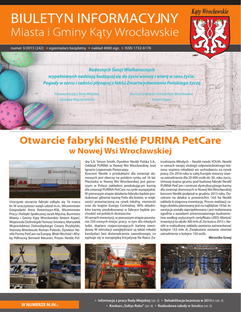 BIULETYN INFORMACYJNY numer 3/2015 (242) egzemplarz bezpłatny nakład 4000 egz. ISSN 1732-6176 Radosnych Świąt Wielkanocnych wypełnionych nadzieją budzącej się do życia wiosny i wiarą w sens życia. Pogody w sercu i radości płynącej z faktu Zmartwychwstania Pańskiego życzą Przewodniczący Rady Miejskiej Jarosław Wojciechowski Burmistrz Miasta i Gminy Kąty Wrocławskie Antoni Kopeć Otwarcie fabryki Nestlé PURINA PetCare w Nowej Wsi Wrocławskiej Uroczyste otwarcie fabryki odbyło się 16 marca br. W uroczystości wzięli udział m.in.: Wiceminister Gospodarki Ilona Antoniszyn-Klik, Wiceminister Pracy i Polityki Społecznej Jacek Męcina, Burmistrz Miasta i Gminy Kąty Wrocławskie Antoni Kopeć, Wojewoda Dolnośląski Tomasz Smolarz, Marszałek Województwa Dolnośląskiego Cezary Przybylski, Starosta Wrocławski Roman Potocki, Dyrektor Nestlé Purina PetCare na Europę, Bliski Wschód i Afrykę Północną Bernard Meunier, Prezes Nestlé Pol- W NUMERZE M.IN.: ska S.A. Simon Smith, Dyrektor Nestlé Polska S.A., Oddział PURINA w Nowej Wsi Wrocławskiej José Ignacio Lopezmalo Perezcarpy. Koncern Nestlé z produktami dla zwierząt domowych jest obecny na polskim rynku od 16 lat. Placówka w Nowej Wsi Wrocławskiej jest pierwszym w Polsce zakładem produkującym karmę dla zwierząt PURINA PetCare na rynki europejskie. W pierwszym etapie działania fabryka będzie produkować głównie karmę Felix dla kotów, w większości przeznaczoną na rynek lokalny, niemiecki oraz do krajów Europy Centralnej. 90% składników karmy produkowanej w fabryce będzie pochodzić od polskich dostawców. W ramach inwestycji, w pierwszym etapie powstanie 250 nowych miejsc pracy, w tym dla młodych ludzi, dopiero rozpoczynających karierę zawodową. W rekrutacji uwzględniani są także młodzi kandydaci bez doświadczenia zawodowego, co wpisuje się w europejską Inicjatywę Na Rzecz Za- trudniania Młodych – Nestlé needs YOUth. Nestlé w ramach swojej strategii odpowiedzialnego biznesu wspiera młodzież we wchodzeniu na rynek pracy. Do 2016 roku w całej Europie stworzy szanse zatrudnienia dla 20 000 osób do 30. roku życia. Umowę kupna gruntu pod budowę fabryki Nestlé PURINA PetCare i centrum dystrybucyjnego karmy dla zwierząt domowych w Nowej Wsi Wrocławskiej koncern Nestlé podpisał w grudniu 2013 roku. Docelowo na działce o powierzchni 14,6 ha Nestlé zakłada 6-etapową inwestycję. Proces realizacji całego obiektu planowany jest na najbliższe 10 lat. Inwestycja została zaprojektowana i jest realizowana zgodnie z zasadami zrównoważonego budownictwa według wytycznych certyfikatu LEED. Wartość inwestycji to około 300 mln zł. Do końca 2015 r. Nestlé w rozbudowę zakładu zamierza zainwestować kolejne 153 mln zł. Zwiększone zostanie również zatrudnienie o kolejne 150 osób. Weronika Szwaj • Informacje z pracy Rady Miejskiej (str. 2) • Rehabilitacja lecznicza w 2015 r. (str. 3) • Konkurs „Sołtys Roku” (str. 4) • Rozbudowa szkoły w Smolcu (str. 5) INFORMACJE Z PRACY RADY MIEJSKIEJ ● INFORMACJE Z UMiG Informacje z pracy Rady Miejskiej W dniu 26.02.2015r. odbyła się sesja Rady Miejskiej, której głównym tematem było omówienie stanu bezpieczeństwa i porządku publicznego, ochrony przeciwpożarowej i przeciwpowodziowej na terenie naszej gminy oraz działalności Gminnego Zespołu Zarządzania Kryzysowego. Odpowiednie informacje z zakresu każdej służby i instytucji składali komendanci Policji, Państwowej Straży Pożarnej, Prokuratury Rejonowej w Środzie Śląskiej i zastępca Burmistrza w Kątach Wrocławskich. Radni oraz mieszkańcy przybyli na sesję zwracali uwagę na zdarzenia, które stwarzają dużą uciążliwość dla mieszkańców, a dotyczą w szczególności włamań i kradzieży (mieszkania, altanki), parkowania samochodów osobowych i ciężarowych w miejscach niedozwolonych, przestępczości alkoholowej i przemocy w rodzinie. Poruszono również temat prewencji związanej w szczególności z osobami starszymi i spotkań środowiskowych na temat np. jak ustrzec się przestępstw metodą na „wnuczka” czy z naciągaSzanownej Pani Jadwidze Wójcik wyrazy głębokiego współczucia i słowa wsparcia w trudnych chwilach, po stracie Syna składają Burmistrz Miasta i Gminy Kąty Wrocławskie, Rada Miejska i pracownicy UMiG Szanownej Pani Grażynie Kapitaniec wyrazy głębokiego współczucia po stracie Ojca składają Burmistrz Miasta i Gminy Kąty Wrocławskie, Rada Miejska i pracownicy UMiG oraz współpracownicy z Gminnego Ośrodka Pomocy Społecznej w Kątach Wrocławskich Szanownemu Panu Przemysławowi Nowackiemu wyrazy głębokiego współczucia z powodu śmierci Ojca składają Burmistrz Miasta i Gminy Kąty Wrocławskie, Rada Miejska i pracownicy UMiG Urząd Miasta i Gminy Kąty Wrocławskie Rynek-Ratusz 1, 55-080 Kąty Wrocławskie tel.: +48 71 390 72 00, +48 71 390 72 06, fax: +48 71 390 72 01 e-mail: [email protected] Godziny pracy urzędu: Pn., Wt., Czw.: 7.30-15.30 · Śr.: 7.30-16.00 · Pt.: 7.30-15.00 · Redakcja: Weronika Szwaj (e-mail: [email protected]) · Wydawca: Urząd Miasta i Gminy Kąty Wrocławskie · Przygotowanie, skład, druk: Infomax-Wrocław Agencja Reklamy ul. Godlewskiego 7b/1 · www.infomax.wroclaw.pl Wydawca zastrzega sobie prawo do skrótów i korekty nadesłanych tekstów i listów. Materiałów niezamówionych nie zwraca. 2 nymi zakupami różnorodnego sprzętu na organizowanych w tym celu promocyjnych spotkaniach. Podnoszono też temat trudnych warunków lokalowych Komisariatu Policji i Jednostki PSP, z rozważeniem działań zmierzających do ich poprawy, poprzez wybudowanie wspólnego obiektu, a doraźnie wspomagając finansowo pozyskiwanie nowego sprzętu. Wszystkim mieszkańcom zależy na wysokim poziomie bezpieczeństwa. Wymaga to aktywności zarówno Policji jak i każdego z nas, nie pozostając obojętnym na wszelkie negatywne zachowania i zdarzenia. Szczególną rolę i zadania m