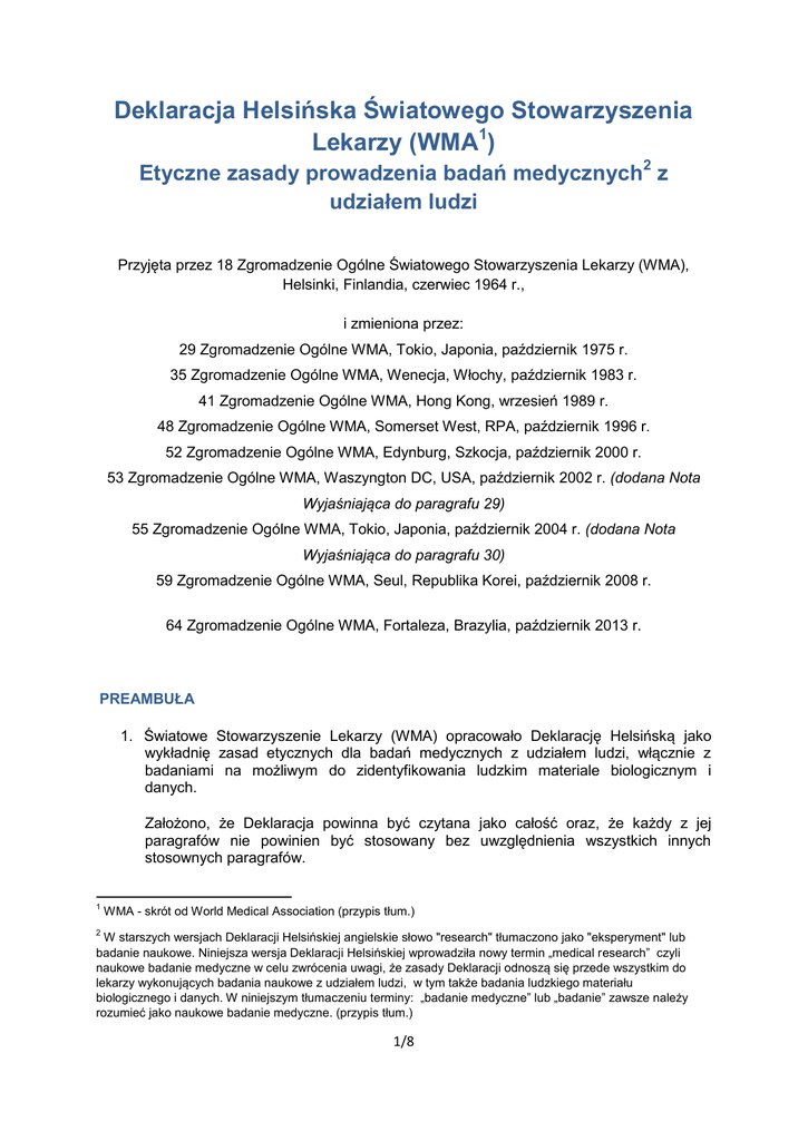 Deklaracja Helsińska Światowego Stowarzyszenia Lekarzy (WMA1) Etyczne zasady prowadzenia badań medycznych2 z udziałem ludzi Przyjęta przez 18 Zgromadzenie Ogólne Światowego Stowarzyszenia Lekarzy (WMA), Helsinki, Finlandia, czerwiec 1964 r., i zmieniona przez: 29 Zgromadzenie Ogólne WMA, Tokio, Japonia, październik 1975 r. 35 Zgromadzenie Ogólne WMA, Wenecja, Włochy, październik 1983 r. 41 Zgromadzenie Ogólne WMA, Hong Kong, wrzesień 1989 r. 48 Zgromadzenie Ogólne WMA, Somerset West, RPA, październik 1996 r. 52 Zgromadzenie Ogólne WMA, Edynburg, Szkocja, październik 2000 r. 53 Zgromadzenie Ogólne WMA, Waszyngton DC, USA, październik 2002 r. (dodana Nota Wyjaśniająca do paragrafu 29) 55 Zgromadzenie Ogólne WMA, Tokio, Japonia, październik 2004 r. (dodana Nota Wyjaśniająca do paragrafu 30) 59 Zgromadzenie Ogólne WMA, Seul, Republika Korei, październik 2008 r. 64 Zgromadzenie Ogólne WMA, Fortaleza, Brazylia, październik 2013 r. PREAMBUŁA 1. Światowe Stowarzyszenie Lekarzy (WMA) opracowało Deklarację Helsińską jako wykładnię zasad etycznych dla badań medycznych z udziałem ludzi, włącznie z badaniami na możliwym do zidentyfikowania ludzkim materiale biologicznym i danych. Założono, że Deklaracja powinna być czytana jako całość oraz, że każdy z jej paragrafów nie powinien być stosowany bez uwzględnienia wszystkich innych stosownych paragrafów. 1 WMA - skrót od World Medical Association (przypis tłum.) 2 W starszych wersjach Deklaracji Helsińskiej angielskie słowo "research" tłumaczono jako "eksperyment" lub badanie naukowe. Niniejsza wersja Deklaracji Helsińskiej wprowadziła nowy termin „medical research” czyli naukowe badanie medyczne w celu zwrócenia uwagi, że zasady Deklaracji odnoszą się przede wszystkim do lekarzy wykonujących badania naukowe z udziałem ludzi, w tym także badania ludzkiego materiału biologicznego i danych. W niniejszym tłumaczeniu terminy: „badanie medyczne” lub „badanie” zawsze należy rozumieć jako naukowe badanie medyczne. (przypis tłum.) 1/8 2. Zgodnie z mandatem WMA Deklaracja jest adresowana przede wszystkim do lekarzy. WMA zachęca też inne osoby zaangażowane w badania medyczne prowadzone z udziałem ludzi, do przyjęcia niniejszych zasad. ZASADY OGÓLNE 3. Deklaracja Genewska WMA zobowiązuje lekarza do przestrzegania zasady "Zdrowie mojego pacjenta będzie moją główną troską", a Międzynarodowy Kodeks Etyki Lekarskiej wskazuje, że "Lekarz, udzielając pacjentowi pomocy medycznej, winien działać w jego najlepszym interesie". 4. Obowiązkiem lekarza jest promocja i ochrona zdrowia, dobrostanu i praw pacjentów, w tym również tych, którzy biorą udział w badaniach medycznych. Wiedza i sumienie lekarza służą wypełnianiu tego obowiązku. 5. Postęp medyczny jest oparty na badaniach naukowych, które w końcowych etapach muszą obejmować badania prowadzone z udziałem ludzi. 6. Podstawowym celem badań medycznych prowadzonych z udziałem ludzi jest zrozumienie przyczyn, rozwoju i skutków chorób oraz doskonalenie interwencji profilaktycznych, diagnostycznych i leczniczych (metod, procedur i leczenia). Nawet aktualnie najlepsze interwencje muszą być ustawicznie oceniane poprzez badania nad ich bezpieczeństwem, skutecznością, efektywnością rzeczywistą3, dostępnością i jakością. 7. Badania medyczne podlegają normom etycznym, które promują i zapewniają poszanowanie każdemu uczestnikowi badania oraz stoją na straży ich zdrowia i praw. 8. Pomimo że podstawowym celem badania medycznego jest zdobycie nowej wiedzy, cel ten nie może w żadnym razie mieć pierwszeństwa nad prawami i interesami uczestników badania naukowego. 9. Lekarze zaangażowani w badania medyczne są zobowiązani do ochrony życia, zdrowia, godności, integralności, prawa do samookreślenia, prywatności oraz poufności danych osobowych uczestników badań. Odpowiedzialność za ochronę uczestników badań spoczywa zawsze na lekarzu lub osobie wykonującej inny zawód medyczny, nigdy zaś na uczestnikach badań, nawet, jeśli wyrazili na to zgodę. 10. Lekarze powinni uwzględniać normy i standardy etyczne, przepisy prawa i inne regulacje dotyczące badań z udziałem ludzi, które obowiązują w ich własnych krajach, jak również odpowiednie międzynarodowe normy i standardy. Żaden krajowy lub międzynarodowy wymóg etyczny, prawny lub wynikający z innych regulacji nie powinien pomniejszać lub eliminować któregokolwiek ze sposobów ochrony uczestników badań określonych w niniejszej Deklaracji. 11. Badania medyczne powinny być prowadzone w taki sposób, by minimalizować możliwe szkodliwe oddziaływania na środowisko. 12. Badania medyczne z udziałem ludzi mogą prowadzić wyłącznie osoby posiadające odpowiednie wykształcenie w zakresie etyki i metod naukowych oraz przygotowanie praktyczne i kwalifikacje. Badania z udziałem pacjentów lub zdrowych ochotników wymagają nadzoru ze strony kompetentnego i odpowiednio wykwalifikowanego lekarza lub osoby wykonującej inny zawód medyczny. 13. Grupom, które nie są wystarczająco reprezentowane w badaniach medycznych powinno się zapewnić odpowiedni dostęp do udziału w tych badaniach. 3 Efektywność rzeczywista (ang. efficiency) odpowiada efektywności danej interwencji w warunkach codziennej praktyki medycznej (przypis tłum.). 2/8 14. Lekarze, którzy łączą badania medyczne z opieką medyczną mogą włączać swoich pacjentów do badań naukowych tylko wówczas, gdy usprawiedliwia to potencjalna profilaktyczna, diagnostyczna lub lecznicza wartość tych badań oraz jeśli lekarz ma dobre podstawy, by sądzić, że udział w badaniu nie wpłynie niekorzystnie na zdrowie pacjentów, którzy wezmą w nich udział. 15. Osobom, które odniosły szkodę w związku z udziałem w badaniu należy zapewnić odpowiednie odszkodowanie i leczenie. RYZYKA4, OBCIĄŻENIA I KORZYŚCI 16. W praktyce lekarskiej i w badaniac