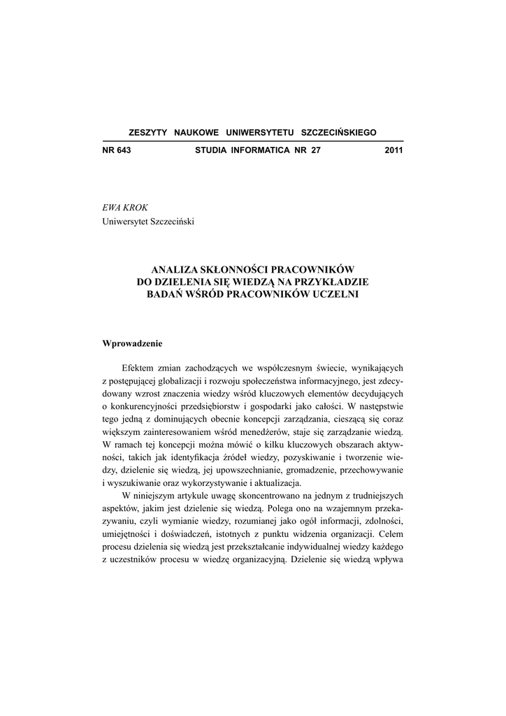 ZESZYTY NAUKOWE UNIWERSYTETU SZCZECIŃSKIEGO NR 643 STUDIA INFORMATICA NR 27 2011 EWA KROK Uniwersytet Szczeciński ANALIZA SKŁONNOŚCI PRACOWNIKÓW DO DZIELENIA SIĘ WIEDZĄ NA PRZYKŁADZIE BADAŃ WŚRÓD PRACOWNIKÓW UCZELNI Wprowadzenie Efektem zmian zachodzących we współczesnym świecie, wynikających z postępującej globalizacji i rozwoju społeczeństwa informacyjnego, jest zdecydowany wzrost znaczenia wiedzy wśród kluczowych elementów decydujących o konkurencyjności przedsiębiorstw i gospodarki jako całości. W następstwie tego jedną z dominujących obecnie koncepcji zarządzania, cieszącą się coraz większym zainteresowaniem wśród menedżerów, staje się zarządzanie wiedzą. W ramach tej koncepcji można mówić o kilku kluczowych obszarach aktywności, takich jak identyfikacja źródeł wiedzy, pozyskiwanie i tworzenie wiedzy, dzielenie się wiedzą, jej upowszechnianie, gromadzenie, przechowywanie i wyszukiwanie oraz wykorzystywanie i aktualizacja. W niniejszym artykule uwagę skoncentrowano na jednym z trudniejszych aspektów, jakim jest dzielenie się wiedzą. Polega ono na wzajemnym przekazywaniu, czyli wymianie wiedzy, rozumianej jako ogół informacji, zdolności, umiejętności i doświadczeń, istotnych z punktu widzenia organizacji. Celem procesu dzielenia się wiedzą jest przekształcanie indywidualnej wiedzy każdego z uczestników procesu w wiedzę organizacyjną. Dzielenie się wiedzą wpływa 130 Ewa Krok na rozszerzenie procesu uczenia się na większe kręgi ludzi oraz przyspiesza proces przekładania wiedzy na działanie. Działania organizacji związane ze zwiększaniem natężenia dzielenia się wiedzą nie należą jednak do łatwych zadań. Dzielenie się wiedzą nie leży w naturze ludzkiej. Prawie zawsze wymaga przełamania licznych barier zarówno po stronie jednostki, jak i po stronie organizacji. Często niezbędne okazują się zmiany w kulturze organizacyjnej i modelu zarządzania. Poniżej zaprezentowano wyniki badań ankietowych przeprowadzonych przez autorkę w Instytucie Informatyki w Zarządzaniu (IIwZ) Wydziału Nauk Ekonomicznych i Zarządzania Uniwersytetu Szczecińskiego. Badania stanowią przykład sposobu diagnozy i analizy skłonności pracowników do wymiany wiedzy. Warto w tym miejscu zaznaczyć, iż wiedza jest istotna z punktu widzenia osiągania zysku nie tylko dla przedsiębiorstw komercyjnych, ale również dla organizacji publicznych, gdzie zysk ma przede wszystkim wymiar społeczny. W przypadku jednostki naukowo-dydaktycznej, jaką jest IIwZ sprawne zarządzanie wiedzą wpływa na efektywność funkcjonowania podmiotu, to jest decyduje między innymi o poziomie i jakości nauczania oraz realizacji projektów naukowo-badawczych. Ma też swoje przełożenie na konkurencyjność jednostki na rynku usług edukacyjnych. 1. Badania ankietowe 1.1. Kwestionariusz ankietowy Wyniki szerokiego przeglądu literatury pod kątem czynników mogących decydować o poziomie skłonności pracowników do dzielenia się wiedzą autorka zamieściła we wcześniejszych pracach1. Możliwa jest następująca ich klasyfikacja: − Czynniki zależne od organizacji (integracja idei dzielenia się wiedzą ze strategią biznesową, kultura organizacyjna, poparcie pracy zespołowej, E. Krok, An analysis of employees’ inclination to knowledge sharing, “Polish Journal of Environmental Studies” 2009, vol. 18, no. 3B, pp. 187–192 oraz E. Krok, Personal engagement in knowledge sharing, “International Journal of Management Cases” 2009, vol. 11, issue 1, pp. 11–22. 1 Analiza skłonności pracowników do dzielenia się wiedzą... 131 bezpośrednie wsparcie zarządu i „przykład z góry”, zapewnianie czasu i stwarzanie okazji do przekazywania wiedzy, atmosfera, środowisko pracy, brak lęku pracownika o rozwój kariery czy utratę pozycji, docenianie i nagradzanie zachowań związanych z dzieleniem się wiedzą, sprawność systemu komunikacji, dostępność i jakość technologii informacyjnej, wielkość firmy, branża i struktura organizacyjna). − Czynniki interpersonalne (relacje międzyludzkie, odwzajemnianie, zobowiązanie, zaufanie co do właściwego wykorzystania wiedzy, identyfikacja z określonym zachowaniem, unikanie zakłopotania, poczucie przynależności do grupy lub zespołu, dążenie do wspólnoty i współdziałania). − Czynniki indywidualne (chciwość, chęć zysku, strach przed karą, poczucie własnej wartości, cechy osobowości, takie jak między innymi optymizm, pewność siebie, altruizm, otwartość na doświadczenia, koszty i czas przyswojenia wiedzy, wiek, płeć, wykształcenie, stan rodzinny, staż pracy, stanowisko). − Czynniki zależne od wiedzy (typ wiedzy determinujący możliwości i czas jej przekazania). Na podstawie tej listy czynników sporządzono kwestionariusz ankietowy2, dzięki któremu możliwe się stało uzyskanie informacji dotyczących postrzegania procesu dzielenia się wiedzą przez pracowników IIwZ oraz indywidualnych hierarchii motywów skłaniających do wymiany wiedzy. Pytania z pierwszej części kwestionariusza pozwoliły przede wszystkim na uzyskanie informacji mówiącej o zaangażowaniu pracowników w proces dzielenia się wiedzą. Ponadto zebrano wartościowe dane na temat popularności wykorzystywania poszczególnych form komunikacji i wymiany wiedzy oraz informacje o indywidualnych odczuciach pracowników dotyczących częstotliwości zachodzenia procesu wymiany wiedzy. Odpowiedzi na pytania z drugiej części kwestionariusza mogą być podstawą do budowy systemów motywacyjnych zachęcających do dzielenia się wiedzą. Dla pracodawcy są to cenne informacje o priorytetach pracownika, o tym, co jest dla niego ważne przy wymianie wiedzy, a także o potrzebie i sposobach motywowania pracownika do dzielenia się wiedzą. 2 Zaprezentowany w: E. Krok, Personal engagement...; tu wykorzystany w nieco zmodyfikowanej formie. 132 Ewa Krok Subiektywna ocena własnego 