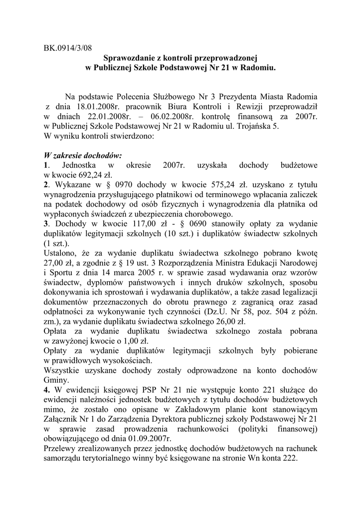 BK.0914/3/08 Sprawozdanie z kontroli przeprowadzonej w Publicznej Szkole Podstawowej Nr 21 w Radomiu. Na podstawie Polecenia SłuŜbowego Nr 3 Prezydenta Miasta Radomia z dnia 18.01.2008r. pracownik Biura Kontroli i Rewizji przeprowadził w dniach 22.01.2008r. – 06.02.2008r. kontrolę finansową za 2007r. w Publicznej Szkole Podstawowej Nr 21 w Radomiu ul. Trojańska 5. W wyniku kontroli stwierdzono: W zakresie dochodów: 1. Jednostka w okresie 2007r. uzyskała dochody budŜetowe w kwocie 692,24 zł. 2. Wykazane w § 0970 dochody w kwocie 575,24 zł. uzyskano z tytułu wynagrodzenia przysługującego płatnikowi od terminowego wpłacania zaliczek na podatek dochodowy od osób fizycznych i wynagrodzenia dla płatnika od wypłaconych świadczeń z ubezpieczenia chorobowego. 3. Dochody w kwocie 117,00 zł - § 0690 stanowiły opłaty za wydanie duplikatów legitymacji szkolnych (10 szt.) i duplikatów świadectw szkolnych (1 szt.). Ustalono, Ŝe za wydanie duplikatu świadectwa szkolnego pobrano kwotę 27,00 zł, a zgodnie z § 19 ust. 3 Rozporządzenia Ministra Edukacji Narodowej i Sportu z dnia 14 marca 2005 r. w sprawie zasad wydawania oraz wzorów świadectw, dyplomów państwowych i innych druków szkolnych, sposobu dokonywania ich sprostowań i wydawania duplikatów, a takŜe zasad legalizacji dokumentów przeznaczonych do obrotu prawnego z zagranicą oraz zasad odpłatności za wykonywanie tych czynności (Dz.U. Nr 58, poz. 504 z późn. zm.), za wydanie duplikatu świadectwa szkolnego 26,00 zł. Opłata za wydanie duplikatu świadectwa szkolnego została pobrana w zawyŜonej kwocie o 1,00 zł. Opłaty za wydanie duplikatów legitymacji szkolnych były pobierane w prawidłowych wysokościach. Wszystkie uzyskane dochody zostały odprowadzone na konto dochodów Gminy. 4. W ewidencji księgowej PSP Nr 21 nie występuje konto 221 słuŜące do ewidencji naleŜności jednostek budŜetowych z tytułu dochodów budŜetowych mimo, Ŝe zostało ono opisane w Zakładowym planie kont stanowiącym Załącznik Nr 1 do Zarządzenia Dyrektora publicznej szkoły Podstawowej Nr 21 w sprawie zasad prowadzenia rachunkowości (polityki finansowej) obowiązującego od dnia 01.09.2007r. Przelewy zrealizowanych przez jednostkę dochodów budŜetowych na rachunek samorządu terytorialnego winny być księgowane na stronie Wn konta 222. 2 Stwierdzono, Ŝe w PSP Nr 21, na koncie 222 księgowane były tylko przelewy dochodów budŜetów z tytułu wynagrodzenia płatnika od terminowego przekazywania podatku dochodowego od osób fizycznych i wypłacania świadczeń z ubezpieczenia społecznego. Brak jest księgowania na tym koncie odprowadzenia na rachunek Urzędu Miejskiego w Radomiu dochodów budŜetowych uzyskanych z innych tytułów. Ustalono, Ŝe szkoła załoŜyła rachunek bankowy przeznaczony do gromadzenia i odprowadzania na rachunek Urzędu Miejskiego w Radomiu uzyskanych dochodów budŜetowych. Uzyskane dochody budŜetowe przelewane są z rachunku bieŜącego szkoły na w/w rachunek dochodów i z tego rachunku odprowadzane na rachunek Urzędu Miejskiego w Radomiu. Stwierdzono, Ŝe w ewidencji księgowej nie utworzono księgowego konta tego rachunku bankowego, w związku z czym operacje księgowe związane z wpływem dochodów budŜetowych na rachunek bankowy dochodów oraz ich przelew z tego rachunku na rachunek dochodów Urzędu Miejskiego w Radomiu nie są ujmowane w ewidencji księgowej szkoły. W zakresie wydatków budŜetowych: 1. Dane wykazane w sprawozdaniu Rb-28S z wykonania planu wydatków budŜetowych za okres od początku roku do dnia listopada 2007r, były zgodne z przedstawionym przez jednostkę rejestrem wydatków za 2007r., prowadzonym do konta 130, wg. rozdziałów i paragrafów. W okresie 2007r. Publiczna Szkoła Podstawowa Nr 21 wydatkowała na płace i pochodne od płac (§§ 4010, 4040, 4110, 4120) kwotę 2.806.689,96 zł., co stanowiło 81,23 % ogółem poniesionych wydatków w tym okresie (3.454.891,61 zł). Wydatki na zakup energii - § 4260 stanowiły kwotę 221.476,01 zł, tj. 6,41 % ogółem poniesionych wydatków w 2007r. 2. Objęte kontrolą wydatki dokonane w czerwcu 2007r. w rozdziałach 80101, 80103, 80195, 85401, 85412, 85415 oraz wydatki poniesione w 2007r. w rozdz. 80146 i rozdz. 80101 § 3020 ogółem w kwocie 306.156,10 zł, stanowiły 8,86 % ogółem poniesionych wydatków w 2007r. 3. Wydatki objęte kontrolą były dokonywane w sposób celowy, oszczędny oraz były związane z działalnością statutową szkoły. 4. Poniesione wydatki były właściwie udokumentowane i zgodne z dokumentami stanowiącymi podstawę ich dokonywania tj. z danymi wynikającymi z faktur, list płac, deklaracji podatkowych i rozliczeniowych ZUS, poleceń księgowania itp. 5. W jednostce były przestrzegane procedury kontroli finansowej. 6. Z zapisów na fakturach i rachunkach wynikało, Ŝe jednostka stosuje zasady ustawy prawo zamówień publicznych. 7. W czerwcu 2007r. zakwalifikowano do niewłaściwych paragrafów następujące wydatki: 3 - zakup ksiąŜek o wartości 121,60., zgodnie z zapisem na fakturze zakupu, ksiąŜki zostały przyjęte na stan biblioteki szkolnej. PowyŜszy wydatek zaksięgowano do § 4210 – „zakup materiałów i wyposaŜenia” zamiast do § 4240 – „Zakup pomocy naukowych, dydaktycznych i ksiąŜek”. - w dniu 19 czerwca zostały wypłacone zapomogi zdrowotne w kwocie 1.600,00 zł. PowyŜszy wydatek został zaksięgowany w § 4010 – „wynagrodzenia osobowe” w rozdz. 80101, 80103 i 85401, zamiast w paragrafie 3020 „wydatki osobowe nie zaliczane do wynagrodzeń”. Przeksięgowania wydatku dokonano w dniu 31.10.2007r. - zapłatę zobowiązania za usługi kominiarskie w kwocie 1.061,40 zł – zaksięgowano w § 4210 „zakup materiałów i wyposaŜenia” zamiast w § 4300 „zakup usług pozostałych”. Przeksięgowania dokonano w dniu 31.07.2007r. - zapłatę zobowiązania w kwocie 4.863,08 zł za zakup ręczników i mydła wydanych pracowni