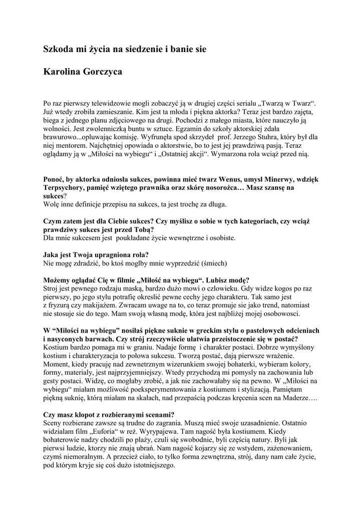 Szkoda mi życia na siedzenie i banie sie Karolina Gorczyca Po raz pierwszy telewidzowie mogli zobaczyć ją w drugiej części serialu „Twarzą w Twarz“. Już wtedy zrobiła zamieszanie. Kim jest ta młoda i piękna aktorka? Teraz jest bardzo zajęta, biega z jednego planu zdjęciowego na drugi. Pochodzi z małego miasta, które nauczyło ją wolności. Jest zwolenniczką buntu w sztuce. Egzamin do szkoły aktorskiej zdała brawurowo...opluwając komisję. Wyfrunęła spod skrzydeł prof. Jerzego Stuhra, który był dla niej mentorem. Najchętniej opowiada o aktorstwie, bo to jest jej prawdziwą pasją. Teraz oglądamy ją w „Miłości na wybiegu“ i „Ostatniej akcji“. Wymarzona rola wciąż przed nią. Ponoć, by aktorka odniosła sukces, powinna mieć twarz Wenus, umysł Minerwy, wdzięk Terpsychory, pamięć wziętego prawnika oraz skórę nosorożca… Masz szansę na sukces? Wolę inne definicje przepisu na sukces, ta jest trochę za długa. Czym zatem jest dla Ciebie sukces? Czy myślisz o sobie w tych kategoriach, czy wciąż prawdziwy sukces jest przed Tobą? Dla mnie sukcesem jest poukładane życie wewnętrzne i osobiste. Jaka jest Twoja upragniona rola? Nie mogę zdradzić, bo ktoś moglby mnie wyprzedzić (śmiech) Możemy oglądać Cię w filmie „Miłość na wybiegu“. Lubisz modę? Stroj jest pewnego rodzaju maską, bardzo dużo mowi o czlowieku. Gdy widze kogos po raz pierwszy, po jego stylu potrafię okreslić pewne cechy jego charakteru. Tak samo jest z fryzurą czy makijażem. Zwracam uwage na to, co teraz promuje sie jako trend, natomiast nie stosuje sie do tego. Mam swoją własną modę, która jest najbliżej mojej osobowosci. W “Miłości na wybiegu” nosiłaś piękne suknie w greckim stylu o pastelowych odcieniach i nasyconych barwach. Czy strój rzeczywiście ułatwia przeistoczenie się w postać? Kostium bardzo pomaga mi w graniu. Nadaje formę i charakter postaci. Dobrze wymyślony kostium i charakteryzacja to połowa sukcesu. Tworzą postać, dają pierwsze wrażenie. Moment, kiedy pracuję nad zewnetrznym wizerunkiem swojej bohaterki, wybieram kolory, formy, materialy, jest najprzyjemniejszy. Wtedy przychodzą mi pomysly na zachowania lub gesty postaci. Widzę, co mogłaby zrobić, a jak nie zachowałaby się na pewno. W „Miłości na wybiegu“ miałam możliwość poeksperymentowania z kostiumem i stylizacją. Pamiętam piękną suknię, którą miałam na skałach, nad przepaścią podczas kręcenia scen na Maderze…. Czy masz kłopot z rozbieranymi scenami? Sceny rozbierane zawsze są trudne do zagrania. Muszą mieć swoje uzasadnienie. Ostatnio widzialam film „Euforia“ w reż. Wyrypajewa. Tam nagość była kostiumem. Kiedy bohaterowie nadzy chodzili po plaży, czuli się swobodnie, byli częścią natury. Byli jak pierwsi ludzie, ktorzy nie znają ubrań. Nam nagość kojarzy się ze wstydem, zażenowaniem, czymś niemoralnym. A przecież ciało, to tylko forma zewnętrzna, strój, dany nam całe życie, pod którym kryje się coś dużo istotniejszego. Jak wcielasz się w dane postaci? Przecież nie zawsze aktor lubi graną przez siebie postać. Nie pamietam, żebym grała postać, której nie lubię, bądź nie akceptuję. Każdą staram się zrozumieć i obronić. Nawet negatywni bohaterowie nie są przecież do końca źli. Trzeba wtedy pokazać ich nieumiejetności, kompleksy i lęki. Jak w życiu. Ludzie z natury są dobrzy. Czasami robia tylko glupie rzeczy. Dostojewski napisal w Biesach: “Człowiek jest zły, bo nie wie, że jest dobry”, i jesli sobie to uswiadamiam, wtedy staję się bardziej wyrozumiała dla siebie. Jak przygotowujesz się do roli? Czytam scenariusz, mam jakąś pierwszą wizualną koncepcję na postać, zapisuje te pomysły, znowu czytam scenariusz, chodzę z nim wszędzie, wyobrażając sobie poszczególne sceny. Czasem prywatnie przyciagam podobne sytuacje, a te doswiadczenia wykorzystuje do budowania postaci. Słucham muzyki i wybieram utwory, ktore mi najbardziej pasuja do historii mojej bohaterki, znowu czytam, zadaję sobie pytanie: „Ty, Karolina, co byś zrobila w takiej sytuacji?” i znowu zapisuję. A potem zmieniam scenariusz na nowy, bo wcześniejsze zapiski juz nie sa aktualne i mieszają mi w głowie. I tym sposobem klaruje się postać, którą bardziej przeczuwam intuicyjnie niż wymyślam za pomoca intensywnych analiz tekstu. Czy myślisz o pracy po pracy? Staram się nie myslec o pracy, gdy jestem w domu, ze znajomymi, czy na spacerze, ale w moim przypadku czesto jest to nieuniknione. Głowa ciągle pracuje, wyobraża, kreuje obrazy. Często jest tak, że idę na zakupy, czy na spacer, ale w wyobraźni ogladam sobie gotowy film, poszczególne sceny, wyobrażam sobie, że gram je na różne sposoby. Obrazy przychodzą same. Czy miewasz momenty, że chciałabyś zbuntować się przeciwko reżyserowi? Czasami. Chcialabym trochę iść pod prad, zniszczyć ład i porządek w scenie, zrobić coś, aby ją złamać, aby utrudnić partnerowi sprawę, znaleźć jakiś konflikt i moment starcia. Często słyszę od rezysera: “Nie, nie, to za dużo, to za mocno, ta postac by tak nie zrobila.” Więc zawsze się dziwię “A dlaczego by tak nie zrobila? Gdzie to jest napisane, co by ta postać zrobiła, przecież to ja gram, i to ode mnie wychodzi ten impuls.” Jestem zwolenniczką buntu w sztuce, ale nie buntu przeciwko wszystkim i wszystkiemu. Trzeba temu nadać dobry kierunek. Pochodzisz z małego miasteczka, i niczym grana przez Ciebie postać przyjechałaś do wielkiego miasta. Czy miałaś wielkie plany, marzenia? Pewnie. Wyspiański napisał:” Musimy zrobić coś, co by od nas zależało, zważywszy, że dzieje się tak dużo, co nie należy do nikogo”. Nadal mam plany i nowe marzenia. Wiem, że jeszcze dużo przede mną. Potrafię cieszyć się swoją młodością i obecnym czasem. Nabieram odwagi z każdym dniem i to daje mi dużo energii. Im więcej człowiek daje z s