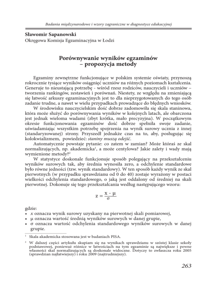 Badania międzynarodowe i wzory zagraniczne w diagnostyce edukacyjnej Sławomir Sapanowski Okręgowa Komisja Egzaminacyjna w Łodzi Porównywanie wyników egzaminów – propozycja metody Egzaminy zewnętrzne funkcjonujące w polskim systemie oświaty, przynoszą rokrocznie tysiące wyników osiągnięć uczniów na różnych poziomach kształcenia. Generuje to nieustającą potrzebę - wśród rzesz rodziców, nauczycieli i uczniów – tworzenia rankingów, zestawień i porównań. Niestety, ze względu na zmieniającą się łatwość arkuszy egzaminacyjnych jest to dla nieprzygotowanych do tego osób zadanie trudne, a nawet w wielu przypadkach prowadzące do błędnych wniosków. W środowisku nauczycielskim dość dobrze zadomowiła się skala staninowa, która może służyć do porównywania wyników w kolejnych latach, ale obarczona jest jednak wieloma wadami (zbyt krótka, mało precyzyjna). W początkowym okresie funkcjonowania egzaminów dość dobrze spełniła swoje zadanie, uświadamiając wszystkim potrzebę spojrzenia na wynik surowy ucznia z innej (standaryzowanej) strony. Przyszedł jednakże czas na to, aby, posługując się kolokwializmem, powiedzieć: staniny muszą odejść. Automatycznie powstaje pytanie: co zatem w zamian? Może któraś ze skal normalizujących, np. akademicka1, a może centylowa? Jakie zalety i wady mają wymienione metody?2 W statystyce doskonale funkcjonuje sposób polegający na przekształceniu wyników surowych tak, aby średnia wynosiła zero, a odchylenie standardowe było równe jedności (tzw. wynik standardowy). W ten sposób każdy wynik ze skal pierwotnych (w przypadku sprawdzianu od 0 do 40) zostaje wyrażony w postaci wielkości odchylenia standardowego, o jaką jest oddalony od średniej na skali pierwotnej. Dokonuje się tego przekształcania według następującego wzoru: x-μ z = ____ σ gdzie: • x oznacza wynik surowy uzyskany na pierwotnej skali pomiarowej, • μ oznacza wartość średnią wyników surowych w danej grupie, • σ oznacza wartość odchylenia standardowego wyników surowych w danej grupie. Skala akademicka stosowana jest w badaniach PISA. 1 W dalszej części artykułu skupiam się na wynikach sprawdzianu w szóstej klasie szkoły podstawowej, ponieważ różnice w łatwościach na tym egzaminie są największe i pewne własności skal normalizujących są doskonale widoczne. Dotyczy to zwłaszcza roku 2005 (sprawdzian najłatwiejszy) i roku 2009 (najtrudniejszy). 2 263 XV Konferencja Diagnostyki Edukacyjnej, Kielce 2009 Uzyskane w ten sposób wartości wyników standaryzowanych przyjmują (najczęściej) postać ułamków o wartościach dodatnich lub ujemnych w zależności od tego, czy odchylają się w górę, czy w dół od wartości średniej. Ponieważ posługiwanie się ułamkami i wartościami ujemnymi przy operowaniu wynikami jest często niewygodne, można dokonać prostego liniowego przekształcenia wyników standaryzowanych na skalę o dowolnej wartości średniej i odchylenia standardowego. Dokonuje się tego, mnożąc każdy wynik standaryzowany przez wartość pożądanego odchylenia standardowego i dodając wartość pożądanej średniej. Tym sposobem otrzymujemy różne tzw. skale normalizacyjne: Skala CEEB (akademicka) = z*100+500 Skala T = z*10+50 Skala IQ = z*15+100 Wynik w skali akademickiej (CEEB) 700 600 500 400 300 200 100 0 0 5 10 15 20 25 30 35 40 Wynik surowy - Sprawdzian 2005 Wykres 1. Wynik sprawdzianu a skala akademicka Wszystkie tego typu skale oparte są na przekształceniach liniowych, co powoduje, że zmiana wyniku surowego o 1 punkt skutkuje zmianą wyniku na skali znormalizowanej o stałą wartość. Ilustracją tego przypadku jest powyższy wykres (1), na którym przedstawiono zależność między wynikiem ze Sprawdzianu 2005 a znormalizowanym wynikiem w skali „akademickiej”. Powstaje pytanie: czy wiedza i umiejętności uczniów, którzy na sprawdzianie uzyskali wyniki 38 i 39 pkt. różnią się tak samo jak wiedza i umiejętności tych zdających, którzy uzyskali odpowiednio 20 i 21 punktów? Intuicja podpowiada, że raczej nie . Rozważmy sytuację ucznia, który, rozwiązując test, dotarł do momentu, w którym uzyskał 38 pkt. Do rozwiązania pozostały mu jeszcze dwa zadania, są to dwie szanse na uzyskanie dodatkowego punktu. Wykorzysta je lub nie. Inny uczeń w trakcie rozwiązywania arkusza ma już na swoim koncie 20 pkt i ma jeszcze przed sobą 20 zadań (szans) na uzyskanie kolejnego. Jest w „lepszym” położeniu. Rozumowanie to oczywiście jest uproszczone - zakłada, że uczniowie najpierw rozwiązują te problemy, z którymi sobie radzą, a trudne zostawiają na koniec. I często taka strategia postępowania jest stosowana przez uczniów. 264 Badania międzynarodowe i wzory zagraniczne w diagnostyce edukacyjnej Ponadto skale oparte o wynik standardowy zakładają, że wynik średni z dwóch różnych testów jest równoważny. Przyjrzyjmy się zatem dwu przykładowym rozkładom różniącym się średnią i co ważniejsze skośnością (CzarnottaMączyńska i in., 2007). Wykres 2. Rozkład prawoskośny M – mediana, X – średnia) i lewoskośny (D – dominanta, Wynik średni w pierwszym rozkładzie (prawoskośnym) jest co najmniej dobry. Zdający uzyskał wynik lepszy od większości rówieśników. W drugim przypadku jest odwrotnie – jest to wynik gorszy. Zrównywanie tych wyników i komunikowanie, że są one równoważne jest chyba pomyłką. Wydaje się, że dużo lepszym parametrem pozwalającym porównywać efekty testowania jest mediana. Zarówno w jednym, jak i drugim rozkładzie uczeń, którego osiągnięcia równają się medianie, pozostawił w polu 50% zdających i dał się „wyprzedzić” przez 50%. A może lepiej stosować skalę centylową? To lepsze rozwiązanie, ale ze względu na własności skali centylowej przekształcenie wyniku surowego na centyle owocuje zupełnie odwrotnym od oczekiwanego efektem. Uzyskanie dod
