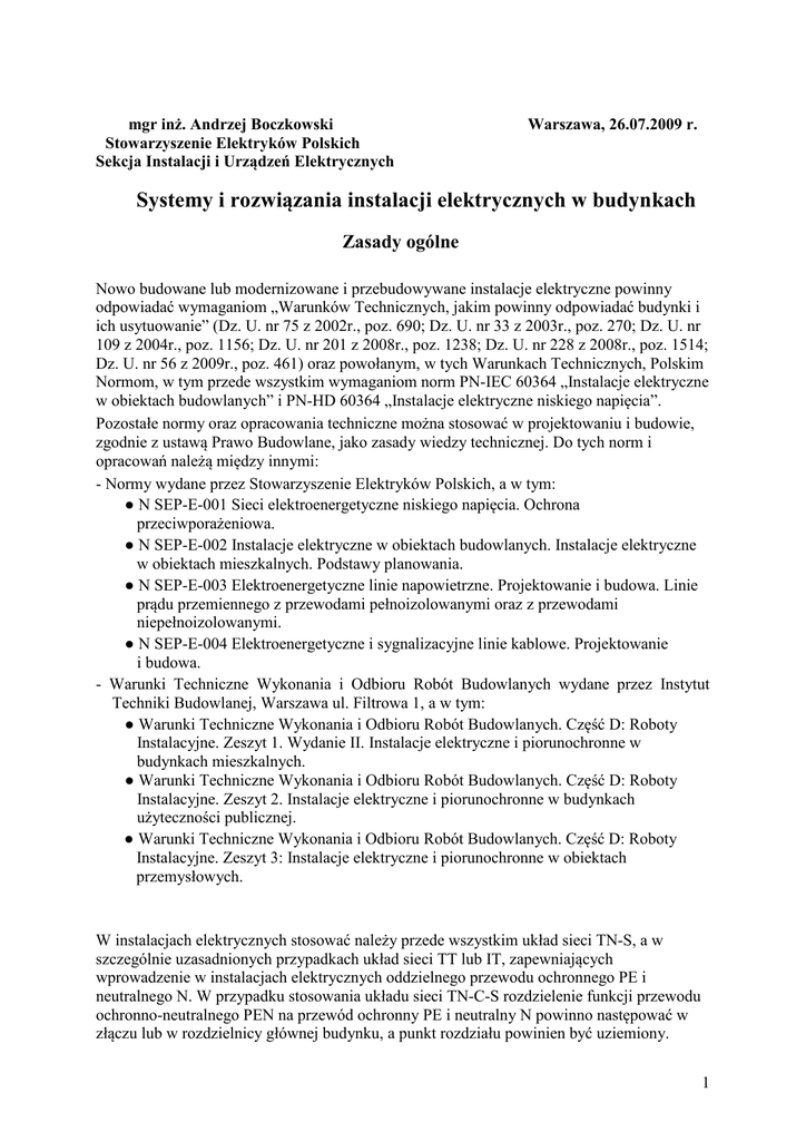 mgr inż. Andrzej Boczkowski Stowarzyszenie Elektryków Polskich Sekcja Instalacji i Urządzeń Elektrycznych Warszawa, 26.07.2009 r. Systemy i rozwiązania instalacji elektrycznych w budynkach Zasady ogólne Nowo budowane lub modernizowane i przebudowywane instalacje elektryczne powinny odpowiadać wymaganiom „Warunków Technicznych, jakim powinny odpowiadać budynki i ich usytuowanie” (Dz. U. nr 75 z 2002r., poz. 690; Dz. U. nr 33 z 2003r., poz. 270; Dz. U. nr 109 z 2004r., poz. 1156; Dz. U. nr 201 z 2008r., poz. 1238; Dz. U. nr 228 z 2008r., poz. 1514; Dz. U. nr 56 z 2009r., poz. 461) oraz powołanym, w tych Warunkach Technicznych, Polskim Normom, w tym przede wszystkim wymaganiom norm PN-IEC 60364 „Instalacje elektryczne w obiektach budowlanych” i PN-HD 60364 „Instalacje elektryczne niskiego napięcia”. Pozostałe normy oraz opracowania techniczne można stosować w projektowaniu i budowie, zgodnie z ustawą Prawo Budowlane, jako zasady wiedzy technicznej. Do tych norm i opracowań należą między innymi: - Normy wydane przez Stowarzyszenie Elektryków Polskich, a w tym: ● N SEP-E-001 Sieci elektroenergetyczne niskiego napięcia. Ochrona przeciwporażeniowa. ● N SEP-E-002 Instalacje elektryczne w obiektach budowlanych. Instalacje elektryczne w obiektach mieszkalnych. Podstawy planowania. ● N SEP-E-003 Elektroenergetyczne linie napowietrzne. Projektowanie i budowa. Linie prądu przemiennego z przewodami pełnoizolowanymi oraz z przewodami niepełnoizolowanymi. ● N SEP-E-004 Elektroenergetyczne i sygnalizacyjne linie kablowe. Projektowanie i budowa. - Warunki Techniczne Wykonania i Odbioru Robót Budowlanych wydane przez Instytut Techniki Budowlanej, Warszawa ul. Filtrowa 1, a w tym: ● Warunki Techniczne Wykonania i Odbioru Robót Budowlanych. Część D: Roboty Instalacyjne. Zeszyt 1. Wydanie II. Instalacje elektryczne i piorunochronne w budynkach mieszkalnych. ● Warunki Techniczne Wykonania i Odbioru Robót Budowlanych. Część D: Roboty Instalacyjne. Zeszyt 2. Instalacje elektryczne i piorunochronne w budynkach użyteczności publicznej. ● Warunki Techniczne Wykonania i Odbioru Robót Budowlanych. Część D: Roboty Instalacyjne. Zeszyt 3: Instalacje elektryczne i piorunochronne w obiektach przemysłowych. W instalacjach elektrycznych stosować należy przede wszystkim układ sieci TN-S, a w szczególnie uzasadnionych przypadkach układ sieci TT lub IT, zapewniających wprowadzenie w instalacjach elektrycznych oddzielnego przewodu ochronnego PE i neutralnego N. W przypadku stosowania układu sieci TN-C-S rozdzielenie funkcji przewodu ochronno-neutralnego PEN na przewód ochronny PE i neutralny N powinno następować w złączu lub w rozdzielnicy głównej budynku, a punkt rozdziału powinien być uziemiony. 1 Zapewnia to utrzymanie potencjału ziemi na przewodzie ochronnym PE przyłączonym do części przewodzących dostępnych urządzeń elektrycznych w normalnych warunkach pracy instalacji elektrycznej. Możliwie licznie uziemiane powinny być również przewody ochronne PE i ochronno-neutralne PEN. Złącza instalacji elektrycznej budynku, umożliwiające odłączenie od elektroenergetycznej sieci zasilającej, powinny być usytuowane w miejscu dostępnym dla dozoru i obsługi oraz zabezpieczone przed uszkodzeniami, wpływami atmosferycznymi, a także przed ingerencją osób niepowołanych. Jako uziomy należy wykorzystywać metalowe konstrukcje budynków, zbrojenia fundamentów oraz inne metalowe elementy umieszczone w niezbrojonych fundamentach stanowiące sztuczny uziom fundamentowy. Doboru przewodów ze względu na obciążalność prądową długotrwałą należy dokonywać zgodnie z Polską Normą PN-IEC 60364-5-523 „Instalacje elektryczne w obiektach budowlanych. Dobór i montaż wyposażenia elektrycznego. Obciążalność prądowa długotrwała przewodów”. Jako elementy zabezpieczeń przed prądem przetężeniowym (przeciążenie i zwarcie) należy stosować w obwodach odbiorczych wyłączniki nadprądowe. Urządzenia zabezpieczające powinny działać w sposób selektywny (wybiórczy), to znaczy w przypadku uszkodzeń wywołujących przetężenie powinno działać tylko jedno zabezpieczenie, zainstalowane najbliżej miejsca uszkodzenia w kierunku źródła zasilania. Działanie zabezpieczenia powinno spowodować wyłączenie uszkodzonego odbiornika lub obwodu, zachowując ciągłość zasilania odbiorników i obwodów nieuszkodzonych. Zabezpieczenia przetężeniowe działają selektywnie (wybiórczo), jeżeli ich pasmowe charakterystyki czasowo-prądowe nie przecinają się ani nie mają wspólnych obszarów działania. Stosowanie urządzeń ochronnych różnicowoprądowych (wyłączniki ochronne różnicowoprądowe, wyłączniki współpracujące z przekaźnikami różnicowoprądowymi) w instalacjach elektrycznych ma na celu: - ochronę przy uszkodzeniu przy zastosowaniu wyżej wymienionych urządzeń jako elementów samoczynnego wyłączenia zasilania, - ochronę uzupełniającą w przypadku uszkodzenia środków ochrony podstawowej i/lub środków ochrony przy uszkodzeniu lub w przypadku nieostrożności użytkowników, przy zastosowaniu wyżej wymienionych urządzeń o znamionowym prądzie różnicowym nie większym niż 30 mA obwodach odbiorczych gniazd wtyczkowych o prądzie znamionowym nieprzekraczającym 20 A, które są przewidziane do powszechnego użytkowania i do obsługiwania przez osoby niewykwalifikowane oraz w obwodach zasilających urządzenia ruchome o prądzie znamionowym nieprzekraczającym 32 A, używane na zewnątrz, - ochronę przed pożarami wywołanymi prądami doziemnymi przy zastosowaniu wyżej wymienionych urządzeń o znamionowym prądzie różnicowym nie większym niż 500 mA. Stosowanie urządzeń ochronnych różnicowoprądowych o znamionowym prądzie różnicowym nie większym niż 30 mA w obwodach zasilających gniazda wtyczkowe na terenach budowy, 2 w gospodarstwach rolniczych i ogrodniczych, łazienka