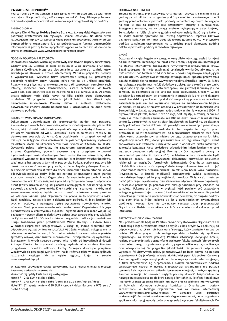 PRZYGOTUJ SIE DO PODRÓŻY Podróż rodzi się w marzeniach, a jeśli jesteś w tym miejscu tzn., że właśnie je realizujesz! Nie pozwól, aby jakiś szczegół popsuł Ci plany. Dlatego polecamy, byś przed wyjazdem przeczytał ważne informacje i przygotował się do podróży. PRZED ODLOTEM Wszyscy Klienci Wezyr Holiday Service Sp. z o.o. (zwaną dalej Organizatorem) podróżują czarterowymi lub rejsowymi liniami lotniczymi. Na dzień przed rozpoczęciem Imprezy turystycznej Klient powinien potwierdzić godziny odlotu bezpośrednio u Organizatora lub za pośrednictwem Agenta. Jednocześnie informujemy, iż godziny lotów są ogólnodostępne i na bieżąco aktualizowane na stronie internetowej: www.wezyrholidays.pl/rozklad_lotow. GODZINY ODLOTÓW I PRZYLOTÓW Dzień odlotu i powrotu wlicza się w całkowity czas trwania Imprezy turystycznej. Godziny przelotu ustalane są przez przewoźnika w porozumieniu z Urzędem Lotnictwa Cywilnego. Mogą one ulec zmianie w stosunku do rozkładu lotów zawartego na Umowie i stronie internetowej. W takim przypadku prosimy o wyrozumiałość. Wszystkie firmy przewozowe starają się przestrzegać podanych rozkładów lotów. Czasem jednak nie da się uniknąć opóźnień. Przyczyny mogą być różne: niekorzystne warunki pogodowe, wzmożony ruch lotniczy, konieczne prace konserwacyjne, usterki techniczne. W takich wypadkach bezpieczeństwo jest dla nas ważniejsze niż punktualność. Do zmian godzin odlotów może dojść nawet na kilka godzin przed planowanym rozkładem. W przypadku zaistnienia jakichkolwiek zmian Klienci będą niezwłocznie informowani. Prosimy jednak o osobiste, telefoniczne potwierdzenie godziny odlotu bezpośrednio u Organizatora na dzień przed planowaną podróżą. PASZPORT, WIZA, OPŁATA TURYSTYCZNA Dokumentem uprawniającym do przekroczenia granicy jest paszport, a w niektórych krajach dodatkowo wiza, natomiast do krajów należących do Unii Europejskiej – dowód osobisty lub paszport. Wymagane jest, aby dokument ten był ważny (niezależnie od wieku uczestnika) przez co najmniej 6 miesięcy po planowanym powrocie do kraju. Czas oczekiwania na paszport wynosi od miesiąca do 6 tygodni. Czas oczekiwania na paszport tymczasowy wydawany małoletnim, którzy nie ukończyli 5 roku życia, wynosi od 3 tygodni do 30 dni. Obywatele polscy, legitymujący się paszportem zagranicznym korzystający z usług Organizatora, powinni zapoznać się z przepisami wizowymi i paszportowymi kraju docelowego. Dane uczestnika (nazwisko, imię, data urodzenia) wpisane w dokumentach podróży (bilet lotniczy, voucher hotelowy, wiza) muszą być zgodne z danymi w paszporcie. Podczas podróży paszport lub dowód należy mieć zawsze przy sobie, a nie w bagażu głównym. Paszport ze zdjęciem wymagany jest także dla dzieci i niemowląt. Organizator nie ponosi odpowiedzialności za osoby, które nie zostaną przepuszczone przez granicę z przyczyn niezależnych od Organizatora. Za zagubienie paszportu i innych dokumentów oraz koszty związane z procedurą otrzymania nowych, odpowiada Klient (koszty uzależnione są od placówek wydających te dokumenty). Jeżeli z powodu zagubienia dokumentów Klient spóźni się na samolot, na który miał zarezerwowane miejsce, będzie musiał pokryć dodatkowe koszty przelotu we własnym zakresie, gdyż Organizator nie ponosi za to odpowiedzialności. Jeżeli zagubiony zostanie jeden z dokumentów podróży, tj. bilet lotniczy lub voucher hotelowy, a wymagane będzie wystawienie nowych dokumentów, wówczas Klient powinien niezwłocznie poinformować Organizatora lub jego przedstawiciela w celu wydania duplikatu. Wydanie duplikatu może wiązać się z zakupem nowego biletu za dodatkową opłatą Koszt zakupu wizy przy wjeździe do Egiptu wynosi 15 USD. Na lotnisku w Hurghadzie możliwa jest dodatkowa usługa świadczona przez przedstawiciela Wezyr Holidays – Odeon Tours w postaci ekspresowej usługi wizowej. Z usługi tej można skorzystać przy odpowiednio wyższej cenie w wysokości 17 USD [wiza + usługa]. Usługa ta ma na celu znaczne skrócenia czasu, który trzeba poświęcić na zakup wizy w punkcie sprzedaży wizowej oraz znaczne usprawnienie i przyśpieszenie jej wydawania. Zaznaczamy, iż wybór sposobu zakupu wizy należy od indywidualnej decyzji każdego Klienta. By usprawnić przebieg wydania wizy radzimy Państwu przygotować uprzednio odliczoną kwotę. Szczegóły dotyczące przepisów wjazdowych do poszczególnych krajów znajdą Państwo także w poszczególnych rozdziałach katalogu lub w opisie regionu, kraju na stronie www.wezyrholidays.pl. W Katalonii obowiązuje opłata turystyczna, którą Klienci wnoszą w recepcji hotelowej podczas kwaterowania. Wysokość tej opłaty kształtuje się następująco: Hotel 5* – 2,50 EUR / osoba / doba, Hotel 4* – 1,00 EUR / osoba / doba (Barcelona 1,25 euro / osoba / doba), Hotel 3*, 2*, apartamenty – 0,50 EUR / osoba / doba (Barcelona 0,75 euro / osoba / doba). Data Przeglądu: 08.09.2013] - [Numer Przeglądu: 12] ODPRAWA NA LOTNISKU Zbiórka na lotnisku, przy stanowisku Organizatora, odbywa się minimum na 2 godziny przed odlotem w przypadku podróży samolotem czarterowym oraz 3 godziny przed odlotem w przypadku podróży samolotem rejsowym. Ze względu na fakt, iż czas na odprawę jest ograniczony, prosimy o punktualność. Szczególnie zwracamy na to uwagę osobom wykupującym dolot krajowy. Ze względu na ściśle określone godziny odlotów należy liczyć się z faktem, że osoby znacznie spóźnione nie zostaną odprawione. Odprawa biletowo bagażowa kończy się 40 minut przed planowaną godziną odlotu w przypadku podróży samolotem czarterowym lub 1 godzinę przed planowaną godziną odlotu w przypadku podróży samolotem rejsowym. BAGAŻ Dopuszczalny ciężar bagażu wliczonego w cenę biletu lotniczego uzależniony jest od linii lotniczych. Informacje na temat ilości i rodzaju bagażu umieszczona jest na stronie int