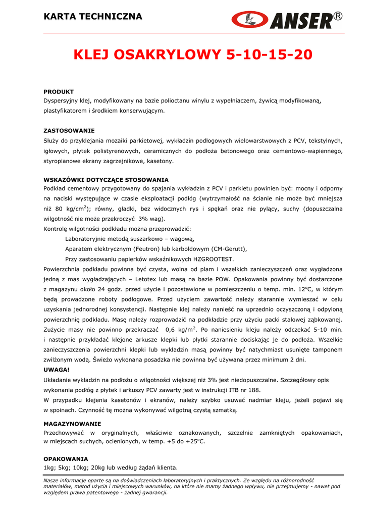 Klej osakrylowy 5-10-15-20 - karta techniczna