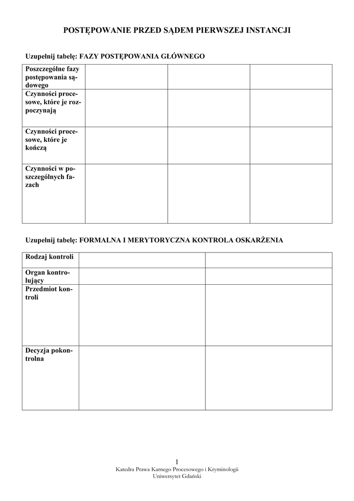 POSTĘPOWANIE PRZED SĄDEM PIERWSZEJ INSTANCJI Uzupełnij tabelę: FAZY POSTĘPOWANIA GŁÓWNEGO Poszczególne fazy postępowania sądowego Czynności procesowe, które je rozpoczynają Czynności procesowe, które je kończą Czynności w poszczególnych fazach Uzupełnij tabelę: FORMALNA I MERYTORYCZNA KONTROLA OSKARŻENIA Rodzaj kontroli Organ kontrolujący Przedmiot kontroli Decyzja pokontrolna 1 Katedra Prawa Karnego Procesowego i Kryminologii Uniwersytet Gdański Uzupełnij tabelę: FAZY ROZPRAWY GŁÓWNEJ Faza rozprawy głównej Czynności procesowe, które je rozpoczynają Czynności procesowe, które je kończą Czynności w poszczególnych fazach KAZUSY 1. Prezes Sądu Rejonowego w D. uznając, że akt oskarżenia zawiera braki formalne zwrócił go oskarżycielowi w celu ich usunięcia w terminie 7 dni. Oskarżyciel wprawdzie uzupełnił braki aktu oskarżenia, lecz wniósł go do sądu po upływie 10 dni. W świetle tego prezes sądu uznał wniesienie aktu oskarżenia za czynność bezskuteczną, z uwagi na przekroczenie terminu wskazanego w art. 337 § 1 k.p.k. i zarządzeniem zwrócił go oskarżycielowi wraz z aktami sprawy. Czy prezes sądu postąpił zgodnie z przepisami k.p.k.? 2. Prokurator wniósł do Sądu Rejonowego w B. akt oskarżenia przeciwko Karolowi F. oskarżonemu o popełnienie przestępstwa określonego w art. 278 § 1 k.k. Po sprawdzeniu warunków formalnych tego aktu oskarżenia stosownie do art. 337 § 1 k.p.k., Prezes Sądu Rejonowego w B. zwrócił prokuratorowi akt oskarżenia w trybie art. 337 k.p.k. celem określenia w nim (zgodnie z art. 332 § 1 pkt 2 k.p.k.) wysokości wyrządzonej szkody przez oskarżonego w wyniku przestępstwa. Prokurator przesłał ponownie do Sądu Rejonowego w B. akt oskarżenia bez uzupełnienia wskazanego w nim braku. W tej sytuacji Prezes Sądu wydał zarządzenie, w którym uznał – na podstawie art. 120 § 2 k.p.k. – akt oskarżenia za bezskuteczny, powiadamiając o jego treści strony. Na zarządzenie to prokurator na podstawie art. 337 § 2 k.p.k. wniósł zażalenie do Sądu Rejonowego w B. zarzucając obrazę art. 120 k.p.k., jako że art. 337 k.p.k. zdaniem skarżącego jest przepisem lex specialis w stosunku do art. 120 k.p.k. i w związku z tym nie może mieć zastosowania w przedmiotowej sytuacji. 2 Katedra Prawa Karnego Procesowego i Kryminologii Uniwersytet Gdański Proszę rozstrzygnąć zażalenie prokuratora i wskazać sposób w jaki powinien postąpić Prezes Sądu w przedmiotowej sytuacji. 3. Pokrzywdzony Jan T. działając na podstawie art. 55 § 1 k.p.k. wniósł w dniu 10 lipca 2009 r., po upływie 20 dni od doręczenia mu zawiadomienia o postanowieniu prokuratora o ponownym umorzeniu postępowania przygotowawczego, do Sądu Rejonowego w D. akt oskarżenia przeciwko Teresie G. zarzucając jej popełnienie przestępstwa z art. 278 § 1 k.k. Prezes Sądu Rejonowego badając w trybie art. 337 § 1 k.p.k. wymogi formalne stwierdził, iż w akcie oskarżenia brak jest wskazania sądu właściwego do rozpoznania sprawy oraz trybu postępowania, czego wymaga art. 332 § 1 pkt 5 k.p.k. W związku z tym Prezes zarządzeniem z dnia 17 lipca 2009 r. zwrócił akt oskarżenia Janowi T. i wezwał go do usunięcia powyższego braku w terminie 7 dni. Jan T. złożył zażalenie na zarządzenie Prezesa do Sądu Rejonowego w D. Powyższe zażalenie zostało utrzymane w mocy postanowieniem Sądu z dnia 20 sierpnia 2009 r., które zostało doręczone pokrzywdzonemu w dniu 28 sierpnia 2009 r. Jan T. wniósł ponownie uzupełniony akt oskarżenia w dniu 7 września 2009 r. W związku z tym Prezes na podstawie art. 339 § 3 k.p.k. przekazał sprawę Sądowi na posiedzenie, a ten umorzył postępowanie na podstawie art. 17 § 1 pkt 9 k.p.k. Jaki charakter ma termin określony w art. 337 § 1 k.p.k. w stosunku do oskarżyciela posiłkowego? W jakim terminie Jan T. powinien był usunąć braki aktu oskarżenia? Jak powinno nastąpić rozstrzygnięcie powyższej sprawy w razie niedotrzymania terminu do usunięcia braków? 4. W fazie przygotowania do rozprawy głównej prezes sądu doszedł do wniosku, że dla prawidłowego wyrokowania niezbędne jest rozszerzenia postępowania na czyny innych osób niepociągniętych do odpowiedzialności, których czyny pozostają w ścisłym związku z czynem opisanym w akcie oskarżenia. W świetle powyższego zwrócił oskarżycielowi akt oskarżenia w celu jego uzupełnienia. Jakie uchybienia zostały popełnione? Czy w tej fazie postępowania możliwy jest zwrot sprawy prokuratorowi w celu rozszerzenia na czyny osób niepociągniętych do odpowiedzialności karnej? Jeśli tak, to proszę przedstawić właściwy tryb postępowania. 5. Prokurator złożył w Sądzie Okręgowym w G. wniosek o umorzenie postępowania wobec Jarosława W. podejrzanego o popełnienie czynu zabronionego określonego w art. 148 § 1 k.k. z powodu jego niepoczytalności i orzeczenie wobec niego środka zabezpieczającego określonego w art. 94 § 1 k.k. Sąd po rozpoznaniu wniosku stwierdził, iż nie ma podstaw do umorzenia postępowania, jako że Jarosław W. w chwili czynu miał jedynie ograniczoną poczytalność. 3 Katedra Prawa Karnego Procesowego i Kryminologii Uniwersytet Gdański Jak powinien dalej postąpić sąd oraz jakiej treści wydać orzeczenie? Jak należy postąpić jeżeli sąd uznałby, iż istnieją jedynie podstawy do umorzenia postępowania, zaś nie ma podstaw do stosowania środków zabezpieczających? 6. Prokurator Rejonowy w G. skierował do Sądu Okręgowego w G., w oparciu o art. 324 § 1 k.p.k., wniosek o umorzenie postępowania wobec Pelagii K., która w stanie niepoczytalności wywołanej nagle ujawnioną chorobą psychiczną zabiła przy pomocy siekiery swojego męża Zenona K., i zastosowanie środka zabezpieczającego w postaci umieszczenia w zakładzie psychiatrycznym (art. 94 § 1 k.k.). Sąd orzekając w składzie jednego sędziego i dwóch ławników odmówił umorzenia 