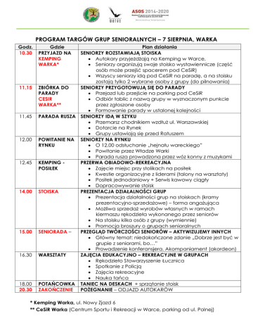 PROGRAM TARGÓW GRUP SENIORALNYCH – 7 SIERPNIA, WARKA Godz. 10.30 11.15 11.45 12.00 12.45 14.00 15.00 16.30 18.00 20.30 Gdzie PRZYJAZD NA KEMPING WARKA* Plan działania SENIORZY ROZSTAWIAJĄ STOISKA Autokary przyjeżdżają na Kemping w Warce, Seniorzy organizują swoje stoisko wystawiennicze (część osób może przejść spacerem pod CeSiR) Wszyscy seniorzy idą pod CeSiR na paradę, a na stoisku zostają tylko 2 wybrane osoby z grupy (do pilnowania) ZBIÓRKA DO SENIORZY PRZYGOTOWUJĄ SIĘ DO PARADY PARADY Przejazd lub przejście na parking pod CeSiR CESIR Odbiór tablic z nazwą grupy w wyznaczonym punkcie WARKA** przez zgłoszone osoby Formowanie parady w ustalonej kolejności PARADA RUSZA SENIORZY IDĄ W SZYKU Przemarsz chodnikiem wzdłuż ul. Warszawskiej Dotarcie na Rynek Grupy ustawiają się przed Ratuszem POWITANIE NA SENIORZY NA RYNKU RYNKU O 12.00 odsłuchanie „hejnału wareckiego” Powitanie przez Władze Warki Parada rusza prowadzona przez wóz konny z muzykami KEMPING PRZERWA OBIADOWO-REKREACYJNA POSIŁEK Zajęcie miejsc przy stolikach na posiłek Kwestie organizacyjne z liderami (talony na warsztaty) Posiłek jednodaniowy + Serwis kawowy ciągły Dopracowywanie stoisk STOISKA PREZENTACJA DZIAŁALNOŚCI GRUP Prezentacja działalności grup na stoiskach (kramy prezentacyjno-sprzedażowe) – forma angażująca Możliwa sprzedaż wyrobów własnych w ramach kiermaszu rękodzieła wykonanego przez seniorów Na stoisku kilka osób z grupy (wymiennie) Promocja broszury o grupach senioralnych SENIORADA – PRZEGLĄD TWÓRCZOŚCI SENIORÓW – AKTYWIZUJEMY INNYCH Główny temat: niedokończone zdanie „Dobrze jest być w grupie z seniorami, bo…” Prowadzenie konferansjera. Akompaniament (akordeon) WARSZTATY ZAJĘCIA EDUKACYJNO – REKREACYJNE W GRUPACH Rękodzieło Stowarzyszenie Łucznica Spotkanie z Policją Zajęcia rekreacyjne Nauka tańca POTAŃCOWKA TANIEC NA DESKACH + sprzątanie stoisk ZAKOŃCZENIE POŻEGNANIE – ODJAZD AUTOKARÓW * Kemping Warka, ul. Nowy Zjazd 6 ** CeSiR Warka (Centrum Sportu i Rekreacji w Warce, parking od ul. Polnej)