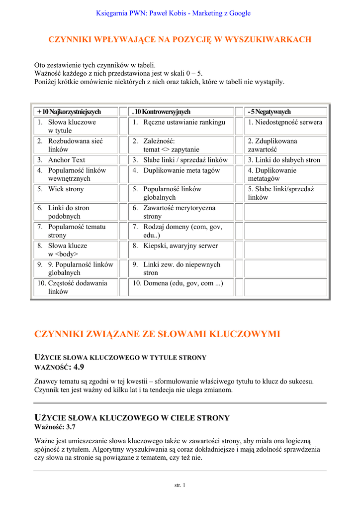 Księgarnia PWN: Paweł Kobis - Marketing z Google CZYNNIKI WPŁYWAJĄCE NA POZYCJĘ W WYSZUKIWARKACH Oto zestawienie tych czynników w tabeli. Ważność każdego z nich przedstawiona jest w skali 0 – 5. Poniżej krótkie omówienie niektórych z nich oraz takich, które w tabeli nie wystąpiły. + 10 Najkorzystniejszych 1. Słowa kluczowe w tytule 2. Rozbudowana sieć linków 3. Anchor Text 4. Popularność linków wewnętrznych 5. Wiek strony 6. Linki do stron podobnych 7. Popularność tematu strony 8. Słowa klucze w <body> 9. 9. Popularność linków globalnych 10. Częstość dodawania linków . 10 Kontrowersyjnych 1. Ręczne ustawianie rankingu - 5 Negatywnych 1. Niedostępność serwera 2. Zależność: temat <> zapytanie 3. Słabe linki / sprzedaż linków 4. Duplikowanie meta tagów 2. Zduplikowana zawartość 3. Linki do słabych stron 4. Duplikowanie metatagów 5. Słabe linki/sprzedaż linków 5. Popularność linków globalnych 6. Zawartość merytoryczna strony 7. Rodzaj domeny (com, gov, edu..) 8. Kiepski, awaryjny serwer 9. Linki zew. do niepewnych stron 10. Domena (edu, gov, com ...) CZYNNIKI ZWIĄZANE ZE SŁOWAMI KLUCZOWYMI UŻYCIE SŁOWA KLUCZOWEGO W TYTULE STRONY WAŻNOŚĆ: 4.9 Znawcy tematu są zgodni w tej kwestii – sformułowanie właściwego tytułu to klucz do sukcesu. Czynnik ten jest ważny od kilku lat i ta tendecja nie ulega zmianom. UŻYCIE SŁOWA KLUCZOWEGO W CIELE STRONY Ważność: 3.7 Ważne jest umieszczanie słowa kluczowego także w zawartości strony, aby miała ona logiczną spójność z tytułem. Algorytmy wyszukiwania są coraz dokładniejsze i mają zdolność sprawdzenia czy słowa na stronie są powiązane z tematem, czy też nie. str. 1 Powiązanie zawartości strony ze słowami kluczowymi Ważność: 3.4 Kolejna ważna kwestia. Zawartość strony nie musi być idealnie zgodna ze słowami kluczowymi, ale sprawdzane są też np. synonimy, pozwalające stwierdzić, czy strona na pewno traktuje o tym, o czym powinna. Słowa kluczowe w tagu <H1> Ważność: 3.4 Zależne od tematu strony oraz słowa zawartego między <H1> i </H1> . Jeśli masz strone o odkurzaczach i wpiszesz w tagu H1: Britney Spears – na pewno Ci to nie pomoże. Słowo kluczowe w nazwie domeny Ważność: 3 Używanie słów kluczowych w nazwie ma sens, jeśli oddzielimy je myślnikami. Z drugiej strony używanie zbyt wielu myślników może być zgubne. Najlepszą opcją jest całkowita zgodność słowa kluczowego oraz nazwy domeny. Słowo kluczowe w adresie URL (np. www.topseo.pl/słowo-kluczowe) Ważność: 2.8 Równie ważny czynnik, szczególnie jeśli chodzi o Yahoo. Zapewnia dobrą nawigację użytkownikom. Używaj myślników. Słowa kluczowe w tagach H2, H3, H(x) Ważność: 2.8 Drugi z najważniejszych czynników decydujący o pozycji strony. Może być czasami ważniejszy niż H1. Należy stosować go z rozwagą, gdyż źle umieszczony lub używany bez umiaru może zaszkodzić stronie. Słowa kluczowe zawarte tagach Alt i tytułach obrazków Ważność: 2.5 Bardzo ważne przy wyszukiwaniu obrazów, dużo mniej ważne przy wyszukiwaniu standardowym. Pogrubione słowa kluczowe (zawarte między <B> a </B> ) Ważność: 2.4 Podkreślenie owych słów i wyróżnienie ich z reszty tekstu może wskazać robotowi, że musi poświęcić więcej uwagi na analizę danego fragmentu. str. 2 Słowa kluczowe w tagu : Meta-Description Ważność: 1.2 Jedynie Yahoo bierze to szczególnie pod uwagę. Działa także na literówki – także Google się „da złapać” (gdy wpiszemy w tym tagu np. „Gogle” i użytkownik także popełni ten błąd przy wyszukiwaniu, jest szansa na dobrą pozycję). WŁAŚCIWOŚCI STRONY Ogólna popularność linków oraz stron linkujących do naszej Ważność: 4.5 Czyli liczba oraz jakość stron, które linkują do naszego serwisu i vice versa. Jeśli strony do których linkujemy są wartościowe, możemy liczyć na wzrost wartości PageRank strony. Wiek strony Ważność: 4 Wiek strony jest ważny, szczególnie jeśli strona ma mniej niż rok. Strona długo „wisząca” w sieci zyskuje zaufanie wyszukiwarek i lepszą pozycję w rankingu. Powiązanie tematyczne słów kluczowych i linków wewnętrznych Ważność: 3.9 W idealnym algorytmie powiązanie ma znaczenie. Dobre linki to dobry biznes pomagający w osiągnięciu lepszej pozycji. Częstość dodawania nowych linków Ważność: 3.5 Ważne jest, aby linkowanie to było naturalne, stopniowe, rozmieszczone w czasie. Prowadzenie strony w taki sposób może być bardzo korzystne. Powiązanie tematu strony z zapytaniem użytkownika Ważność: 3.2 Dobrym przykładem może być tutaj wikipedia, posiadająca wiele podstron. Jeśli użytkownik wprowadzi zapytanie, które jest w bazie wikipedii – będzie ona na jednej z czołowych pozycji. Czas spędzony na przeglądaniu strony, bezpośrednie wizyty, ... Ważność: 2.7 Coraz ważniejszy czynnik. Jedyna wątpliwość dotyczy tego, jak wyszukiwarki mają sprawdzać, co robi użytkownik na danej stronie. Google prowadzi badania w tym kierunku – gromadzi dane i próbuje je zrozumieć i interpretować. str. 3 Ręczne manipulowanie pozycją strony Ważność: 2.6 Ta praktyka zdarza się czasem w wyszukiwarce Google. Na ogół na korzyść danej strony. Niektórzy podają za przykład Wikipedię. Rozszerzenie nazwy domeny (edu, gov, us, com , ...) Ważność: 2.5 Jest jedna mała różnica pomiędzy wszystkimi domenami. Przyjmuje się, że zamysły użytkownika mogą być różne, jak i różne mogą być zawartości stron .gov i np. .go czy .tv. Jeśli użytkownik wyszukuje informacji dotyczących rządu, która domena będzie bardziej zaufaną dla niego? „rzad.gov.pl” czy „rzad.tv.pl” lub „rzad.friko.pl”? Częstość dodawania nowych podstron do serwisu Ważność: 2.5 Opinie na ten temat są podzielone. Jedni twierdzą, że dodawanie nowych podstron nic nie zmienia. Inni zaś, że zależy to od liczby tych stron i tematyki stro