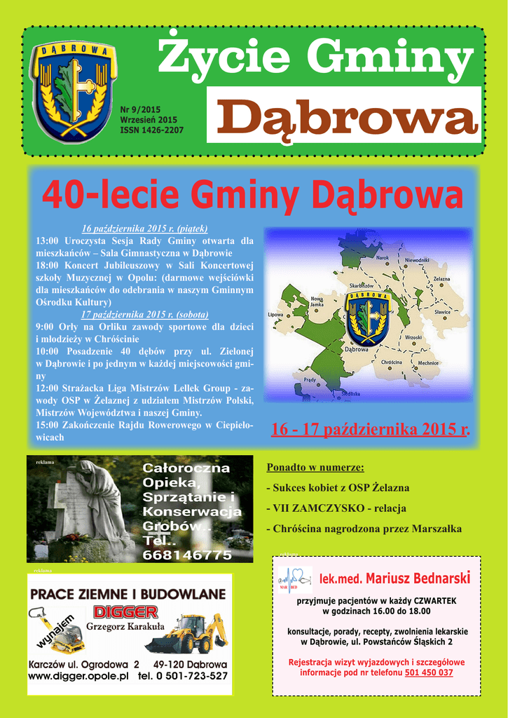 Życie Gminy Dąbrowa Nr 9/2015 Wrzesień 2015 ISSN 1426-2207 40-lecie Gminy Dąbrowa 16 października 2015 r. (piątek) 13:00 Uroczysta Sesja Rady Gminy otwarta dla mieszkańców – Sala Gimnastyczna w Dąbrowie 18:00 Koncert Jubileuszowy w Sali Koncertowej szkoły Muzycznej w Opolu: (darmowe wejściówki dla mieszkańców do odebrania w naszym Gminnym Ośrodku Kultury) 17 października 2015 r. (sobota) 9:00 Orły na Orliku zawody sportowe dla dzieci i młodzieży w Chróścinie 10:00 Posadzenie 40 dębów przy ul. Zielonej w Dąbrowie i po jednym w każdej miejscowości gminy 12:00 Strażacka Liga Mistrzów Lellek Group - zawody OSP w Żelaznej z udziałem Mistrzów Polski, Mistrzów Województwa i naszej Gminy. 15:00 Zakończenie Rajdu Rowerowego w Ciepielowicach reklama 16 - 17 października 2015 r. Ponadto w numerze: - Sukces kobiet z OSP Żelazna - VII ZAMCZYSKO - relacja - Chróścina nagrodzona przez Marszałka reklama reklama lek.med. Mariusz Bednarski przyjmuje pacjentów w każdy czwartek w godzinach 16.00 do 18.00 konsultacje, porady, recepty, zwolnienia lekarskie w Dąbrowie, ul. Powstańców Śląskich 2 Rejestracja wizyt wyjazdowych i szczegółowe informacje pod nr telefonu 501 450 037 Z ŻYCIA GMINY Newsletter Gminy Dąbrowa Zapraszamy do rekreacji Grafik zajęć na świetlicach Od połowy września w świetlicach w naszej gminie prowadzone są zajęcia pozaszkolne dla dzieci i młodzieży. Trójka opiekunek: Marta Łupak, Jadwiga Kozibroda oraz Justyna Misiek każdego dnia organizuje uczniom czas wolny oraz pomaga przy odrabianiu lekcji. Zajęcia w Naroku odbywają się od poniedziałku do piątku od 13:00 do 16:00. W Sławicach we wtorki i czwartki od 16:10 do 18:30, w Karczowie w tych samych godzinach, tyle że w poniedziałki i środy. Od 15:00 do 19:00 w poniedziałki czwartki i piątki prowadzone są zajęcia w Skarbiszowie, od 13:00 do 16:00 od poniedziałku do środy zapraszamy uczniów do świetlicy w Ciepielowicach, a od 16:00 do 19:00 we wtorki i środy do Nowej Jamki. Dwa razy w tygodniu planowane są także zajęcia w Prądach i Siedliskach. Wycieczka w Góry Stołowe Gminny Ośrodek Kultury i Rekreacji w Dąbrowie zaprasza chętnych na autokarową wycieczkę z przewodnikiem w Góry Stołowe w dniu 10 października 2015 r. W programie: labirynt skalny Błędne Skały, Kaplica Czaszek w Czermnej, Kudowa Zdrój wraz z parkiem zdrojowym, Muzeum Papiernictwa. Koszt wyjazdu 55zł od osoby (wraz z biletami wstępu). Informacje i zapisy w GOKiR Dąbrowa tel.77/464-10-10 wew. 213 lub elektronicznie: [email protected] Gminny Rajd Rowerowy GOKiR w Dąbrowie zaprasza miłośników rowerów na Gminny Rajd Rowerowy, który odbędzie się w sobotę 17 października z okazji 40-lecia Gminy Dąbrowa. Wszystkich chętnych: dzieci, młodzież, dorosłych i całe rodziny zapraszamy do przyjazdu gminnymi ścieżkami rowerowymi na godzinę 15.00 na teren rekreacyjno-sportowy w Ciepielowicach. W programie przewidujemy: ognisko, gry i zabawy. Dojazd z najdalszego punktu naszej gminy to tylko 12 km! Zapraszamy! (r) reklama Elastyczna pożyczka Wygodne raty Zadzwoń 600 400 288 Provident Polska (opłata wg taryfy operatora) Podsumowanie wakacji Wakacje w świetlicach Zakończyły sie wakacje a wraz z nimi zakończyły się wakacyjne zajęcia w świetlicach. W bieżącym roku funkcjonowały w 9 miejscowościach - Narok, Niewodniki, Karczów, Skarbiszów. Ciepielowice, Nowa Jamka, Prądy, Siedliska i Sławice. Zgromadziły około 60 podopiecznych. Program świetlicowy został zaplanowany tak, aby umożliwić dzieciom aktywne spędzenie czasu. Organizowane były zajęcia ruchowe, teatralne, taneczne, muzyczne, plastyczne, kulinarne oraz wycieczki rowerowe. Wiele radości i wspomnień pozostawiły wspólne ogniska i spotkania. Dzieci z różnych miejscowości miały możliwość spotkania się i zawarcia nowych znajomości oraz wspólnego uczestniczenia w grach i zabawach. W Naroku i Skarbiszowie dzieci brały udział w warsztatach teatralnych zorganizowanych przez GOKIR. Podczas tych zajęć dzieci przełamywały swoje nieśmiałości i miały możliwość poznać tajniki pracy aktora. Dużo zwolenników miały wycieczki rowerowe organizowane w Naroku i zajęcia kulinarne w Skarbiszowie. Świetlice cieszyły się dużym zainteresowaniem, zarówno ze strony rodziców jak i dzieci. Marta Łupak ŻYCIE GMINY DĄBROWA OSP Wicemistrzostwo Polski w Krajowych Zawodach Sportowo-Pożarniczych OSP Ogromny sukces kobiecej drużyny pożarniczej OSP Żelazna W skali kraju nie ma drugiej takiej jednostki jak Kobieca Drużyna Pożarnicza z OSP Żelazna, która trzy razy z rzędu wywalczyła wicemistrzostwo Polski w Krajowych Zawodach Sportowo-Pożarniczych Ochotniczych Straży Pożarnych (2007 r. Płock, 2011 r. Konin, 2015 r. Polanica-Zdrój). Należy podkreślić, że zawody odbywają się co 4 lata, a skład drużyny ulegał zmianie. Do XIV Krajowych Zawodów Sportowo-Pożarniczych Ochotniczych Straży Pożarnych, które odbyły się w dniach 4-6 września 2015r. w PolanicyZdroju zakwalifikowały się cztery drużyny OSP z woj. opolskiego: w kat. A - drużyny męskie: OSP Raszowa - powiat strzelecki oraz OSP Łomnica - powiat oleski; w kat. C - drużyny kobiece: OSP Żelazna - powiat opolski oraz OSP Raszowa - powiat strzelecki. Kobieca Drużyna Pożarnicza z OSP w Żelaznej całe wakacje poświęciła na przygotowania do krajowych zawodów sportowo-pożarniczych. Dwa treningi sztafety tygodniowo i trzy bojówki. W międzyczasie drużyna ćwiczyła także musztrę, która została wprowadzona jako dodatkowa, obowiązkowa konkurencja podczas zawodów. Ciężko było pogodzić życie rodzinne i pracę z treningami. „Starałyśmy się zorganizować treningi tak, CZERWIEC WRZESIEŃ żeby każdej z nas one pasowały, ale nie zawsze się to udawało, bo przecież prawie każda zawodniczka pracuje, ma rodzinę, małe dzieci.” Nad wszystkim czuwała Lidia Baldy, która poświęciła mnóstwo swojego,