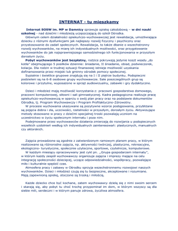 INTERNAT - tu mieszkamy Internat SOSW im. MP w Damnicy sprawuje opiekę całodobową – w dni nauki szkolnej - nad dziećmi i młodzieżą uczęszczającą do szkół Ośrodka. Głównym celem działalności opiekuńczo-wychowawczej jest rewalidacja, umożliwiająca dziecku z różnymi dysfunkcjami jak najlepszy rozwój fizyczny i psychiczny oraz przystosowanie do zadań społecznych. Rewalidacja, to także dbanie o wszechstronny rozwój wychowanków, na miarę ich indywidualnych możliwości, oraz przygotowanie wychowanków do jak najsprawniejszego samodzielnego ich funkcjonowania w przyszłym dorosłym życiu. Pobyt wychowanków jest bezpłatny, rodzice pokrywają jedynie koszt wsadu „do kotła” obejmującego 5 posiłków dziennie: śniadanie, II śniadanie, obiad, podwieczorek, kolacja. Dla rodzin w trudnej sytuacji finansowej istnieje możliwość uzyskania dofinansowania przez miejski lub gminny ośrodek pomocy społecznej. Sypialnie i świetlice grupowe znajdują się na I i II piętrze budynku. Podopieczni podzieleni są na 6-8 osobowe grupy wychowawcze. Sale poszczególnych grup są kolorowe i przytulne, wyposażone w sprzęt audiowizualny, zabawki i gry dydaktyczne. Dzieci i młodzież mają możliwość korzystania z: pracowni gospodarstwa domowego, pracowni komputerowej, siłowni i sali gimnastycznej. Kadra pedagogiczna realizuje pracę opiekuńczo-wychowawczą w oparciu o swój plan pracy oraz na podstawie dokumentów Ośrodka, tj. Program Wychowawczy i Program Profilaktyczno-Zdrowotny. W procesie wychowania ukazywane są pozytywne wzorce postępowania, przybliżane są pojęcia dobra i zła, uczciwości, rzetelności w przyszłym, dorosłym życiu. Aktywizujące metody stosowane w pracy z dziećmi specjalnej troski pozwalają uczniom na uczestnictwo w życiu społecznym internatu i poza nim. Podejmowane przez wychowawców działania zmierzają do rozwijania u podopiecznych wszelkich uzdolnień według ich indywidualnych zainteresowań: plastycznych, manualnych czy aktorskich. Zajęcia prowadzone są zgodnie z zatwierdzonym ramowym planem pracy, w którym realizowane są różnorodne zajęcia, np. aktywności twórczej, plastyczne, rekreacyjne, ekologiczno- turystyczne, społecznie użyteczne, sportowe, czytelnicze, komputerowe. W każdym miesiącu opracowywany jest cykl pn. ,,Grupa gospodarzem internatu”, w którym każdy zespół wychowawczy organizuje zajęcia i imprezy mające na celu integrację społeczności dziecięcej, uczące odpowiedzialności, współpracy, pozwalające miło i kulturalnie spędzić czas. Atmosfera pracy i zabawy w Ośrodku sprzyja wszechstronnemu rozwojowi naszych wychowanków. Dzieci i młodzież czują się tu bezpieczne, akceptowane i rozumiane. Mają zapewnioną opiekę, otoczone są troską i miłością. Każde dziecko chce być kochane, zatem wychowawcy dzielą się z nimi swoim sercem i starają się, aby pobyt tu choć trochę przypominał im dom, w którym wszyscy są dla siebie mili, serdeczni i w którym panuje zdrowa, życzliwa atmosfera.