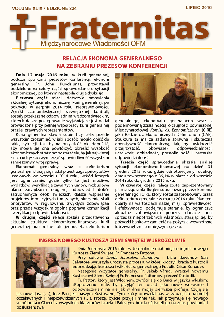 lipiec 2016 VOLUME XLIX • EDIZIONE 234 Fraternitas Międzynarodowe Wiadomości OFM Relacja Ekonoma generalnego na zebraniu Prezesów konferencji Dnia 12 maja 2016 roku, w kurii generalnej, podczas spotkania prezesów konferencji, ekonom generalny, Fr. John Puodziunas, przedstawił podzielone na cztery części sprawozdanie o sytuacji ekonomicznej, po którym nastąpiła długa dyskusja. Pierwsza część relacji dotyczyła omówienia aktualnej sytuacji ekonomicznej kurii generalnej, po odkryciu, w sierpniu 2014 roku, nieprawidłowości. Wyniki czteromiesięcznej wewnętrznej kontroli, zostały przekazane odpowiednim władzom świeckim, których dalsze postępowanie wyjaśniające jest nadal prowadzone przy pełnej współpracy kurii generalnej oraz jej prawnych reprezentantów. Kuria generalna stawia sobie trzy cele: przede wszystkim zrozumieć, w jaki sposób mogło dojść do takiej sytuacji, tak, by na przyszłość nie dopuścić, aby mogła się ona powtórzyć; określić wysokość ekonomicznych strat oraz postarać się, by jak najwięcej z nich odzyskać; wymierzyć sprawiedliwość wszystkim zamieszanym w tę sprawę. Ekonomat generalny wraz z definitorium generalnym starają się nadal przestrzegać priorytetów ustalonych we wrześniu 2014 roku, wśród których jest ograniczanie, gdzie tylko to jest możliwe, wydatków, weryfikacja zawartych umów, rozbudowa planu zarządzania długiem, odpowiedni dobór zatrudnionych osób świeckich, dalsze wspieranie projektów formacyjnych i misyjnych, określenie skali priorytetów w regulowaniu zwykłych zobowiązań oraz przede wszystkim ogólna poprawa komunikacji i weryfikacji odpowiedzialności. W drugiej części relacji została przedstawiona aktualna struktura ekonomiczno-finansowa kurii generalnej oraz różne role jednostek, definitorium generalnego, ekonomatu generalnego wraz z podejmowaną działalnością; o czujności powierzonej Międzynarodowej Komisji ds. Ekonomicznych (CIRE) jak i Radzie ds. Ekonomicznych Definitorium (CAE). Struktura ta ma za zadanie sprawną i skuteczną operatywność ekonomiczną, tak, by uwidocznić przejrzystość, obowiązek odpowiedzialności, uczciwość, dokładność, prostolinijność i braterską odpowiedzialność. Trzecia część sprawozdania ukazała analizę sytuacji ekonomiczno-finansowej na dzień 31 grudnia 2015 roku, gdzie odnotowujemy redukcję długu zewnętrznego o 39,1% w okresie od września 2014 roku do grudnia 2015 roku. W czwartej części relacji został zaprezentowany plan zarządzania długiem, opracowany przez ekonoma generalnego i CIRE, który został zaaprobowany przez definitorium generalne w marcu 2016 roku. Plan ten, oparty na wartościach naszej misji, sprawiedliwości i efektywności, podejmuje staranie, by ograniczyć aktualne zobowiązania poprzez donacje oraz sprzedaż niepotrzebnych własności, starając się, by pożyczki bankowe zamienić na pożyczki wewnętrzne lub zewnętrzne o mniejszym ryzyku. Ingres nowego kustosza Ziemi Świętej w Jerozolimie Dnia 6 czerwca 2016 roku w Jerozolimie miał miejsce ingres nowego Kustosza Ziemi Świętej Fr. Francesco Pattona. Przy śpiewie Lauda Jerusalem Dominum i biciu dzwonów San Salvatore wyruszyła uroczysta procesja, w której kroczyli bracia z kustodii poprzedzając kustosza i wikariusza generalnego Fr. Julio César Bunader. Następnie wizytator generalny, Fr. Jakab Várnai, wręczył nowemu Kustoszowi Ziemi Świętej Fr. Francesco Pattonowi pieczęć Kustodii. Fr. Patton, który jest Włochem, zwrócił się do Braci w języku włoskim: «Poproszono mnie, by przyjąć ten urząd jako nowe wezwanie i odpowiedziałem na nie jak w dniu mojej pierwszej profesji. Czuję się jak nowicjusz (…), lecz Pan jest naszym Kustoszem, Tym, który prowadzi nas w sytuacjach najmniej oczekiwanych i nieprzewidzianych (…). Proszę, byście przyjęli mnie tak, jak przyjmuje się nowego współbrata.» Obecni z wszystkich klasztorów Izraela i Palestyny bracia uścisnęli go na znak powitania i posłuszeństwa. INNE WIADOMOŚCI Rzym, kuria generalna - Spotkanie komisji liturgicznej 2016 Oby cierpienie, które dotyka imigrantów, desperacja wypisana na ich obliczach, przez wzgląd na miłosierdzie i bycie mniejszymi, skłoniły nas do okazania im współczucia. Pierwsza rocznica ogłoszenia Laudato si’ F R A T E R N I T A S - W W W . O F M . O R G Kłajpeda - Franciszkanie z Litwy dla “paraolimpiady” W dniach 31 maja – 1 czerwca 2016 roku w naszej kurii generalnej w Rzymie zebrała się komisja liturgiczna, której przewodniczy Fr. Sandro Overend. Powołana w 2010 roku, przez ostatnie lata pracowała na opracowaniem pierwszej części projektu: redakcją Mszału Franciszkańskiego; Lekcjonarza i Modlitwy wiernych; Proprium do Franciszkańskiej Liturgii Godzin; Rytuału Franciszkańskiego; Martirologium Franciszkańskiego. Ponadto, członkowie komisji wymienili się uwagami i sugestiami odnoszących się do korekty tekstów Mszału Franciszkańskiego; Lekcjonarza i Modlitwy wiernych. Wszystkie teksty są już niemal gotowe: pozostaje dokończenie prac redakcyjnych i ujednolicenie różnych formularzy. Prace planuje ukończyć się do października 2016 roku. Następnie przygotowany w języku łacińskim materiał zostanie przedstawiony Kongregacji ds. Kultu Bożego i Dyscypliny Sakramentów. Augustas Navickas, który był dobrze zapowiadającym się wioślarzem, uległ wypadkowi i jego “marzenia o sukcesie” przepadły! Jednak... Otrzymał zaproszenie do uczestnictwa w “paraolimpiadzie” w Brazylii. Bracia franciszkanie kupili specjalnie zaprojektowane dla osób niepełnosprawnych kajak oraz wiosła i ofiarowali je zawodnikowi. Teraz “marzenie” stało się realne. Miasto Kłajpeda (Litwa), od kiedy odbyły się w nim czwarte międzynarodowe zawody wioślarskie, stało się miastem nadziei, powiedział Fr. Benediktas Jurcys. 18 czerwca minęła pierwsza rocznica wydania encykliki papieża Franciszka w trosce o