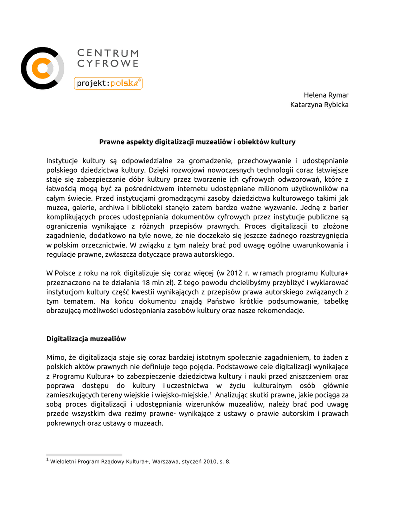 Helena Rymar Katarzyna Rybicka Prawne aspekty digitalizacji muzealiów i obiektów kultury Instytucje kultury są odpowiedzialne za gromadzenie, przechowywanie i udostępnianie polskiego dziedzictwa kultury. Dzięki rozwojowi nowoczesnych technologii coraz łatwiejsze staje się zabezpieczanie dóbr kultury przez tworzenie ich cyfrowych odwzorowań, które z łatwością mogą być za pośrednictwem internetu udostępniane milionom użytkowników na całym świecie. Przed instytucjami gromadzącymi zasoby dziedzictwa kulturowego takimi jak muzea, galerie, archiwa i biblioteki stanęło zatem bardzo ważne wyzwanie. Jedną z barier komplikujących proces udostępniania dokumentów cyfrowych przez instytucje publiczne są ograniczenia wynikające z różnych przepisów prawnych. Proces digitalizacji to złożone zagadnienie, dodatkowo na tyle nowe, że nie doczekało się jeszcze żadnego rozstrzygnięcia w polskim orzecznictwie. W związku z tym należy brać pod uwagę ogólne uwarunkowania i regulacje prawne, zwłaszcza dotyczące prawa autorskiego. W Polsce z roku na rok digitalizuje się coraz więcej (w 2012 r. w ramach programu Kultura+ przeznaczono na te działania 18 mln zł). Z tego powodu chcielibyśmy przybliżyć i wyklarować instytucjom kultury część kwestii wynikających z przepisów prawa autorskiego związanych z tym tematem. Na końcu dokumentu znajdą Państwo krótkie podsumowanie, tabelkę obrazującą możliwości udostępniania zasobów kultury oraz nasze rekomendacje. Digitalizacja muzealiów Mimo, że digitalizacja staje się coraz bardziej istotnym społecznie zagadnieniem, to żaden z polskich aktów prawnych nie definiuje tego pojęcia. Podstawowe cele digitalizacji wynikające z Programu Kultura+ to zabezpieczenie dziedzictwa kultury i nauki przed zniszczeniem oraz poprawa dostępu do kultury i uczestnictwa w życiu kulturalnym osób głównie zamieszkujących tereny wiejskie i wiejsko-miejskie. 1 Analizując skutki prawne, jakie pociąga za sobą proces digitalizacji i udostępniania wizerunków muzealiów, należy brać pod uwagę przede wszystkim dwa reżimy prawne- wynikające z ustawy o prawie autorskim i prawach pokrewnych oraz ustawy o muzeach. 1 Wieloletni Program Rządowy Kultura+, Warszawa, styczeń 2010, s. 8. Instytucjom kultury nie udało się jak dotąd opracować spójnych i powszechnie stosowanych standardów i procedur prawnych związanych z realizacją procesu digitalizacyjnego. Grupa ekspertów ds. digitalizacji (NIMOZ) przy Narodowym Instytucie Dziedzictwa podkreśla ten problem w „Zaleceniach dotyczących planowania i realizacji projektów digitalizacyjnych w muzealnictwie2 (dalej: „Zalecenia”), czyli dokumencie wyznaczającym standardy i procedury mające na celu wspieranie wdrażania i rozwijanie procesów digitalizacyjnych w muzeach. Autorzy „Zaleceń” wskazują, iż istnieje silna potrzeba jednoznacznej interpretacji przepisów prawnych w odniesieniu do nowo stosowanych technologii i związanych z nimi działań. Instytucje prowadzące bowiem prace digitalizacyjne potrzebują pewności co do zgodności z prawem swoich działań. Jednocześnie stwierdzają, że “wobec wątpliwości, czy wykonywane wizerunki cyfrowe są utworem autorskim, czy nie (np. skany), należy rozstrzygać raczej na tak i konstruować umowy z wykonawcami na podstawie takiego założenia.” 3 Czynią to przy tym wyłącznie w kontekście regulowania relacji z wykonawcami digitalizacji. Taka argumentacja jest zrozumiała z perspektywy zapewnienia instytucji publicznej maksymalnej pewności, co do stanu prawnego posiadanych przez nią zasobów. Nie jest natomiast zgodna z przepisami prawa autorskiego, gdyż nie spełnia przesłanek, jakie są wymogiem, aby nadać ochronę wytworowi pracy ludzkiej. Pomija także prawa użytkowników w dostępie do twórczości innych, wynikające z interesu publicznego i kultury jako dobra wspólnego. To szczególnie istotne ze względu na misję społeczną, do jakiej zostały powołane instytucje publiczne odpowiedzialne za dostęp do kultury. Innym ważnym elementem jest tutaj ochrona domeny publicznej, która w wyniku zbyt szerokiej interpretacji utworu w prawie autorskim ogranicza swobodę użytkowników. Zakaz licencjonowania domeny publicznej jest także jednym z podstawowych postulatów Manifestu Domeny Publicznej przygotowanego przez sieć tematyczną -Communia- założoną przez Komisję Europejską. W rezultacie stosowanie „Zaleceń” i traktowanie digitalizacji jako procesu twórczego prowadzi do absurdalnej sytuacji, w której dzieła będące utworem są obejmowane monopolem autorskim osoby, która dokonuje czynności technicznej jaką jest digitalizacja a następnie muzeum nabywa od niej prawa do dysponowania dziełem. „Zalecenia” NIMOZ jak sama nazwa wskazuje są jedynie rekomendacją i nie są wiążące prawnie. Z drugiej strony są też jedynym źródłem informacji o prawnych aspektach digitalizacji dotyczącej muzealiów i jako jeden z niewielu dokumentów na ten temat są niewątpliwie wskazówką dla instytucji kultury, jak postępować w praktyce. Digitalizacja a wizerunek muzealiów. Jak wynika z „Zaleceń” NIMOZ, procesem digitalizacji nazywa się zestaw czynności, które prowadzą do przetworzenia rzeczywistego obiektu (wartości analogowej) w tzw. 2 „Zalecenia dotyczące planowania i realizacji projektów digitalizacyjnych w muzealnictwie” NIMOZ, red. Daniela Galas, Warszawa 2011. 3 Ibidem, s. 6 wizerunek/obraz cyfrowy, czyli plik zawierający cyfrowe odwzorowanie obiektu. 4 Na to działanie składają się czynności takie jak: skanowanie, czyli zapis wizerunku w postaci dwuwymiarowej (2D – najczęściej utrwalenie za pomocą aparatu cyfrowego lub skanera) oraz trójwymiarowej (3D – najczęściej skanowanie 3D lub system fotografii dookólnej), przetwarzanie i analiza danych (wyznaczanie istotnych parametrów) oraz wizualizacja 2D lub 3D, czyli tworzenie wizerunków cyfr
