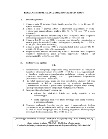 REGULAMIN ROZLICZANIA KOSZTÓW ZUŻYCIA WODY I. Podstawy prawne: 1. Ustawa z dnia 23 kwietnia 1964r. Kodeks cywilny (Dz. U. Nr 16, poz. 93 z późn. zmianami), 2. Ustawa z dnia 7 czerwca 2001r. o zbiorowym zaopatrzeniu w wodę i zbiorowym odprowadzaniu ścieków (Dz. U. Nr 72, poz. 747 z późn. zmianami), 3. Rozporządzenie Ministra Infrastruktury z dnia 14 stycznia 2002r. w sprawie określenia przeciętnych norm zużycia wody (Dz. U. Nr 8, poz. 70), 4. Ustawa z dnia 21 czerwca 2001r. o ochronie praw lokatorów, mieszkaniowym zasobie gminy i o zmianie Kodeksu cywilnego (tekst jednolity Dz. U. z 2005r., Nr 31, poz. 266 z późn. zmianami), 5. Ustawa z dnia 24 czerwca 1994r. o własności lokali (tekst jednolity Dz. U. z 2000r., Nr 80, poz. 903 z późn. zmianami), 6. Rozporządzenie Ministra Infrastruktury z dnia 12 kwietnia 2002r. w sprawie warunków technicznych, jakim powinny odpowiadać budynki i ich usytuowanie (Dz. U. Nr 75, poz. 690) II. Postanowienia ogólne: § 1. 1. Postanowienia niniejszego Regulaminu mają zastosowanie do wszystkich budynków administrowanych przez ZBM I TBS Sp. z o.o., wyposażonych w instalację wodociągowo-kanalizacyjną posiadającą zbiorcze urządzenia pomiarowe (wodomierz główny) oraz opomiarowanie indywidualne (wodomierze lokalowe - podliczniki). 2. Za lokal opomiarowany, uważa się lokal mieszkalny, użytkowy lub inne pomieszczenie, w którym zamontowane są urządzenia pomiarowe ( wodomierze lokalowe - podliczniki) rejestrujące zużycie wody zimnej i ciepłej wszystkich punktów czerpalnych występujących w lokalu. 3. Przez „użytkownika lokalu” rozumie się: najemcę lub właściciela lokalu oraz osoby wspólnie z nim zamieszkujące, osoby zajmujące lokal bez tytułu prawnego oraz osoby wspólnie z nimi zamieszkujące, 4. Okresowe rozliczanie kosztów zużycia wody i odprowadzenia ścieków przeprowadza się po zakończeniu każdego roku kalendarzowego w terminie do dnia 31 marca następnego roku, za pomocą programów informatycznych przyjętych do stosowania przez ZBM I TBS Sp. z o.o „Zakładając wodomierz lokalowy – podlicznik oszczędzasz wodę i masz kontrolę nad jej zużyciem. Koszt zakupu to około 120,00 zł + 20,00 zł za plombowanie. W celu dokładniejszych informacji zapraszamy do Rejonów Obsługi Mieszkańców” 5. Użytkownik zarówno lokalu opomiarowanego, jak i nieopomiarowanego, w czasie między okresowymi rozliczeniami, wnosi miesięczne zaliczki z tytułu zużycia wody i odprowadzenia ścieków wg zasad określonych w niniejszym regulaminie. 6. Nadwyżka lub niedopłata wynikająca z okresowego rozliczenia uwzględniana będzie wg następujących zasad: nadwyżka podlega przeksięgowaniu ( z zastrzeżeniem pkt.9) na poczet bieżących opłat za używanie lokalu, niedobór zostaje zaksięgowana na konto opłat za lokal i po otrzymaniu informacji o jej wysokości, użytkownik lokalu wnosi ją w terminie najbliższej opłaty miesięcznej za użytkowanie lokalu. 7. W uzasadnionych przypadkach, na wniosek użytkownika lokalu, Zarząd Spółki może wyrazić zgodę na wniesienie niedopłaty w miesięcznych ratach. 8. W przypadku użytkowników zadłużonych, nadpłatę zalicza się na poczet zadłużenia z tytułu należności za używanie lokalu. 9. W przypadku zmiany użytkownika lokalu w okresie rozliczeniowym nowy użytkownik lokalu w ramach rozliczenia ponosi opłaty proporcjonalnie do okresu użytkowania lokalu. 10. Zwalnia się od opłat osoby zamieszkałe w lokalu nieopomiarowanym, w przypadku wcześniejszego zgłoszenia o nieobecności, która trwać będzie ponad dwa m-ce. 11. Wszelkie zmiany ilości osób mające wpływ na wymiar opłat, zgłoszone do Spółki, będą uwzględniane od 1-go dnia następnego miesiąca po dokonaniu takiego zgłoszenia. 12. Odczyty liczników zamontowanych na instalacji ciepłej wody będą podstawą do rozliczania ilości zużytej do podgrzania wody. 13. W budynkach, w których znajdują się lokale opomiarowane i nieopomiarowane, a wstępuje duże zużycie wody – wówczas lokale nieopomiarowane zostaną obciążone do 9m³/osobę, a reszta niedoboru zostanie rozdzielona proporcjonalnie do zużycia. 14. Zainstalowane w lokalach wodomierze lokalowe - podliczniki traktowane są jako podzielniki kosztów. W budynkach, w których wszystkie lokale wyposażone są w podliczniki, a suma zużycia wody według ich wskazań nie pokrywa się z ilością wskazaną przez wodomierz główny, różnica rozliczona zostanie proporcjonalnie do zużycia. 15. Ilość pobranej wody ustala się na podstawie wskazań licznika, a ilość odprowadzonych ścieków równa jest ilości zużytej wody w budynkach wyposażonych w instalację kanalizacyjną jak i w szamba. § 2. 16. Przez cenę wody rozumie się opłatę za wodę pobieraną z urządzeń zbiorowego zaopatrzenia w wodę i za ścieki wprowadzane do zbiorczych urządzeń kanalizacyjnych, zgodnie z Uchwałą Rady Miejskiej w Gliwicach. 17. W przypadku zbiorczego urządzenia pomiarowego ( wodomierz główny) okresowe rozliczenie kosztów odbywa się na podstawie faktur obciążeniowych wystawionych przez Dostawcę wody. III. Zasady odczytów wodomierzy i rozliczeń w lokalach opomiarowanych § 3. 1. Od momentu zaplombowania zainstalowanego podlicznika, ustalona zostaje miesięczna zaliczka, za porozumieniem stron. Zaliczka podlegać będzie rozliczeniu raz w roku. Rozliczenie oraz ustalenie zaliczki na kolejny rok dla poszczególnych lokali nastąpi w oparciu o wcześniejsze wskazania podliczników. 2. Użytkownik ma prawo do zmiany zaliczki w ciągu roku rozliczeniowego w przypadku ewidentnych zmian zużycia wody spowodowanych jego sytuacją rodzinną. Zmianą wielkości zużycia wody użytkownik lokalu winien zgłosić w ROM-ie osobiście lub telefonicznie. Zmiana wprowadzona zostanie od 1-go dnia m-ca następnego . 3. Na żądanie zarządcy użytkownik podaje odczyt liczników conajmniej 4 raz w roku oraz każdorazowo w przypadku zmiany cen. 