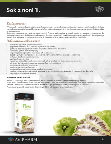 Sok z noni 1l. Zastosowanie: W owocach Noni znajdują się witaminy A i E oraz witaminy z grupy B, a także potas, sód, magnez i wapń oraz błonnik. Poza tym to bogactwo związków polifenolowych, które mają duże znaczenie w profilaktyce antynowotworowej. Działają także przeciwzapalnie. Sok z noni, nazywany jest „aspiryną starożytności”. Posiada wiele cudownych właściwości , to preparat przeznaczony dla osób potrzebujących dodatkowych sił i energii. Podnosi odporność, dzięki czemu przywraca witalność. Sok wspomaga metabolizm, wpływać pozytywnie na kondycję skóry i włosów, a także zmniejszać dokuczliwe bóle. Własciwosci soku z noni: • • • • • • • • • • • • • • • wzmacnia organizm, podnosi witalność, poprawia umysłową oraz fizyczną wydajność organizmu, pokrywa dzienne zapotrzebowanie organizmu na składniki mineralne, wzmacnia system immunologiczny, wspomaga rozwój mięśni i zapobiega ich osłabieniu, zapobiega huśtawce nastrojów, zawiera melatoninę oraz hormon szczęścia- serotoninę wykazuje działanie przeciwzapalne; działa antyoksydacyjne; nadzoruje podział komórek, może ogrywać rolę w profilaktyce chorób nowotworowych, eliminuje dolegliwości związane z nieprawidłowym trawieniem, zmniejsza dolegliwości alergiczne; zmniejsza ryzyko zawału serca, zmniejsza bóle w wyniku stanów zapalnych i urazów, działa rozkurczowo na naczynia krwionośne, a ponadto zmniejsza skłonność do tworzenia się skrzepów, regulujące nadciśnienie tętnicze. Pojemność netto: 1000 ml. Noni 100% czystego soku z owoców noni. Bez konserwantów. Zawiera naturalnie występujące cukry. Skład: sok z owoców noni. Przed użyciem wstrząsnąć. Osad jest zjawiskiem naturalnym. Sok może się nieznacznie różnić kolorem i smakiem w zależności od partii. Po otwarciu spożyć w ciągu 21 dni, przechowywać w lodówce. Proponowany sposób podania: 2x dziennie po 25 ml pół godziny przed posiłkiem 14