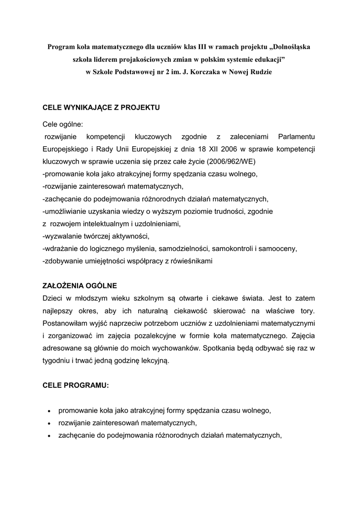 Program koła matematycznego dla uczniów klas III w ramach projektu „Dolnośląska szkoła liderem projakościowych zmian w polskim systemie edukacji” w Szkole Podstawowej nr 2 im. J. Korczaka w Nowej Rudzie CELE WYNIKAJĄCE Z PROJEKTU Cele ogólne: rozwijanie kompetencji kluczowych zgodnie z zaleceniami Parlamentu Europejskiego i Rady Unii Europejskiej z dnia 18 XII 2006 w sprawie kompetencji kluczowych w sprawie uczenia się przez całe życie (2006/962/WE) -promowanie koła jako atrakcyjnej formy spędzania czasu wolnego, -rozwijanie zainteresowań matematycznych, -zachęcanie do podejmowania różnorodnych działań matematycznych, -umożliwianie uzyskania wiedzy o wyższym poziomie trudności, zgodnie z rozwojem intelektualnym i uzdolnieniami, -wyzwalanie twórczej aktywności, -wdrażanie do logicznego myślenia, samodzielności, samokontroli i samooceny, -zdobywanie umiejętności współpracy z rówieśnikami ZAŁOŻENIA OGÓLNE Dzieci w młodszym wieku szkolnym są otwarte i ciekawe świata. Jest to zatem najlepszy okres, aby ich naturalną ciekawość skierować na właściwe tory. Postanowiłam wyjść naprzeciw potrzebom uczniów z uzdolnieniami matematycznymi i zorganizować im zajęcia pozalekcyjne w formie koła matematycznego. Zajęcia adresowane są głównie do moich wychowanków. Spotkania będą odbywać się raz w tygodniu i trwać jedną godzinę lekcyjną. CELE PROGRAMU: promowanie koła jako atrakcyjnej formy spędzania czasu wolnego, rozwijanie zainteresowań matematycznych, zachęcanie do podejmowania różnorodnych działań matematycznych, umożliwianie uzyskania wiedzy o wyższym poziomie trudności, zgodnie z rozwojem intelektualnym i uzdolnieniami, wyzwalanie twórczej aktywności, wdrażanie do logicznego myślenia, samodzielności, samokontroli i samooceny, zdobywanie umiejętności współpracy z rówieśnikami. wyrobienie nawyku obserwacji, eksperymentowania, samodzielnego poszukiwania i zdobywania informacji świadome korzystanie z tekstu matematycznego, samodzielne redagowanie tekstów matematycznych, formułowanie wypowiedzi oraz wykonywanie operacji matematycznych TREŚCI Treści programu koła matematycznego klas III dostosowane są do wieku, możliwości, potrzeb i zainteresowań uczniów. Poszerzanie treści programowych, stopniowanie trudności ma za zadanie stymulowanie rozwoju uzdolnień i postaw twórczych. METODY: - aktywizujące, problemowe, integracyjne w pracy z grupą. - praca w grupach i różne metody stymulujące samodzielne ich działanie różnorodne gry i zabawy - - organizowanie turniejów, quizów, konkursów oraz dostarczając atrakcyjne zadania dostępne dla przeciętnego ucznia. - FORMY: - praca indywidualna, praca grupowa. PROCEDURY OSIĄGANIA CELÓW Realizacja treści i osiąganie celów odbywa się poprzez: - rozwiązywanie zadań tekstowych różnymi sposobami, - rozwiązywanie zadań tekstowych niestandardowych, - rozwiązywanie zadań złożonych, - edukacyjne gry komputerowe - matematyczne rozrywki umysłowe, - łamigłówki matematyczne, - gry dydaktyczne, - gry i zabawy logiczne - udział uczniów w warsztatach na Uniwersytecie wrocławskim- „Gry logiczne i strategiczne” PRZEWIDYWANE OSIĄGNIĘCIA UCZNIÓW: Klasa III Uczeń potrafi: - biegle dodawać, odejmować, mnożyć i dzielić w zakresie 100, - rozwiązywać zadania tekstowe różnymi sposobami, - określać związki między danymi a szukanymi w zadaniach niestandardowych, - dodać i odjąć liczby wielocyfrowe, - wykonywać mnożenie i dzielenie liczb wielocyfrowych przez liczbę jednocyfrową, - układać zadania tekstowe do formuły matematycznej, - biegle wykorzystywać prawa działań, w celu ułatwienia obliczeń, - rozwiązywać zadania tekstowe za pomocą grafów, drzewek matematycznych, tabelek funkcyjnych, - rozwiązywać zadania tekstowe metodą kruszenia, - efektywnie korzystać z różnych źródeł informacji w tym nowoczesnych technologii-Edukacyjnych Gier Komputerowych: „Niezwykłe wakacje”, „Fabryka zabawek”, i ty” „Wirtualna matematyka”, „Raz, dwa, trzy licz - współpracować z rówieśnikami. EWALUACJA Aby przekonać się, czy zaproponowany program daje pożądany wpływ na uczniów, konieczne jest przeprowadzenie ewaluacji tj. działania pozwalającego stwierdzić, w jakim stopniu zamierzone cele są osiągnięte, czy proponowane metody i formy pracy są skuteczne. Oceny atrakcyjności zajęć dokonają same dzieci poprzez udział w zajęciach oraz informację zwrotną w postaci ankiety (zał.nr.1).Wyniki ewaluacji posłużą do wyciągnięcia wniosków o realizacji programu koła matematycznego klas III w latach następnych. Sposoby ewaluacji: - wyniki ankiety dotyczące potrzeby kontynuacji zajęć. -udział w konkursach ( Szkolny Konkurs Matematyczny, Międzyszkolny Konkurs Matematyczny „ Euromatematyk”, Międzynarodowy Konkurs Matematyczny „ Kangurek” -wyniki sprawdzianów wiedzy i umiejętności. PLAN PRACY KOŁA ZAINTERESOWAŃ Tematyka spotkań - Cele ogólne I semestr 1. Rozwiązywanie zadań przygotowawczych do konkursu matematycznego dla uczniów szkół podstawowych. Przygotowanie do Szkolnego Konkursu Matematycznego. 2. Rozwiązywanie krzyżówek matematycznych. Rozwijanie logicznego myślenia 3. Zaczarowane matematycznej. liczby Andrzejki. Rozwijanie przyjemności w zabawie 4. Gry planszowe- Rozwijanie logicznego myślenia 5. Praca z programami komputerowymi- Edukacyjnych Gier Komputerowych: „Niezwykłe wakacje”, „Fabryka zabawek”, „Wirtualna matematyka”, „Raz, dwa, trzy licz i ty” oraz z programem Kangur. Rozwijanie umiejętności rozwiązywania problemów matematycznych. II semestr 1. Rozwiązywanie zadań z konkursu matematycznego Kangur z lat ubiegłych. Przygotowanie do Konkursu Kangur 2. Rozwiązywanie problemów i łamigłówek. Tworzenie i poznanie różnych sposobów prezentowania problemów i strategii ich rozwiązywania. Rozwijanie umiejętności rozwiązywania problemó