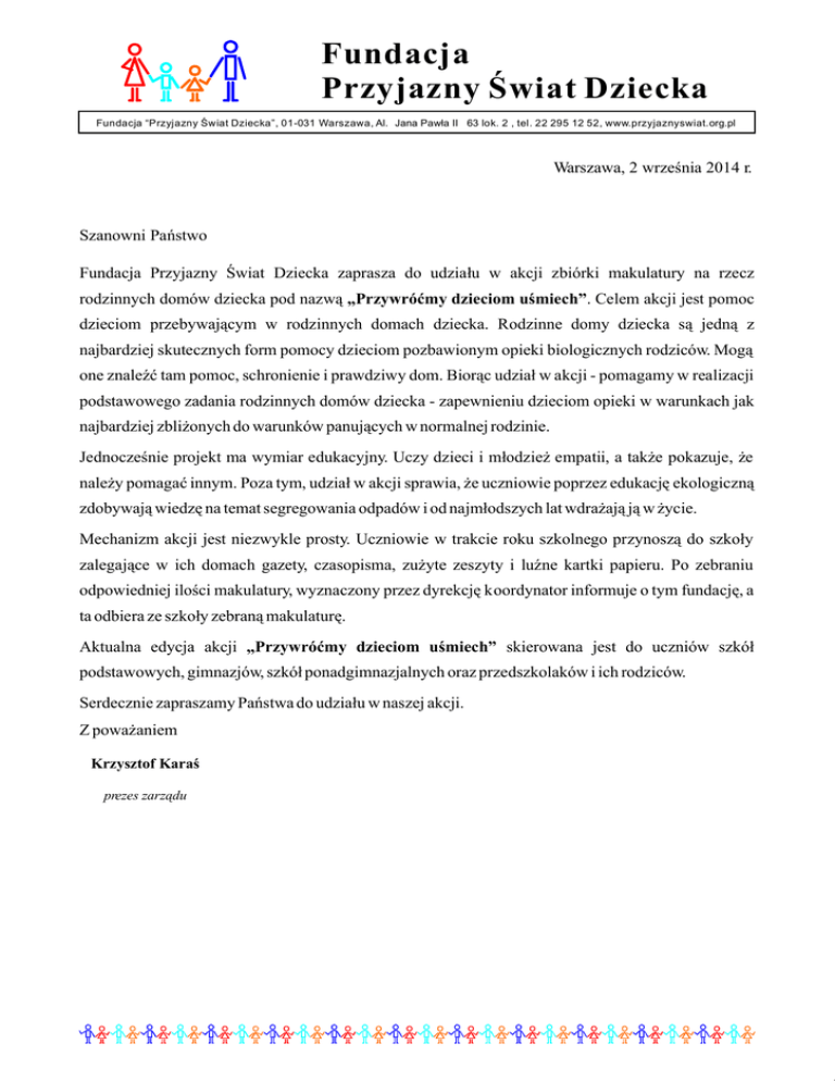 Fundacja Przyjazny Świat Dziecka Fundacja “Przyjazny Świat Dziecka”, 01-031 Warszawa, Al. Jana Pawła II 63 lok. 2 , tel. 22 295 12 52, www.przyjaznyswiat.org.pl Warszawa, 2 września 2014 r. Szanowni Państwo Fundacja Przyjazny Świat Dziecka zaprasza do udziału w akcji zbiórki makulatury na rzecz rodzinnych domów dziecka pod nazwą „Przywróćmy dzieciom uśmiech”. Celem akcji jest pomoc dzieciom przebywającym w rodzinnych domach dziecka. Rodzinne domy dziecka są jedną z najbardziej skutecznych form pomocy dzieciom pozbawionym opieki biologicznych rodziców. Mogą one znaleźć tam pomoc, schronienie i prawdziwy dom. Biorąc udział w akcji - pomagamy w realizacji podstawowego zadania rodzinnych domów dziecka - zapewnieniu dzieciom opieki w warunkach jak najbardziej zbliżonych do warunków panujących w normalnej rodzinie. Jednocześnie projekt ma wymiar edukacyjny. Uczy dzieci i młodzież empatii, a także pokazuje, że należy pomagać innym. Poza tym, udział w akcji sprawia, że uczniowie poprzez edukację ekologiczną zdobywają wiedzę na temat segregowania odpadów i od najmłodszych lat wdrażają ją w życie. Mechanizm akcji jest niezwykle prosty. Uczniowie w trakcie roku szkolnego przynoszą do szkoły zalegające w ich domach gazety, czasopisma, zużyte zeszyty i luźne kartki papieru. Po zebraniu odpowiedniej ilości makulatury, wyznaczony przez dyrekcję koordynator informuje o tym fundację, a ta odbiera ze szkoły zebraną makulaturę. Aktualna edycja akcji „Przywróćmy dzieciom uśmiech” skierowana jest do uczniów szkół podstawowych, gimnazjów, szkół ponadgimnazjalnych oraz przedszkolaków i ich rodziców. Serdecznie zapraszamy Państwa do udziału w naszej akcji. Z poważaniem Krzysztof Karaś prezes zarządu
