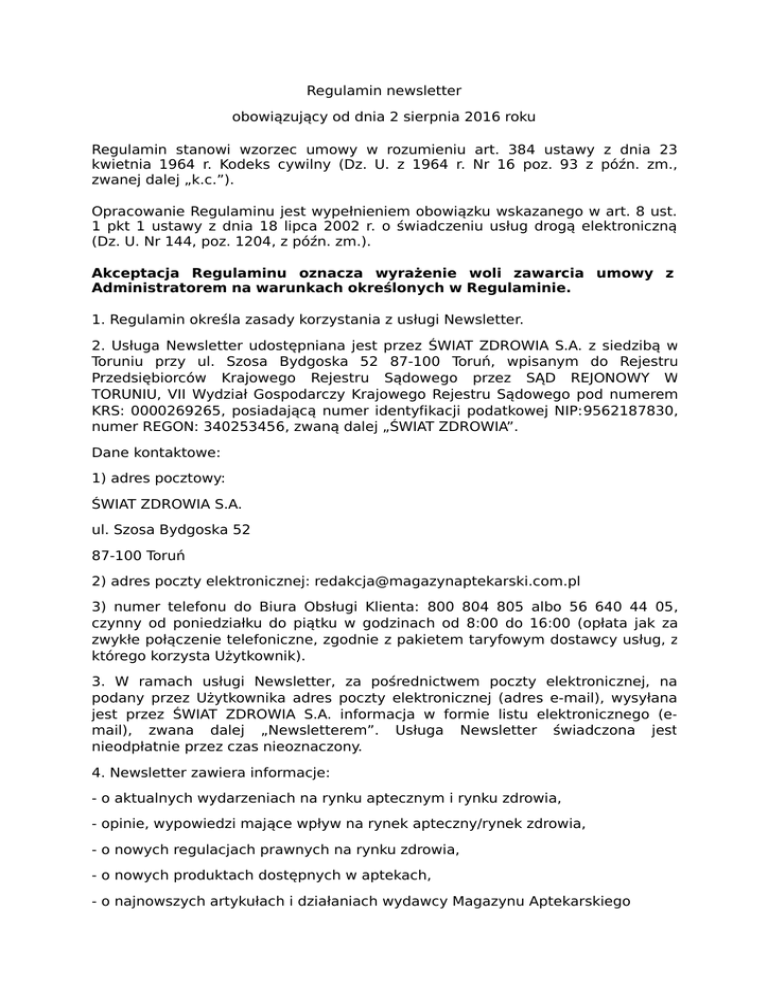 Regulamin newsletter obowiązujący od dnia 2 sierpnia 2016 roku Regulamin stanowi wzorzec umowy w rozumieniu art. 384 ustawy z dnia 23 kwietnia 1964 r. Kodeks cywilny (Dz. U. z 1964 r. Nr 16 poz. 93 z późn. zm., zwanej dalej „k.c.”). Opracowanie Regulaminu jest wypełnieniem obowiązku wskazanego w art. 8 ust. 1 pkt 1 ustawy z dnia 18 lipca 2002 r. o świadczeniu usług drogą elektroniczną (Dz. U. Nr 144, poz. 1204, z późn. zm.). Akceptacja Regulaminu oznacza wyrażenie woli zawarcia umowy z Administratorem na warunkach określonych w Regulaminie. 1. Regulamin określa zasady korzystania z usługi Newsletter. 2. Usługa Newsletter udostępniana jest przez ŚWIAT ZDROWIA S.A. z siedzibą w Toruniu przy ul. Szosa Bydgoska 52 87-100 Toruń, wpisanym do Rejestru Przedsiębiorców Krajowego Rejestru Sądowego przez SĄD REJONOWY W TORUNIU, VII Wydział Gospodarczy Krajowego Rejestru Sądowego pod numerem KRS: 0000269265, posiadającą numer identyfikacji podatkowej NIP:9562187830, numer REGON: 340253456, zwaną dalej „ŚWIAT ZDROWIA”. Dane kontaktowe: 1) adres pocztowy: ŚWIAT ZDROWIA S.A. ul. Szosa Bydgoska 52 87-100 Toruń 2) adres poczty elektronicznej: [email protected] 3) numer telefonu do Biura Obsługi Klienta: 800 804 805 albo 56 640 44 05, czynny od poniedziałku do piątku w godzinach od 8:00 do 16:00 (opłata jak za zwykłe połączenie telefoniczne, zgodnie z pakietem taryfowym dostawcy usług, z którego korzysta Użytkownik). 3. W ramach usługi Newsletter, za pośrednictwem poczty elektronicznej, na podany przez Użytkownika adres poczty elektronicznej (adres e-mail), wysyłana jest przez ŚWIAT ZDROWIA S.A. informacja w formie listu elektronicznego (email), zwana dalej „Newsletterem”. Usługa Newsletter świadczona jest nieodpłatnie przez czas nieoznaczony. 4. Newsletter zawiera informacje: - o aktualnych wydarzeniach na rynku aptecznym i rynku zdrowia, - opinie, wypowiedzi mające wpływ na rynek apteczny/rynek zdrowia, - o nowych regulacjach prawnych na rynku zdrowia, - o nowych produktach dostępnych w aptekach, - o najnowszych artykułach i działaniach wydawcy Magazynu Aptekarskiego 5. Newsletter wysyłany jest nie rzadziej niż co trzydzieści dni. 6. Każdy Newsletter zawiera: 1) informację o ŚWIAT ZDROWIA S.A. z siedzibą w Toruniu jako nadawcy Newslettera, 2) wypełnione pole „Temat” określające treść Newslettera, 3) informację o sposobie rezygnacji z usługi Newsletter lub zmianie adresu poczty elektronicznej (adresu e-mail) Użytkownika, na który wysyłany jest Newsletter. 7. Korzystanie z usługi Newsletter jest uzależnione od posiadania przez Użytkownika komputera lub innego urządzenia multimedialnego z dostępem do sieci Internet oraz od posiadania przez Użytkownika aktywnego konta poczty elektronicznej (e-mail). 8. Zamówienie usługi Newsletter następuje poprzez dokonanie przez Użytkownika następujących czynności rejestracyjnych na stronie internetowej www.magazynaptekarski.com.pl. 1) podanie adresu poczty elektronicznej (adresu e-mail) Użytkownika w formularzu zamieszczonym na stronie internetowej, 2) wyrażenie zgody na otrzymywanie na podany w formularzu adres poczty elektronicznej (adres e-mail) informacji handlowych w rozumieniu ustawy z dnia 18 lipca 2002 r. o świadczeniu usług drogą elektroniczną ( t.j. Dz.U. 2013, poz. 1422 z późn. zm.), 3) wyrażenie zgody na używanie telekomunikacyjnych urządzeń końcowych i automatycznych systemów wywołujących dla celów marketingu bezpośredniego, zgodnie z ustawą z dnia 16 lipca 2004 r. Prawo telekomunikacyjne (t.j. Dz.U. 2014, poz. 243 z późn. zm.). 4) zaakceptowanie niniejszego Regulaminu, 5) naciśnięcie (kliknięcie) na przycisk „Zapisz się”, 9. Naciśnięcie (kliknięcie) na przycisk „Zapisz się” powoduje dodanie adresu poczty elektronicznej Użytkownika (adresu e-mail) do listy e-mailingowej. Adres poczty elektronicznej Użytkownika (adres e-mail) będzie wykorzystywany w celu wysyłania Użytkownikowi Newsletterów. 10. Z chwilą zaakceptowania Regulaminu przez osobę podającą dane w formularzu zapisu na newsletter dochodzi do zawarcia umowy o świadczenie usług drogą elektroniczną. Z tą chwilą Administrator staje się zobowiązany do świadczenia usług określonych w Regulaminie. 11. Administratorem danych osobowych jest ŚWIAT ZDROWIA S.A. z siedzibą w Toruniu ( 87-100 ) przy ul. Szosa Bydgoska 52. Podane dane osobowe przetwarzane będą w celu realizacji usługi Newsletter (zawierającego informacje, o których mowa w pkt 4 niniejszego Regulaminu ) oraz w celach marketingowych własnych produktów i usług oraz podmiotów współpracujących. Dane osobowe nie będą udostępniane odbiorcom danych w rozumieniu art. 7 pkt 6 ustawy o ochronie danych osobowych. Osobie, której dane dotyczą, przysługuje prawo dostępu do treści jej danych oraz możliwość ich poprawiania. Dane są podawane przez osoby, których dotyczą, dobrowolnie, niemniej bez ich podania nie jest możliwa realizacja ww. celów. 12. Dane osobowe przetwarzane będą przez Administratora danych w zakresie niezbędnym do zawarcia, wykonania oraz rozwiązania stosunku prawnego, którego przedmiotem jest realizacja usługi Newsletter. Przetwarzanie danych osobowych w celu marketingu bezpośredniego własnych produktów lub usług Administratora danych będzie następowało na podstawie wypełnienia prawnie usprawiedliwionych celów realizowanych przez Administratora danych. W pozostałych przypadkach dane osobowe mogą być przetwarzane na podstawie dobrowolnie wyrażonej przez Użytkownika zgody na przetwarzanie jego danych w celu szczegółowo wskazanym w treści wyrażanej zgody, jak również w przypadkach, w których przepisy prawa upoważniają do ich przetwarzania. 13. Użytkownik może w każdej chwili, bez podania przyczyny i bez ponoszenia kosztów, zmienić wskazany uprzednio adres poczty elektronicznej (adres e-mail), na który wysyłany jest Newsletter 