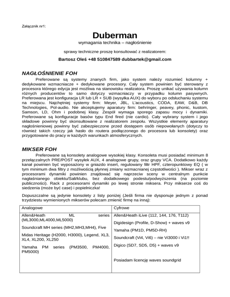 Załącznik nr1: Duberman wymagania technika – nagłośnienie sprawy techniczne proszę konsultować z realizatorem: Bartosz Oleś +48 510847589 [email protected] NAGŁOŚNIENIE FOH Preferowane są systemy znanych firm, jako system należy rozumieć kolumny + dedykowane wzmacniacze + dedykowane procesory. Cały system powinien być sterowany z procesora którego edycja jest możliwa na stanowisku realizatora. Proszę unikać używania kolumn różnych producentów to samo dotyczy wzmacniaczy w przypadku kolumn pasywnych. Preferowana jest konfiguracja LR lub LR + SUB (wysyłka AUX) do wyboru po odsłuchaniu systemu na miejscu. Najchętniej systemy firm: Meyer, JBL, L’acoustics, CODA, EAW, D&B, DB Technologies, Pol-audio. Nie akceptujemy aparatury firm: behringer, peavey, phonic, kustom, Samson, LD, Ohm i podobnej klasy. Zespół wymaga sporego zapasu mocy i dynamiki. Preferowane są konfiguracje basów typu End fired (nie cardio). Cały wybrany system i jego składowe powinny być skonsultowane z realizatorem zespołu. Wszystkie elementy aparatury nagłośnieniowej powinny być zabezpieczone przed dostępem osób niepowołanych (dotyczy to również takich rzeczy jak hasło do routera podłączonego do procesora lub konsolety) oraz przygotowane do pracy w każdych warunkach atmosferycznych. MIKSER FOH Preferowane są konsolety analogowe wysokiej klasy. Konsoleta musi posiadać minimum 8 przełączalnych PRE/POST wysyłek AUX, 4 analogowe grupy, oraz grupy VCA. Dodatkowo każdy kanał powinien być wyposażony w gniazdo insert, regulowany filtr HPF, czteropunktowy EQ ( w tym minimum dwa filtry z możliwością płynnej zmiany wzmacnianej częstotliwości ). Mikser wraz z procesorami dynamiki powinien znajdować się naprzeciw sceny w centralnym punkcie nagłaśnianego obiektu/Sali/klubu, bez dodatkowego podestu/podwyższenia (na poziomie publiczności). Rack z procesorami dynamiki po lewej stronie miksera. Przy mikserze coś do siedzenia (może być case) i popielniczka! Dopuszczalne są jedynie konsolety z listy poniżej (Jeśli firma nie dysponuje jednym z ponad trzydziestu wymienionych mikserów polecam zmienić firmę na inną): Analogowe Allen&Heath ML (ML3000,ML4000,ML5000) Cyfrowe series Allen&Heath iLive (112, 144, 176, T112) Digidesign (Profile, D-Show) + waves v9 Soundcraft MH series (MH2,MH3,MH4), Five Yamaha (PM1D, PM5D-RH) Midas Heritage (H2000, H3000), Legend, XL3, Soundcraft (Vi4, Vi6) – nie Vi3000 i Vi1!! XL4, XL200, XL250 Yamaha PM series (PM3500, PM4000, Digico (SD7, SD5, D5) + waves v9 PM5000) Posiadam licencję waves soundgrid Do miksera analogowego: 2x Drawmer DS201, 2x Drawmer DS401 lub BSS DPR504 4x DBX160A, 2x BSS DPR402, 2x BSS DPR404 1x Yamaha SPX ( 90, 900, 990, 2000 ) 1x Lexicon PCM ( 60, 80, 81, 90, 91 ) lub MX ( 200, 300, 400 ) 1x TC electronic ( Mone, Dtwo) MONITORY Wymagany jest osobny mikser monitorowy. W każdym przypadku. najlepiej cyfrowy z możliwością zapisania wszystkich ustawień. Potrzebujemy minimum 6 kolumn typu wedge + drumFill. Preferowane są profesjonalne odsłuchy sceniczne takie jak D&B MAX, Meyer MJF lub podobnej klasy. Nie akceptujemy kolumn z tworzywa sztucznego. Wszystkie kolumny muszą być takie same i zasilane takimi samymi wzmacniaczami. Dla perkusisty DrumFill składający się z Basu (minimum jeden głośnik 18”) + góra z możliwością odłączenia góry i zostawienia samego basu. Dodatkowo dla perkusisty 2-4 linie odsłuchowe do jego miksera (np. mix bębnów, mix klawiszy, mix wokali, stopa+bas) dla klawiszowców i chórków odsłuchy douszne (4 kanały) dostarczone przez firmę nagłośnieniową wraz z słuchawkami! Realizacją monitorów zajmuje się realizator zapewniony przez firmę nagłośnieniową. Lista wejść: Kanał Instrument / źródło Mikrofon / dibox Statyw insert 1 Stopa Beta 52A!! Niski Bramka 2 Trigger Dibox radial, BSS, KT 3 Werbel SM57, i5 Niski Kompresor 4 Hi-Hat SM81, C451B, KM184 Niski 5 Timbales e604 Klips Bramka 6 Tom 1 e604 Klips Bramka 7 Tom 2 e604 Klips Bramka 8 Tom 3 e604 Klips Bramka 9 OH L SM81, C451B, KM184 Wysoki 10 OH R SM81, C451B, KM184 Wysoki 11 SPDS-L Dibox radial, BSS, KT 12 SPDS-R Dibox radial, BSS, KT 13 Bas Dibox radial, BSS, KT 14 Gitara 1 e906 Niski 15 Gitara 2 e906 Niski 16 Key 1 NORD mono Dibox radial, BSS, KT 17 Key 2 KORG M3 Dibox radial, BSS, KT 18 Key 3 KORG M1 Dibox radial, BSS, KT 19 Key 4 NORD L Dibox radial, BSS, KT 20 Key 5 NORD R Dibox radial, BSS, KT Kompresor 21 Przeszkadzajki bęben L SM57, MD421, i5 Wysoki 22 Przeszkadzajki bęben R SM57, MD421, i5 Wysoki 23 Przeszkadzajki OH SM81, C451B, KM 184 Wysoki 24 Wokal 1 Beta 58A Wysoki Kompresor 25 Wokal 2 Beta 58A Wysoki Kompresor 26 Wokal 3 Beta 58A Wysoki Kompresor Powrót efektu 1 Powrót efektu 2 Powrót efektu 3 Talkback Beta 58A iPad Mały jack stereo +kompresory na grupach sprawy techniczne proszę konsultować z realizatorem: Bartosz Oleś +48 510847589 [email protected] Załącznik nr 2: W Stowarzyszenie Autorów ZAiKS, działając w imieniu twórców, których utwory chroni, apeluje do organizatorów imprez o rzetelne, dokładne i czytelne wypełnianie WYKAZÓW UTWORÓW SŁOWNYCH, MUZYCZNYCH I SŁOWNOMUZYCZNYCH. Wykazy stanowią podstawy rozliczenia wynagrodzenia uzyskanego-od organizatora imprezy pomiędzy twórców wykonywanych utworów. Pominięcie w wykazie wykonanych utworów stanowi naruszenie praw twórców, umowy licencyjnej oraz rodzi skutki prawne przewidziane w umowie. Raport nr ..................................................................... Wpływ zł .................................................................... Nr przelewu ..................................................................... Inspektorat nr .................................................................... Nr umowy ..................................................................... Organizatorzy swoim podpisem potwierdzają rzetelność danych w wykazach. Podpis i pieczątka Inspektora ZAiKS WYKAZ UTWORÓW S