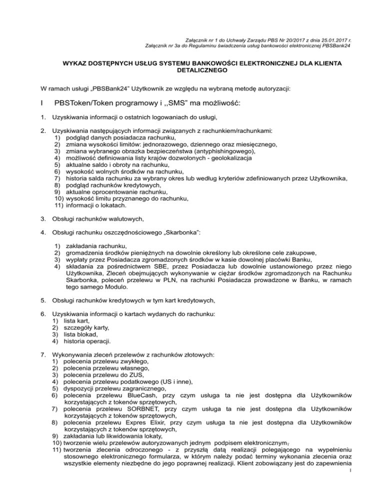 Załącznik nr 1 do Uchwały Zarządu PBS Nr 20/2017 z dnia 25.01.2017 r. Załącznik nr 3a do Regulaminu świadczenia usług bankowości elektronicznej PBSBank24 WYKAZ DOSTĘPNYCH USŁUG SYSTEMU BANKOWOŚCI ELEKTRONICZNEJ DLA KLIENTA DETALICZNEGO W ramach usługi „PBSBank24” Użytkownik ze względu na wybraną metodę autoryzacji: I PBSToken/Token programowy i ,,SMS” ma możliwość: 1. Uzyskiwania informacji o ostatnich logowaniach do usługi, 2. Uzyskiwania następujących informacji związanych z rachunkiem/rachunkami: 1) podgląd danych posiadacza rachunku, 2) zmiana wysokości limitów: jednorazowego, dziennego oraz miesięcznego, 3) zmiana wybranego obrazka bezpieczeństwa (antyphishingowego), 4) możliwość definiowania listy krajów dozwolonych - geolokalizacja 5) aktualne saldo i obroty na rachunku, 6) wysokość wolnych środków na rachunku, 7) historia salda rachunku za wybrany okres lub według kryteriów zdefiniowanych przez Użytkownika, 8) podgląd rachunków kredytowych, 9) aktualne oprocentowanie rachunku, 10) wysokość limitu przyznanego do rachunku, 11) informacji o lokatach. 3. Obsługi rachunków walutowych, 4. Obsługi rachunku oszczędnościowego „Skarbonka”: 1) 2) 3) 4) zakładania rachunku, gromadzenia środków pieniężnych na dowolnie określony lub określone cele zakupowe, wypłaty przez Posiadacza zgromadzonych środków w kasie dowolnej placówki Banku, składania za pośrednictwem SBE, przez Posiadacza lub dowolnie ustanowionego przez niego Użytkownika, Zleceń obejmujących wykonywanie w ciężar środków zgromadzonych na Rachunku Skarbonka, poleceń przelewu w PLN, na rachunki Posiadacza prowadzone w Banku, w ramach tego samego Modulo. 5. Obsługi rachunków kredytowych w tym kart kredytowych, 6. Uzyskiwania informacji o kartach wydanych do rachunku: 1) lista kart, 2) szczegóły karty, 3) lista blokad, 4) historia operacji. 7. Wykonywania zleceń przelewów z rachunków złotowych: 1) polecenia przelewu zwykłego, 2) polecenia przelewu własnego, 3) polecenia przelewu do ZUS, 4) polecenia przelewu podatkowego (US i inne), 5) dyspozycji przelewu zagranicznego, 6) polecenia przelewu BlueCash, przy czym usługa ta nie jest dostępna dla Użytkowników korzystających z tokenów sprzętowych, 7) polecenia przelewu SORBNET, przy czym usługa ta nie jest dostępna dla Użytkowników korzystających z tokenów sprzętowych, 8) polecenia przelewu Expres Elixir, przy czym usługa ta nie jest dostępna dla Użytkowników korzystających z tokenów sprzętowych, 9) zakładania lub likwidowania lokaty, 10) tworzenie wielu przelewów autoryzowanych jednym podpisem elektronicznym, 11) tworzenia zlecenia odroczonego - z przyszłą datą realizacji polegającego na wypełnieniu stosownego elektronicznego formularza, w którym należy podać terminy wykonania zlecenia oraz wszystkie elementy niezbędne do jego poprawnej realizacji. Klient zobowiązany jest do zapewnienia 1 środków na rachunku w dniu realizacji zlecenia odroczonego. Jeżeli środki na rachunku Klienta nie wpłyną w ciągu trzech dni od daty pierwszej realizacji zlecenia Bank odrzuci zlecenie po tym terminie, 12) Polecenie przelewu odroczonego można zrealizować na rachunki złotowe, rachunki walutowe prowadzone w Banku oraz dokonać spłaty kredytu zgodnie z parametrami ustalonymi przez Bank dla typu kredytu, bądź wskazanej umowy (funkcja dostępna w opcji kredyty po wybraniu numeru rachunku dla danej umowy kredytowej) według następujących zasad: a) spłaty kredytów obsługiwanych w równych ratach kredytowych (annuitetowych), oraz kredytów obsługiwanych w ratach malejących stosownie do wysokości zadłużenia, dla których nie zlecono obsługi zadłużenia z Rachunku, są księgowane na wyodrębnionym rachunku przeznaczonym do obsługi zadłużenia, a w dniu wymagalności raty kredytowej, są pobierane z tego rachunku, na poczet spłaty kredytu w kolejności i w wysokości, określonej zgodnie z umową kredytową, b) w przypadku kredytów obsługiwanych w ratach malejących stosownie do wysokości zadłużenia, gdy Kredytobiorca złoży oświadczenie o rezygnacji z obsługi zadłużenia przy użyciu wyodrębnionego rachunku, a Bank to oświadczenie zaakceptuje, każda wpłata kierowana na rachunek kredytowy, bez względu na jej wysokość, zostaje zaliczona przez Bank na poczet spłaty Kredytu, w dacie jej wpływu do Banku, zgodnie z kolejnością wynikającą z Umowy kredytowej tj. na poczet spłaty ewentualnych kosztów, odsetek narosłych do dnia wpłaty a w pozostałej części na poczet kapitału kredytu. Wówczas odsetki, które narosną od daty powyższej spłaty, do terminu płatności raty, podlegają spłacie w terminie ich wymagalności zgodnie z umową kredytową. W przypadku braku spłaty tych odsetek, lub kapitału kredytu, w kwocie wymagalnej zgodnie z umowa kredytową, zadłużenie z tego tytułu staje się należnością przeterminowaną, c) możliwość dokonywania nadpłat kredytu, dotyczy kredytów obsługiwanych w ratach kapitałowych równych oraz ratach odsetkowych malejących stosownie do wysokości zadłużenia, a także kredytów obsługiwanych w ratach annuitetowych, pod warunkiem, że: - nadpłata dotyczy wyłącznie kredytów udzielonych Posiadaczowi jako kredytobiorcy lub współkredytobiorcy, i pod warunkiem, że Posiadacz złożył przy zawarciu umowy kredytu lub w jego trakcie, dyspozycję obsługi spłaty kredytu przy użyciu Rachunku, - spłata z bieżącym terminem realizacji, zostanie zaksięgowania na poczet spłaty kredytu, zgodnie z kolejnością księgowania spłat określoną na mocy Umowy kredytowej, w dacie wpływu do Banku, - w przypadku dokonania spłaty przed terminem wynikających z przyjętego harmonogramu, odsetki za okres od daty wpływu środków do Banku, do wyznaczonego dnia spłaty najbliższej raty, zostaną pobrane z Rachunku w dniu wymagalności raty, przy czym w przypadku rat malejących będą to odsetki naliczone 