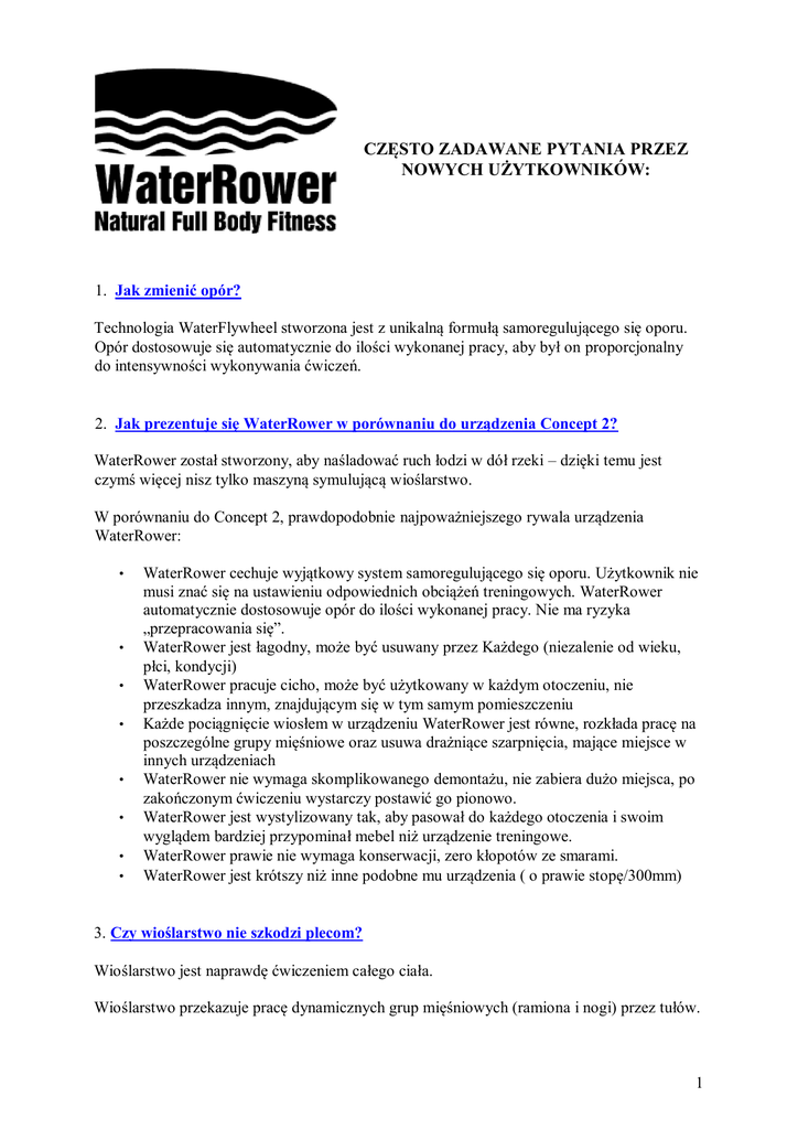 CZĘSTO ZADAWANE PYTANIA PRZEZ NOWYCH UŻYTKOWNIKÓW: 1. Jak zmienić opór? Technologia WaterFlywheel stworzona jest z unikalną formułą samoregulującego się oporu. Opór dostosowuje się automatycznie do ilości wykonanej pracy, aby był on proporcjonalny do intensywności wykonywania ćwiczeń. 2. Jak prezentuje się WaterRower w porównaniu do urządzenia Concept 2? WaterRower został stworzony, aby naśladować ruch łodzi w dół rzeki – dzięki temu jest czymś więcej nisz tylko maszyną symulującą wioślarstwo. W porównaniu do Concept 2, prawdopodobnie najpoważniejszego rywala urządzenia WaterRower: • • • • • • • • WaterRower cechuje wyjątkowy system samoregulującego się oporu. Użytkownik nie musi znać się na ustawieniu odpowiednich obciążeń treningowych. WaterRower automatycznie dostosowuje opór do ilości wykonanej pracy. Nie ma ryzyka „przepracowania się”. WaterRower jest łagodny, może być usuwany przez Każdego (niezalenie od wieku, płci, kondycji) WaterRower pracuje cicho, może być użytkowany w każdym otoczeniu, nie przeszkadza innym, znajdującym się w tym samym pomieszczeniu Każde pociągnięcie wiosłem w urządzeniu WaterRower jest równe, rozkłada pracę na poszczególne grupy mięśniowe oraz usuwa drażniące szarpnięcia, mające miejsce w innych urządzeniach WaterRower nie wymaga skomplikowanego demontażu, nie zabiera dużo miejsca, po zakończonym ćwiczeniu wystarczy postawić go pionowo. WaterRower jest wystylizowany tak, aby pasował do każdego otoczenia i swoim wyglądem bardziej przypominał mebel niż urządzenie treningowe. WaterRower prawie nie wymaga konserwacji, zero kłopotów ze smarami. WaterRower jest krótszy niż inne podobne mu urządzenia ( o prawie stopę/300mm) 3. Czy wioślarstwo nie szkodzi plecom? Wioślarstwo jest naprawdę ćwiczeniem całego ciała. Wioślarstwo przekazuje pracę dynamicznych grup mięśniowych (ramiona i nogi) przez tułów. 1 Aby móc przekazać tą pracę wioślarz pracuje gorsetem mięśniowym tułowia. Wzmacnia w ten sposób tułów i odpowiednio formuje sylwetkę. W ten sposób wioślarstwo rozwija silną sylwetkę. Wzmocnienie mięśni tułowia jest podstawą dobrego samopoczucia i jest niezbędne w rehabilitacji chorób pleców – jednym z najczęściej spotykanych schorzeń w naszym społeczeństwie. Słabsze maszyny imitujące wiosłowanie często na początku wywołują u ćwiczącego niezdrowe wygięcie kręgosłupa. 4. Jak często należy zmieniać wodę, aby utrzymać zbiornik w czystości? Urządzenie WaterRower nie wymaga konserwacji. Jedyne co trzeba wykonywać regularnie, to kontrolować stan wody w zbiorniku. Aby oczyścić wodę, wystarczy wrzucić do niej puritab – tabletkę dostarczoną wraz z urządzeniem. Częstość użycia zależy od ilości światła, na jakie wystawiona jest woda. Ilość chloru zmniejsza się wraz z wystawieniem wody na działanie światła. Dlatego należy co jakiś czas ją zwiększać za pomocą dostarczonych tabletek chlorowych. Im jest jaśniej, tym częściej będzie się to działo. Każde urządzenie WaterRower dostarczane jest z zapasem tabletek chlorowych, które oczywiście mona także zamówić w internecie. Oczywiście wodę można wymienić w prosty sposób, używając w tym celu pompki dostarczonej z każdym urządzeniem. Jednakże jest to tylko wlewanie świeżej wody. O wiele prostsze jest zwiększenie ilości pierwiastków chemicznych, utrzymujących czystość wody, dokładnie tak jak w przypadku basenu lub łózka wodnego. 5. Jakie części zużywają się? Jakie części obejmuje gwarancja? Urządzenie WaterRower praktycznie nie wymaga konserwacji. Urządzenie wymaga tylko jednej, regularnej czynności konserwacyjnej – utrzymania poziomu wody w zbiorniku. Wymaga to okresowego dodawania tabletek chlorowych do zbiornika z wodą. Poza tym w urządzeniu WaterRower nie zużywają się żadne części. Jedynym obszarem narażonym na zużycie są paski (taśmy) mocujące stopy (nie są objęte gwarancją) oraz baterie w monitorze S4 ( nie są objęte gwarancją ) WaterRower zapewnia nastające warunki gwarancyjne: 2 lata na ramę i części 2 Po rejestracji WaterRower podnosi gwarancję do: 5 lat na ramę i 3 lat na części -Tylko po dokonaniu kompletnej Rejestracji Gwarancyjnej. Gwarancja obejmuje także czynności wykonywane w serwisie WaterRower. Prowadzimy także pełen serwis online na stronie WaterRowerService.com 6. Jak ciężka/wysoka osoba może korzystać z urządzenia WaterRower? Mimo tego, że WaterRower został zaprojektowany jak urządzenie dla każdego, posiada pewne limity. Drewniana rama nie powinna się złamać lub wygiąć. Kółka pod krzesełkiem zniosą maksymalnie ciężar 1000 kilogramów (2200 lb). Limit wagi: 1000 kg (2200 lbs) Szyny urządzenia są dostosowane dla osób nie wyższych niż 38". Limit wzrostu: 38" Na specjalne zamówienie dostarczamy ekstra długie szyny, pasujące dla osób do 42’’. 7. Jak opróżnia się zbiornik z wodą? Urządzenie WaterRower jest dostarczane wraz ze specjalną pompką, ułatwiającą opróżnianie i napełnianie zbiornika. Aby napełnić zbiornik, wystarczy postawić zbiornik na maszynie, zamontować pompkę, kilka razy nacisnąć, a grawitacja zdziała resztę. Aby opróżnić zbiornik, wystarczy ustawić pusty pojemnik na podłodze i zamontować pompkę. Zalecamy napełnienie zbiornika do 18 litrów (podziałka znajduje się na zbiorniku z boku) i zaznaczenie poziomu wody (np. markerem) na zbiorniku. 8. Co jest wyświetlane na monitorze? Monitor WaterRower Serii 4 zawiera siedem okien informacyjnych. Intensywność – pokazuje intensywność ćwiczeń w takich jednostkach jak: m/s (metry na sekundę), mph (mile na godzinę), /500m (czas na 500 metrów), /2km (czas na 2 kilometry), waty i kilokalorie na godzinę. Ilość pociągnięć – pokazuje ilość pociągnięć wiosłem na minutę Puls – pokazuje tempo bicia serca na minut