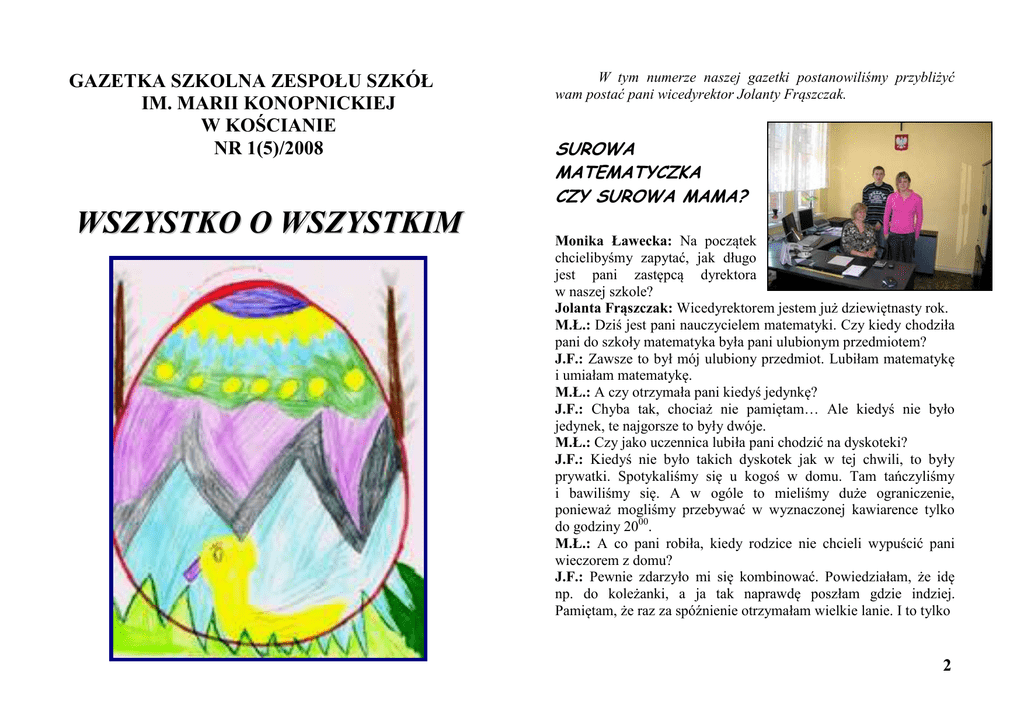 GAZETKA SZKOLNA ZESPOŁU SZKÓŁ IM. MARII KONOPNICKIEJ W KOŚCIANIE NR 1(5)/2008 WSZYSTKO O WSZYSTKIM W tym numerze naszej gazetki postanowiliśmy przybliżyć wam postać pani wicedyrektor Jolanty Frąszczak. SUROWA MATEMATYCZKA CZY SUROWA MAMA? Monika Ławecka: Na początek chcielibyśmy zapytać, jak długo jest pani zastępcą dyrektora w naszej szkole? Jolanta Frąszczak: Wicedyrektorem jestem już dziewiętnasty rok. M.Ł.: Dziś jest pani nauczycielem matematyki. Czy kiedy chodziła pani do szkoły matematyka była pani ulubionym przedmiotem? J.F.: Zawsze to był mój ulubiony przedmiot. Lubiłam matematykę i umiałam matematykę. M.Ł.: A czy otrzymała pani kiedyś jedynkę? J.F.: Chyba tak, chociaż nie pamiętam… Ale kiedyś nie było jedynek, te najgorsze to były dwóje. M.Ł.: Czy jako uczennica lubiła pani chodzić na dyskoteki? J.F.: Kiedyś nie było takich dyskotek jak w tej chwili, to były prywatki. Spotykaliśmy się u kogoś w domu. Tam tańczyliśmy i bawiliśmy się. A w ogóle to mieliśmy duże ograniczenie, ponieważ mogliśmy przebywać w wyznaczonej kawiarence tylko do godziny 2000. M.Ł.: A co pani robiła, kiedy rodzice nie chcieli wypuścić pani wieczorem z domu? J.F.: Pewnie zdarzyło mi się kombinować. Powiedziałam, że idę np. do koleżanki, a ja tak naprawdę poszłam gdzie indziej. Pamiętam, że raz za spóźnienie otrzymałam wielkie lanie. I to tylko 2 za to, że spóźniałam się kilka minut (a przyszłam kilka minut po 2000). A tak poważnie mówiąc, to starałam podporządkowywać się nakazom i zakazom rodziców. M.Ł.: Znamy panią jako surową matematyczkę, czy jest pani również surową mamą? J.F.: Oj, chyba nie (śmieje się). Dzisiaj moje dzieci są już dorosłe. Pod moją opieką jest już tylko jedna córka. Pozostali mają już swoje rodziny. Jednak starałam się być w stosunku do nich wymagająca, ponieważ chciałam, aby zawsze szli dobrą, odpowiednią dla nich drogą. Arkadiusz Ruskowiak: A czego najbardziej nie lubi pani w drugim człowieku? J.F.: Nie toleruję kłamstwa! Nie lubię, kiedy ktoś w oczy mówi mi jedno, a za plecami zupełnie coś innego. A.R.: A co robi pani w czasie wolnym od pracy? J.F.: No to zależy. Latem jestem na ogrodzie. Natomiast zimą lubię rozwiązywać krzyżówki. Interesuje mnie też sudoku. Chociaż nie umiem jeszcze rozwiązywać tych najtrudniejszych. Mam również swoje ulubione programy telewizyjne. A.R.: Pani dyrektor do szkoły przyjeżdża pani samochodem. Chcielibyśmy dowiedzieć się czy zdarza się pani jeździć również rowerem. Który środek transportu pani woli: samochód czy rower? J.F.: Bardzo lubię rower i latem po mieście poruszam się rowerem. Wiadomo, że kiedy wybieram się gdzieś dalej, wtedy jadę samochodem. A.R.: Wiemy, że ma pani wnuki. Czy jest pani babcią, która opowiada dzieciom bajki, śpiewa kołysanki i gotuje obiadki? J.F.: Mam cztery wnuczki. Obiadów nie gotuję. Natomiast lubię opowiadać bajki. W ogóle uwielbiam być z wnuczkami. Chętnie chodzę z nimi na spacery. A.R.: A jaką bajkę opowiada im pani najczęściej. J.F.: W zasadzie to najczęściej czytam im bajki. To są różne opowieści, bardziej współczesne. A.R.: Jaka jest pani ulubiona potrawa? 3 J.F.: Ja lubię dużo potraw. Bardzo lubię kawę i jej zapach. Nie jadam często wymyślnych dań. Bardzo lubię taką np. świeżą bułkę z samym masłem. A.R.: Chcielibyśmy zapytać o przepis na ulubioną potrawę. J.F.: Bardzo prosty. Świeża bułka i masło. Ale wiecie co, najbardziej to ja lubię, jak ktoś mi przygotuje danie i poda mi je na stół. M.Ł.: To prawda tak jest najlepiej! A.R.: Pani dyrektor dziękujemy pani z udzielenie nam wywiadu. J.F.: Bardzo proszę. Wywiad przeprowadzili: Monika Ławecka Arkadiusz Ruskowiak Grzegorz Portny 4 ŚWIĘTA WIELKIEJNOCY Święta wielkanocne są świętem ruchomym. Wielka Niedziela przypada w pierwszą wiosenną pełnię księżyca. Tak więc mogą one wypaść między 22 marca a 25 kwietnia. Wielkanoc związana jest z pradawnymi obchodami wiosennego przesilenia, zatem wiele obyczajów wywodzi się z wcześniejszych rytuałów pogańskich. Chciałybyśmy wam przybliżyć kilka z nich. Oto one: 1. 2. 3. 4. 5. 6. Przed Wielkanocą robiono świąteczne porządki nie tylko po to, by mieszkanie lśniło czystością. Porządki miały symboliczne znaczenie – w ten sposób wymiatano z mieszkania zimę, a wraz z nią wszelkie zło i choroby. W Wielki Czwartek, Wielki Piątek i Wielką Sobotę woda miała moc magiczną. Na potwierdzenie tego święcono ją w Wielką Sobotę. Wierni przynosili świeconą wodę do domów, kropili nią domowników, zwierzęta, dom oraz zabudowania gospodarcze. W Wielką Środę na obrzeżach wsi rozpalano siedem ognisk, by ogień symbolicznie ochronił domostwa od pożaru. Zanim ogniska dogasły, zabierano z nich żagwie i przenoszono nimi zarzewie ognia do domów, gdzie podsycano na nowo, wygaszone wcześniej paleniska, odradzając w ten sposób ochronną moc domowego ogniska. Świecone pokarmy miały wielką moc, nie wyrzucano nic, nawet kości, które zjedzone przez psa miały chronić go od wścieklizny. Połykanie bazi miało chronić od bólu gardła, złego uroku oraz wzmacniało całe ciało. Poświeconą palmę zatykano za święty obraz gdzie czuwała nad domem aż do następnej Wielkanocy. I MIEJSCE ZESPOŁU TANECZNEGO „ŚWIETLIKI” W KONKURSIE TAŃCA „O ZŁOTĄ NUTKĘ” Dnia 26 lutego 2008 roku odbył się w naszej szkole I Konkurs Tańca o Złotą Nutkę. Do udziału w przeglądzie zgłosiło się 13 zespołów tanecznych, które występowały w dwóch kategoriach. Wśród zespołów tanecznych nie zabrakło również nas, tancerzy i tancerek z zespołów edukacyjno – terapeutycznych, których zespół nosi nazwę ŚWIETLIKI. Nasz zespół istnieje już drugi rok. W ubiegłym roku otrzymaliśmy wyróżnienie na I Wielkopolskim Przeglądzie Tanecznym w Poznaniu. W Konkursie Tańca o
