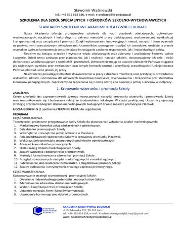 Sławomir Waśniewski tel.: +48 535 633 636, e-mail: [email protected] SZKOLENIA DLA SZKÓŁ SPECJALNYCH I OŚRODKÓW SZKOLNO-WYCHOWAWCZYCH STANDARDY SZKOLENIOWE AKADEMII KREATYWNEJ EDUKACJI Nasza Akademia oferuje profesjonalne szkolenia dla kadr placówek oświatowych, opiekuńczowychowawczych, socjalnych i kulturalnych z zakresu metodyki pracy dydaktycznej, wychowawczej, opiekuńczej i terapeutycznej oraz zarządzania i promocji. Dzięki wykorzystaniu innowacyjnych metod, narzędzi i form opartych na praktycznym i warsztatowym aktywizowaniu Uczestników, pomagamy rozwijać ich zawodowe, osobiste, a przede wszystkim twórcze kompetencje umożliwiające im osiąganie zarówno zespołowych, jak i indywidualnych celów. Śledzimy na bieżąco przepisy i wytyczne władz oświatowych oraz zbieramy i analizujemy Państwa opinie i sugestie. Dzięki temu zarówno przy planowaniu, jak i realizacji naszych szkoleń, dostosowujemy ich cele i treści do koncepcji współpracujących z nami szkół i przedszkoli, jednocześnie mając na uwadze ułatwienie Państwu osiągania jak najlepszych wyników przy ewaluacjach oraz innych formach kontroli i weryfikacji prawidłowości funkcjonowania Państwa placówki oraz jakości jej pracy. Nasi trenerzy posiadają wieloletnie doświadczenie w pracy z dziećmi i młodzieżą oraz praktykę w prowadzeniu wykładów, szkoleń i seminariów dla aktywnych zawodowo nauczycieli, wychowawców i terapeutów oraz studentów kierunków pedagogicznych. Zapraszamy do zapoznania się z naszą ofertą i do owocnej i pełnej sukcesów współpracy. 1. Kreowanie wizerunku i promocja Szkoły ZAŁOŻENIA Celem szkolenia jest zaprezentowanie szeregu nowoczesnych narzędzi kreowania wizerunku i promowania Szkoły oraz komunikowania się i budowania relacji ze środowiskiem lokalnym. W części praktycznej Uczestnicy opracują strategię oraz harmonogram działań marketingowych budujących trwałe zaplecze promocyjne Placówki. LICZBA GODZIN: 5 (1 spotkanie) TERMIN I CENA: do uzgodnienia PROGRAM CZĘŚĆ SZKOLENIOWA Teoretyczne i praktyczne przygotowanie kadry Szkoły do planowania i wdrażania działań marketingowych: 1. Marketingowy kontekst usług edukacyjnych i opiekuńczych. 2. Cele działań promocyjnych Szkoły. 3. Wewnętrzne i zewnętrzne public relations w Placówce. 4. Rola przedstawicieli społeczności Szkoły w kreowaniu wizerunku Placówki. 5. Wykorzystanie potencjału zewnętrznych podmiotów opiniotwórczych. 6. Adresaci komunikatów promocyjnych. 7. Skala i zasięg działań marketingowych Szkoły. 8. Zasady tworzenia i doboru treści promocyjnych. 9. Metody i formy kreowania wizerunku i promocji Szkoły. 10. Przegląd nowoczesnych narzędzi marketingowych i e-marketingowych. 11. Publikowanie jako skuteczna forma krótko- i długofalowej promocji Szkoły. 12. Zasady budowania i utrzymywania trwałego zaplecza promocyjnego. CZĘŚĆ WARSZTATOWA Opracowywanie strategii wizerunkowej i promocyjnej Szkoły: 1. Określenie indywidualnego potencjału i mocnych stron Szkoły. 2. Zdefiniowanie adresatów działań marketingowych. 3. Wybór i klasyfikacja treści promujących Szkołę. 4. Ustalenie narzędzi, form i kanałów komunikacji. 5. Utworzenie harmonogramu działań promocyjnych. AKADEMIA KREATYWNEJ EDUKACJI ul. Piotrkowska 276, 90-361 Łódź tel.: +48 535 633 636, e-mail: [email protected] www. AkademiaKreatywnejEdukacji.pl 2. Nauczycielu, publikuj! ZAŁOŻENIA Podczas szkolenia Uczestnicy poznają 25 form drukowanych i elektronicznych publikacji wraz z zasadami ich tworzenia, promowania, rozpowszechniania i wykorzystywania jako: skutecznych narzędzi kreowania wizerunku oraz promowania Szkoły, nośników informacji adresowanych do potencjalnych kandydatów podczas naboru podopiecznych, innowacyjnej metody zawodowej autopromocji nauczyciela i wychowawcy. LICZBA GODZIN: 5 (1 spotkanie) TERMIN I CENA: do uzgodnienia PROGRAM 1. Pomysł, czyli co chcę publikować? 2. Zasady gromadzenia i opracowywania materiałów oraz formy tworzenia własnych publikacji. 3. Publikacje drukowane: gazetka szkolna, czasopisma oświatowe, lokalna prasa, twórczość literacka: proza (opowiadania, bajki, teksty relaksacyjne itp.), poezja, własne czasopismo, biuletyn. 4. Publikacje internetowe: specjalistyczne serwisy, strona WWW Szkoły, własna strona WWW, blog, wirtualne portfolio (autopromocja), portale społecznościowe i fora dyskusyjne, dziennikarstwo obywatelskie, e-booki, audiobooki, newslettery i e-ziny, podcasty (pliki dźwiękowe, zdjęcia, grafika, filmy), presell pages, listy sprzedażowe, artykuły sponsorowane, recenzje itp., kursy online (e-kursy, e-learning). 5. Zasady wydawania, promowania i sprzedaży własnych publikacji. 6. Autopromocja oraz budowanie wizerunku i promowanie Szkoły poprzez różne formy publikacji. 3. Projekt edukacyjny, artystyczny i kulturalny w Szkole Specjalnej ZAŁOŻENIA Szkolenie ma na celu zaprezentowanie zasad opracowywania i realizacji projektów o charakterze metodycznym (edukacyjnym, artystycznym i kulturalnym) lub organizacyjnym w Szkole. Podczas zajęć Uczestnicy otrzymają wiele wskazówek dotyczących metod i form kreatywnego podejścia do pracy opisywaną metodą oraz poznają przykłady zrealizowanych z sukcesem przedsięwzięć projektowych. LICZBA GODZIN: 5 (1 spotkanie) TERMIN I CENA: do uzgodnienia PROGRAM 1. Projekt edukacyjny, artystyczny, kulturalny i organizacyjny jako metoda pracy. 2. Cele i założenia projektu. 3. Formy, skala i charakter projektów. 4. Projekt jako forma innowacji pedagogicznej. 5. Etapy realizacji projektu. 6. Sponsoring, fundraising i crowdfunding w działalności projektowej. 7. Promowanie przedsięwzięć projektowych. 8. Projekty edukacyjne i artystyczne jako forma promocji Szkoły, jej Kadry, uczniów oraz organizacji i instytucji wspierających. 9. Dobre praktyki – przegląd przykładowych inicjatyw projektowych. AKADEMIA KREATYWNEJ EDUKACJI ul. Piotrkowska 276, 90-361 Łódź tel.: +4