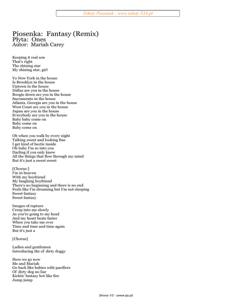 Teksty Piosenek - www.teksty.TJA.pl Piosenka: Fantasy (Remix) Płyta: Ones Autor: Mariah Carey Keeping it real son That's right The shining star My shining star, girl Yo New York in the house Is Brooklyn in the house Uptown in the house Dallas are you in the house Boogie down are you in the house Sacramento in the house Atlanta, Georgia are you in the house West Coast are you in the house Japan are you in the house Everybody are you in the house Baby baby come on Baby come on Baby come on Oh when you walk by every night Talking sweet and looking fine I get kind of hectic inside Oh baby I'm so into you Darling if you only knew All the things that flow through my mind But it's just a sweet sweet [Chorus:] I'm in heaven With my boyfriend My laughing boyfriend There's no beginning and there is no end Feels like I'm dreaming but I'm not sleeping Sweet fantasy Sweet fantasy Images of rapture Creep into me slowly As you're going to my head And my heart beats faster When you take me over Time and time and time again But it's just a [Chorus] Ladies and gentlemen Introducing the ol' dirty doggy Here we go now Me and Mariah Go back like babies with pacifiers Ol' dirty dog no liar Kickin' fantasy hot like fire Jump jump Strona 1/2 - (www.tja.pl) Teksty Piosenek - www.teksty.TJA.pl And let me see you do the stump Girls let me see you shake your rump Brothers get in from the back and pump And let's do it do it do the hump I'm a little bit country I'm a little bit rock And I'm soul to soul Big letters all big and bold Ol' Dirty Bastard across the globe [Chorus] What you gonna do when you get out of jail I'm gonna do a remix What you gonna do when you get out of jail I'm gonna do a remix What you gonna do when you get out of jail I'm gonna have some fun What you gonna do when you get out of jail I'm gonna have some fun [Chorus] ***************************************** Polecamy Strony: www.opisy.tja.pl - Codzienie nowe opisy na GG www.rozmowki.tja.pl - Śmieszne Rozmówki www.tapeciarnia.pl - Mnustwo fajnych tapet na pulpit www.teledyski.tja.pl - Zawsze najnowsze teledyski www.lol2.pl - Śmieszne Filmiki, Kabarety www.wkinach.pl - Co jest grane w kinach ? Strona 2/2 - (www.tja.pl)