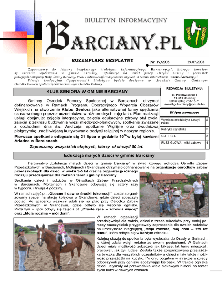 podległych oraz pracy Rady Gminy Barciany. Pełne i aktualne informacje można uzyskać na stronie internetowej: www. barciany.pl