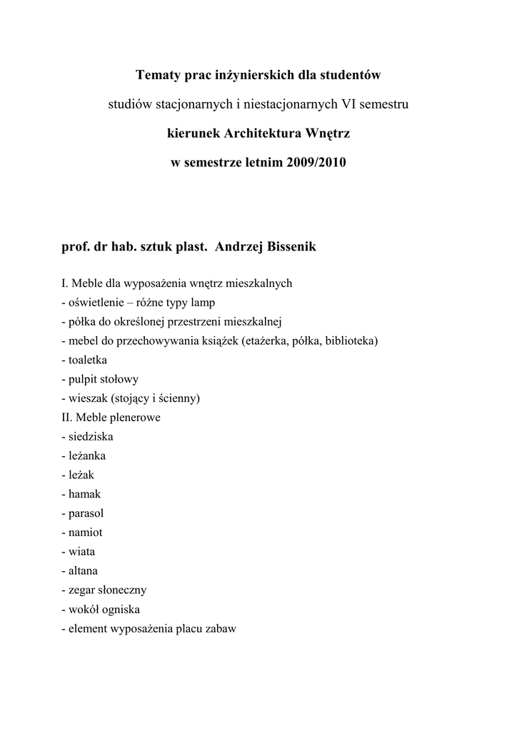 Tematy prac inŜynierskich dla studentów studiów stacjonarnych i niestacjonarnych VI semestru kierunek Architektura Wnętrz w semestrze letnim 2009/2010 prof. dr hab. sztuk plast. Andrzej Bissenik I. Meble dla wyposaŜenia wnętrz mieszkalnych - oświetlenie – róŜne typy lamp - półka do określonej przestrzeni mieszkalnej - mebel do przechowywania ksiąŜek (etaŜerka, półka, biblioteka) - toaletka - pulpit stołowy - wieszak (stojący i ścienny) II. Meble plenerowe - siedziska - leŜanka - leŜak - hamak - parasol - namiot - wiata - altana - zegar słoneczny - wokół ogniska - element wyposaŜenia placu zabaw III. Meble dla dzieci - kołyska dla niemowlęcia - mebel zabawka (przechowywanie zabawek) - zabawka „mini zoo” - stojak chodzik - mebel dla przedszkolaka prof. dr hab. Stanislaw Gontarczyk. Telefony: kom. 607 087 988 Tematy: siedzisko - projekt mebla "organizującego" przestrzeń wnętrza wybranego przez Dyplomanta: A. wnętrze mieszkalne 1. hall 2. salon 3. gabinet 4. sypialnia 5. łazienka B. wnętrze uŜyteczności publicznej 6. poczekalnia 7. foyer 8. pasaŜ 9. pub 10. propozycja autorska Dyplomanta Zakres opracowania projektowego: I. Inspiracje: 1. dokumentacja (rysunkowa oraz foto) wybranego wnętrza 2. przegląd i ocena aktualnej oferty rynku meblarskiego w zakresie tematu II. Scenariusz: 3. autorskie załoŜenia projektowe uwzględniające stylistykę wybranego wnętrza oraz uwarunkowania związane z tematem projektu, np: estetyczne, funkcjonalne, ergonomiczne, kulturowe, ekonomiczne itp. III. Dokumentacja procesu projektowego: 4. szkice koncepcyjne 5. makiety robocze w skali 1:5 6. projekt podstawowy 7. rysunki wykonawcze w skali 1:1 8. model mebla w skali 1:1 ewent. 1:2,5 IV. Opis projektu mebla: 9. wizualizacje mebla we wnętrzu 10. prezentacja walorów estetycznych, funkcjonalnych, ergonomicznych projektu. Meblarski projekt dyplomowy jest samodzielną pracą Dyplomanta, trwającą równolegle z realizacją programu dydaktycznego semestrów: VII i VIII. prof. dr hab. sztuk plast. Przemysław Krajewski (tel. 604287956) 1. Wnętrza mieszkalne: - Pokój dzienny – salon z aneksami: gabinet, biblioteka, jadalnia (róŜne typy rozwiązań przestrzennych) - Sypialnia, garderoba, łazienka (róŜne typy rozwiązań przestrzennych) - Sień mieszkalna (strefa wejściowa), pokój dzienny (salon) - Pracownia twórcza z niezbędnym aneksem – składowanie, sanitariaty 2. Wnętrza uŜyteczności publicznej (wnętrza handlowe): - Apteka, sklep zielarski - Antykwariat - ksiąŜki, grafika, fotografie, drobne przedmioty w gablotach i witrynach - Sklep z butami - Sklep z ceramiką i szkłem - Sklep drogeryjny lub z kosmetykami (róŜne typy asortymentu) - Sklep z biŜuterią lub zegarkami (moŜe być teŜ antykwariat z tym asortymentem) - Księgarnia wydawnicza: Arkady, Czytelnik, PiW, PWN etc. - Sklep z miodami - Sklep z okularami (wybrane marki) - Cukiernia z aneksem do konsumpcji (sprzedaŜ ciast) 3. Wnętrze uŜyteczności publicznej – wnętrza usługowe: - Biuro podróŜy - Barek kawowy (system sieciowy) - Herbaciarnia - Salon fryzjerski 4. Przestrzeń publiczna: - Mała kawiarnia sezonowa - Mała gastronomia – w oparciu o istniejący system wystawienniczy - Mała ekspozycja plenerowa prof. dr hab. sztuk plast. Lucjan Kasprzak Przestrzenie mieszkalne 1. Ganek wejściowy i sień mieszkalna 2. Sień mieszkalna i pokój dzienny lub salon 3. Przedpokój – kuchnia – jadalnia 4. Przestrzeń wspólna w istniejącym domu rodzinnym 5. Kuchnia, jadalnia i duŜy balkon 6. Salon, kuchnia i jadalnia 7. Salon albo pokój dzienny i terasa lub weranda 8. Salon i gabinet np. kominkowy, podróŜnika, wolnego zawodu, biblioteka wielopokoleniowa, itd. 9. Sypialnia z duŜą łazienką 10.Sypialnia - garderoba – łazienka 11.Mieszkanie 3-osobowe na poddaszu 12.Pracownia projektowa na poddaszu 13.Przestrzeń indywidualna w domu rodzinnym – zespół sypialni i toalet 14.Przestrzeń kawalerki. 15.Kawalerka loft. 16.Mieszkanie 2 - pokojowe 17.Mieszkanie w rotundzie 18.Izba z kuchnią, kominkiem i zapieckiem i w domu wakacyjnym 19.Mieszkanie wakacyjne w chacie – adaptacja wnętrz UŜyteczność publiczna – handel 20.Kwiaciarnia. 21.Sklep zoologiczny. 22.Sklep rowerowy 23.Salon map i urządzeń nawigacji 24.Księgarnia określonego wydawnictwa np. „Arkady”, „Amber”, wydawnictw szkolnych i dziecięcych, encyklopedycznych, itd. 25.Antykwariat określonego profilu 26.Sklep muzyczny: partytury, małe instrumenty, płyty winylowe itp. 27.Sklep filatelistyczny. 28.Sklep numizmatyczny. 29.Boutique – odzieŜ firmowa. 30.Perfumeria – kosmetyki firmowe. 31.Sklep z kapeluszami. 32.Sklep obuwniczy określonego profilu 33.Sklep z kominkami. 34.Sklep z ceramiką szlachetną 35.Sklep ze szkłem artystycznym 36.Apteka 37.Sklep z miodami 38.Kiosk kolportaŜowo-księgarski z drobnymi przedmiotami codziennych potrzeb. UŜyteczność publiczna –usługi, miejsce pracy 39.Salon fryzjerski 40.Salon optyczny 41.Zakład ramiarski - oprawa obrazów 42.Zespół usługowy: zegarmistrz, jubiler, grawer 43.Zespół usługowy: dorabianie kluczy, pieczątkarz, zegarmistrz 44.Usługi jubilerskie ze sklepem 45.Domowa pracownia projektowa 46.Sień hotelowa z recepcją 47. Apartament hotelowy w realnej sytuacji. 48.Komfortowe mieszkanie studenta wydziału projektowego w akademiku UŜyteczność publiczna –odpoczynek, rekreacja 49.Biuro podróŜy określonej firmy 50.Salon informacji turystycznej 51.Ekspozycja plenerowa określonego tematu 52.Letnia kawiarnia plenerowa. 53.Letni bufet plenerowy. 54.Altana lub pergola w parku miejskim Herbaciarnia56. 55.Herbaciarnia w pergoli 56.Herbaciarnia polska 57.Bar klubowy np. kibiców 58.Bar kawowy 59.Cukiernia 60.Kawiarenka muzyczna prof. dr hab. Lech Koliński 1. PROJEKT WNĘTRZ DOMU MIESZKALNEGO - DOM DO WYBORU 2. PROJEKT WNĘTRZ SKLEPU – BRANśA DO WYBORU - LOKALIZACJA NA PARTERZE KAMIENICY PRZY UL. ZŁOTEJ 1 W WARSZAWIE 3. PROJEKT WNĘTRZ LINII LOTN