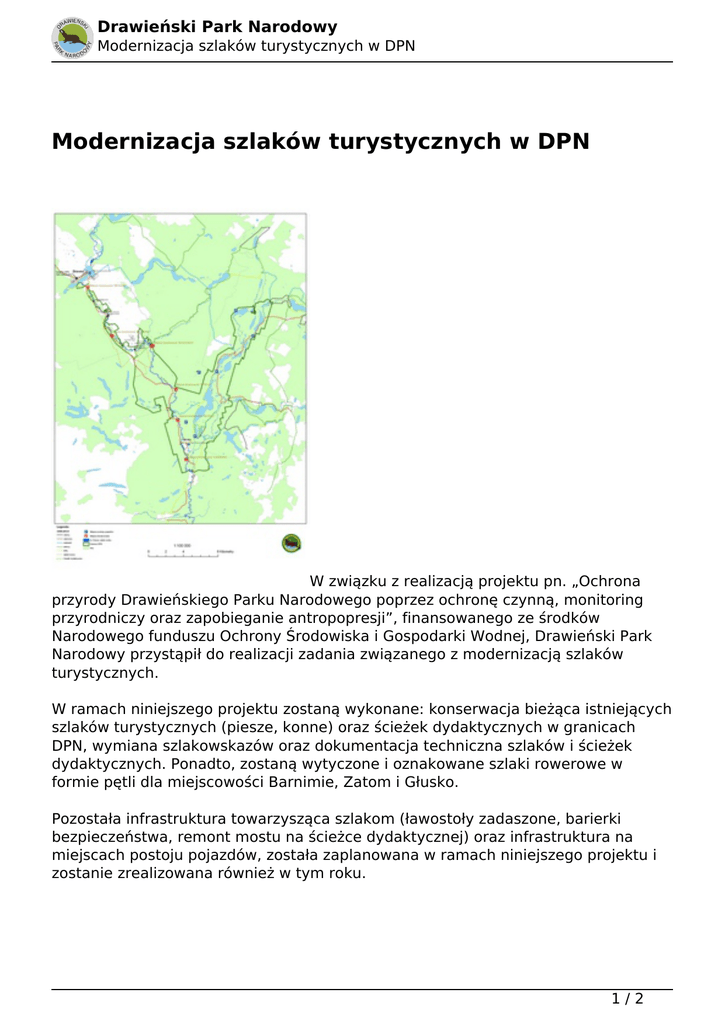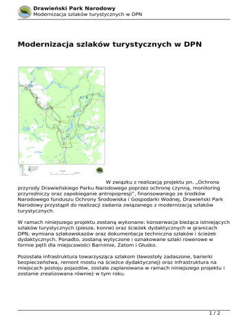 Drawieński Park Narodowy Modernizacja szlaków turystycznych w DPN Modernizacja szlaków turystycznych w DPN W związku z realizacją projektu pn. „Ochrona przyrody Drawieńskiego Parku Narodowego poprzez ochronę czynną, monitoring przyrodniczy oraz zapobieganie antropopresji”, finansowanego ze środków Narodowego funduszu Ochrony Środowiska i Gospodarki Wodnej, Drawieński Park Narodowy przystąpił do realizacji zadania związanego z modernizacją szlaków turystycznych. W ramach niniejszego projektu zostaną wykonane: konserwacja bieżąca istniejących szlaków turystycznych (piesze, konne) oraz ścieżek dydaktycznych w granicach DPN, wymiana szlakowskazów oraz dokumentacja techniczna szlaków i ścieżek dydaktycznych. Ponadto, zostaną wytyczone i oznakowane szlaki rowerowe w formie pętli dla miejscowości Barnimie, Zatom i Głusko. Pozostała infrastruktura towarzysząca szlakom (ławostoły zadaszone, barierki bezpieczeństwa, remont mostu na ścieżce dydaktycznej) oraz infrastruktura na miejscach postoju pojazdów, została zaplanowana w ramach niniejszego projektu i zostanie zrealizowana również w tym roku. 1/2 Drawieński Park Narodowy Modernizacja szlaków turystycznych w DPN Data wydruku: 01.03.2017 23:41:28 Adres URL: http://dpn.pl/aktualnosci/172-modernizacja-szlakow-turystycznych-w-dpn.html 2/2 Powered by TCPDF (www.tcpdf.org)