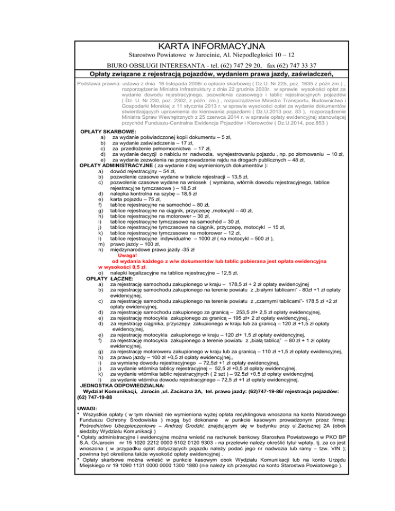 KARTA INFORMACYJNA Starostwo Powiatowe w Jarocinie, Al. Niepodległości 10 – 12 BIURO OBSŁUGI INTERESANTA - tel. (62) 747 29 20, fax (62) 747 33 37 Opłaty związane z rejestracją pojazdów, wydaniem prawa jazdy, zaświadczeń, Podstawa prawna: ustawa z dnia 16 listopada 2006r.o opłacie skarbowej ( Dz.U. Nr 225, poz. 1635 z późn.zm.) , rozporządzenie Ministra Infrastruktury z dnia 22 grudnia 2003r. w sprawie wysokości opłat za wydanie dowodu rejestracyjnego, pozwolenia czasowego i tablic rejestracyjnych pojazdów ( Dz. U. Nr 230, poz. 2302, z późn. zm.) , rozporządzenie Ministra Transportu, Budownictwa i Gospodarki Morskiej z 11 stycznia 2013 r. w sprawie wysokości opłat za wydanie dokumentów stwierdzających uprawnienia do kierowania pojazdami ( Dz.U.2013 poz. 83 ), rozporządzenie Ministra Spraw Wewnętrznych z 25 czerwca 2014 r. w sprawie opłaty ewidencyjnej stanowiącej przychód Funduszu-Centralna Ewidencja Pojazdów i Kierowców ( Dz.U.2014, poz.853 ) OPŁATY SKARBOWE: a) za wydanie poświadczonej kopii dokumentu – 5 zł, b) za wydanie zaświadczenia – 17 zł, c) za przedłożenie pełnomocnictwa – 17 zł, d) za wydanie decyzji o nabiciu nr nadwozia, wyrejestrowaniu pojazdu , np. po złomowaniu – 10 zł, e) za wydanie zezwolenia na przeprowadzenie rajdu na drogach publicznych – 48 zł, OPŁATY ADMINISTRACYJNE ( za wydanie niżej wymienionych dokumentów ): a) dowód rejestracyjny – 54 zł, b) pozwolenie czasowe wydane w trakcie rejestracji – 13,5 zł, c) pozwolenie czasowe wydane na wniosek ( wymiana, wtórnik dowodu rejestracyjnego, tablice rejestracyjne tymczasowe ) – 18,5 zł d) nalepka kontrolna na szybę – 18,5 zł e) karta pojazdu – 75 zł, f) tablice rejestracyjne na samochód – 80 zł, g) tablice rejestracyjne na ciągnik, przyczepę ,motocykl – 40 zł, h) tablice rejestracyjne na motorower – 30 zł, i) tablice rejestracyjne tymczasowe na samochód – 30 zł, j) tablice rejestracyjne tymczasowe na ciągnik, przyczepę, motocykl – 15 zł, k) tablice rejestracyjne tymczasowe na motorower – 12 zł, l) tablice rejestracyjne indywidualne – 1000 zł ( na motocykl – 500 zł ), m) prawo jazdy – 100 zł, n) międzynarodowe prawo jazdy -35 zł Uwaga! od wydania każdego z w/w dokumentów lub tablic pobierana jest opłata ewidencyjna w wysokości 0,5 zł. o) nalepki legalizacyjne na tablice rejestracyjne – 12,5 zł, OPŁATY ŁĄCZNE: a) za rejestrację samochodu zakupionego w kraju – 178,5 zł + 2 zł opłaty ewidencyjnej b) za rejestrację samochodu zakupionego na terenie powiatu z „białymi tablicami” - 80zł +1 zł opłaty ewidencyjnej, c) za rejestrację samochodu zakupionego na terenie powiatu z „czarnymi tablicami”- 178,5 zł +2 zł opłaty ewidencyjnej, d) za rejestrację samochodu zakupionego za granicą – 253,5 zł+ 2,5 zł opłaty ewidencyjnej, e) za rejestrację motocykla zakupionego za granicą – 195 zł+ 2 zł opłaty ewidencyjnej,, d) za rejestrację ciągnika, przyczepy zakupionego w kraju lub za granicą – 120 zł +1,5 zł opłaty ewidencyjnej, e) za rejestrację motocykla zakupionego w kraju – 120 zł+ 1,5 zł opłaty ewidencyjnej, f) za rejestrację motocykla zakupionego a terenie powiatu z „białą tablicą” – 80 zł + 1 zł opłaty ewidencyjnej, g) za rejestrację motoroweru zakupionego w kraju lub za granicą – 110 zł +1,5 zł opłaty ewidencyjnej, h) za prawo jazdy – 100 zł +0,5 zł opłaty ewidencyjnej,, i) za wymianę dowodu rejestracyjnego – 72,5zł +1 zł opłaty ewidencyjnej, j) za wydanie wtórnika tablicy rejestracyjnej – 52,5 zł +0,5 zł opłaty ewidencyjnej, k) za wydanie wtórnika tablic rejestracyjnych ( 2 szt ) – 92,5zł +0,5 zł opłaty ewidencyjnej, l) za wydanie wtórnika dowodu rejestracyjnego – 72,5 zł +1 zł opłaty ewidencyjnej, JEDNOSTKA ODPOWIEDZIALNA: Wydział Komunikacji, Jarocin ,ul. Zaciszna 2A, tel. prawo jazdy: (62)747-19-86/ rejestracja pojazdów: (62) 747-19-88 UWAGI: * Wszystkie opłaty ( w tym również nie wymieniona wyżej opłata recyklingowa wnoszona na konto Narodowego Funduszu Ochrony Środowiska ) mogą być dokonane w punkcie kasowym prowadzonym przez firmę: Pośrednictwo Ubezpieczeniowe – Andrzej Grodzki, znajdującym się w budynku przy ul.Zacisznej 2A (obok siedziby Wydziału Komunikacji ) * Opłaty administracyjne i ewidencyjne można wnieść na rachunek bankowy Starostwa Powiatowego w PKO BP S.A. O/Jarocin nr 15 1020 2212 0000 5102 0120 9303 - na przelewie należy określić tytuł wpłaty, tj. za co jest wnoszona ( w przypadku opłat dotyczących pojazdu należy podać jego nr nadwozia lub ramy – tzw. VIN ); powinna być określona także wysokość opłaty ewidencyjnej . * Opłaty skarbowe można wnieść w punkcie kasowym obok Wydziału Komunikacji lub na konto Urzędu Miejskiego nr 19 1090 1131 0000 0000 1300 1880 (nie należy ich przesyłać na konto Starostwa Powiatowego ).
