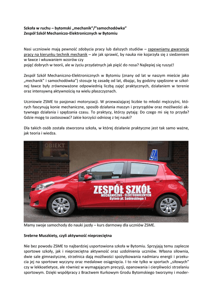Szkoła w ruchu – bytomski „mechanik”/”samochodówka” Zespół Szkół Mechaniczo-Elektronicznych w Bytomiu Nasi uczniowie mają pewność zdobycia pracy lub dalszych studiów – zapewniamy gwarancję pracy na kierunku technik mechanik – ale jak sprawić, by nauka nie kojarzyła się z siedzeniem w ławce i wkuwaniem wzorów czy pojęć dobrych w teorii, ale w życiu przydatnych jak pięść do nosa? Najlepiej się ruszyć! Zespół Szkół Mechaniczno-Elektronicznych w Bytomiu (znany od lat w naszym mieście jako „mechanik” i samochodówka”) stosuje tę zasadę od lat, dbając, by godziny spędzone w szkolnej ławce były zrównoważone odpowiednią liczbą zajęć praktycznych, działaniem w terenie oraz intensywną aktywnością na wielu płaszczyznach. Uczniowie ZSME to pasjonaci motoryzacji. W przeważającej liczbie to młodzi mężczyźni, których fascynują konie mechaniczne, sposób działania maszyn i przyrządów oraz możliwości aktywnego działania i spędzania czasu. To praktycy, którzy pytają: Do czego mi się to przyda? Gdzie mogę to zastosować? Jakie korzyści odniosę z tej nauki? Dla takich osób została stworzona szkoła, w której działanie praktyczne jest tak samo ważne, jak teoria i wiedza. Mamy swoje samochody do nauki jazdy – kurs darmowy dla uczniów ZSME. Srebrne Muszkiety, czyli aktywność nieprzeciętna Nie bez powodu ZSME to najbardziej usportowiona szkoła w Bytomiu. Sprzyjają temu zaplecze sportowe szkoły, jak i nieprzeciętna aktywność oraz uzdolnienia uczniów. Własna siłownia, dwie sale gimnastyczne, strzelnica dają możliwości spożytkowania nadmiaru energii i przekucia jej na sportowe wyczyny oraz medalowe osiągnięcia. I to nie tylko w sportach „siłowych” czy w lekkoatletyce, ale również w wymagającym precyzji, opanowania i cierpliwości strzelaniu sportowym. Dzięki współpracy z Bractwem Kurkowym Grodu Bytomskiego tworzymy i moder- nizujemy miejsca do uprawiania strzelectwa na ternie naszej szkoły: powstały strzelnice pneumatyczne, w trakcie realizacji jest strzelnica IPSC. Zawody strzeleckie np. „Srebrne Muszkiety” na stałe wpisały się w sportowy krajobraz Bytomia i każdego roku przyciągają nowych, młodych pasjonatów strzelania sportowego. Auta, motory, symulatory i…nauka jazdy, czyli aktywność praktyczna Od września 2016 rusza w naszej szkole zawodowej nowy kierunek: mechanik motocyklowy oraz mechanik - kierowca. Należymy więc do elitarnej grupy szkół w Polsce, które zdecydowały się kształcić specjalistów od jednośladów. A tych będzie u nas coraz więcej – klimat coraz cieplejszy, a i prawo przyjazne motocyklistom – w Polsce, jeśli masz prawo jazdy kat. B możesz prowadzić też motocykl do 125cm3. Czyli jednośladów będzie więcej – potrzebni są specjaliści, świetnie znający i małe, i potężne motocykle. Samochody to także istota szkoły. To obiekt pożądania i westchnień, wyzwanie, hobby i przyszła praca. Jak łączyć przyjemne z pożytecznym można sprawdzić rozbierając auto na części, a potem składając pod czujnym okiem doświadczonego profesora. Symulatory to wielka frajda, a nauka jazdy – bezpłatna dla uczniów szkoły – stanowi element praktycznego przygotowania do przyszłego zawodu; jest inwestycją w siebie, w swój zawodowy rozwój. Szkoła w ruchu. Kto chce, niech sprawdzi. Tu nie ma czasu na przestoje i zastoje. Otwierasz drzwi, wsiadasz…i jedziesz! Czy przyjazd do szkoły własnoręcznie wyremontowanym autem to nie powód do dumy i potwierdzenie męskich umiejętności i zaradności? Plymouth, Paryż, czyli aktywność zawodowa Praktyka za granicą? Czemu nie! Doświadczenie zawodowe zdobywa się w praktyce. A te najlepiej odbyć u renomowanych, znających życie pracodawców. A jeśli połączymy przyjemne z pożytecznym: możliwość zwiedzania innych krajów, poznawanie różnych kultur, szlifowanie języka z codzienną zawodową praktyką, to otrzymamy przepis na dobrą inwestycję i sukces w przyszłości. Dzięki zagranicznym stażom w Wielkiej Brytanii uczniowie „mechanika” w krótkim czasie zdobywają wiedzę i praktykę, jakiej nie nabyliby przez lata szkoły. Równie cenne są nawiązane znajomości i wysoka ocena brytyjskich pracodawców – już dziś najlepszym uczniom i absolwentom szkoły zagraniczny pracodawca oferuje dobrą pracę! Kropkę na i stanowią coroczne wyjazdy do Paryża na targi motoryzacyjne. Możliwość podziwiania najpiękniejszych, najnowocześniejszych (i najdroższych!) samochodów to nie lada gratka dla każdego miłośnika motoryzacji i mechaniki – a wręcz obowiązek dla ucznia bytomskiej „samochodówki”. Po godzinach, czyli aktywność rozrywkowa W wolnym czasie nikt nie lubi się nudzić. A nasi uczniowie: mechanicy, elektrycy i samochodziarze preferują aktywny sposób spędzania czasu. Stąd pomysł na zorganizowane uczestnictwo w rajdach samochodowych – takich jak rajdy organizowane przez naszego ucznia Mikołaja Byrskiego (MotorSport Bytom). Po zajęciach dobrze jest zrelaksować się przy muzyce. A jeszcze lepiej – samodzielnie zorganizować koncert. I to nie byle jaki! Wielkie przedsięwzięcie na skalę miasta pod patronatem prezydenta Bytomia, Damiana Bartyli: BTM Music Jam. Ściąga on najlepsze zespoły muzyczne i co roku, w październiku, szkoła wypełnia się rytmem i dźwiękami dobrej muzyki. Nowe kierunki, czyli aktywnie w przyszłość Szkoła przyciąga tych absolwentów gimnazjum, którzy nastawieni są do życia praktycznie i mają sprecyzowane plany na przyszłość. Wśród nich coraz więcej dziewczyn. Świadomych, pewnych siebie, aktywnych. Dla nich otwieramy nowe kierunki kształcenia: Mechanik motocyklowy – dla wszystkich miłośników jednośladów, którzy będą nie tylko ekspertami od wyglądu, mocy i dźwięku maszyn, ale zadbają przede wszystkim o ich stan techniczny zapewniający przyjemność i bezpieczeństwo podczas jazdy. Absol
