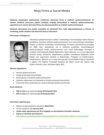 Szkolenie: Moja Firma w Social Media Moja Firma w Social Media Szkolenie obejmujące podstawowe możliwości obecności firmy w mediach społecznościowych. W ramach szkolenia poruszona będzie tematyka strategii komunikacji w mediach społecznościowych, zagrożenia oraz szanse obecności firmy oraz jej pracowników w mediach społecznościowych. Szkolenie skierowane jest przede wszystkim do właścicieli firm, osób odpowiedzialnych w firmach za marketing, public relations lub obecność firmy w Internecie. Informacje o Prelegencie: Absolwent podyplomowych studiów z Marketingu Internetowego Szkoły Głównej Handlowej. Pasjonat mediów społecznościowych oraz nowoczesnego marketingu. Ekspert w zakresie marketingu internetowego. W branży interaktywnej pracujący od 2008 roku. Specjalizuje się w realizacji projektów marketingowych wykorzystujących media społecznościowe oraz nowe technologie. Pracował w mediach internetowych (Media Regionalne, Nasza Klasa Sp. Z o.o.) oraz agencjach (Infinity Group, Socializer). Współtwórca spotkań Czwartkowe Spotkania Social Media oraz organizator spotkań w Białymstoku. Prelegent na konferencjach. Szkoleniowiec. Obecnie na co dzień pracuje jako Social Media Product Consultant w agencji The Digitals. Prowadził działania dla takich marek jak: Warka, AXA Polska, Krakuski, PayU, ING Bank Śląski, BOŚ. Główne Zagadnienia: Serwisy Społecznościowe: Wstęp do Strategii Social Media: Komunikacja w mediach społecznościowych: Działania reklamowe na Facebooku w ramach promocji komunikacji: Pracownik firmy ambasadorem marki w Mediach Społecznościowych: Koszt szkolenia: 599 zł netto przy rejestracji przed 30 listopada 2014 699 zł netto przy rejestracji po 30 listopada 2014 Informacje organizacyjne: Miejsce przeprowadzenia szkolenia: BIAŁYSTOK Termin szkolenia: 21 stycznia 2015 Liczba miejsc ograniczona do 20 ze względu na warsztatowy charakter szkolenia. Zapisy na szkolenie pod adresem: http://www.mrsocial.pl/warsztaty-i-szkolenia/moja-firma-w-social-media-szkolenie-21-stycznia-2014/ Kamil Mirowski – Digital Marketing Consultant www.mrsocial.pl, [email protected], +48602686610, fb.com/kamilmirowski Szkolenie: Moja Firma w Social Media Program: 8:45 – 9:15 Rejestracja uczestników 9:15 – 10:15 Serwisy Społecznościowe Specyfika najpopularniejszych kanałów społecznościowych: Facebook, YouTube, Twitter, Insagram Penetracja poszczególnych kanałów wśród polskich Internautów, Potencjał marketingowy każdego kanału, Sposoby korzystania przez Użytkowników, W tym module Użytkownicy poznają specyfikę najpopularniejszych serwisów społecznościowych w Polsce. Dowiedzą się również, w jaki sposób Użytkownicy konsumują poszczególne serwisy oraz jak można tę wiedzę wykorzystać w planowaniu działań marketingowych firmy. W tym module największy nacisk położony będzie na efektywność wykorzystania poszczególnych serwisów społecznościowych. 10:15 – 11:15 Wstęp do Strategii Social Media: Cele obecności w Social Media – jakie cele obecności w Social Media rozróżniamy, jak opracować cele zgodne ze strategią marketingową firmy, Wybór najbardziej efektywnych narzędzi pod kątem korzystania przez grupę celową oraz wcześniej przygotowanych celów obecności, Badanie korzystania z serwisu Facebook przez grupę celową (Facebook Audience Insights), Wybór KPI (Key Performance Indicators) – sposoby mierzenia efektów, W tym module uczestnicy szkolenia dowiedzą się jak ważnym elementem przed rozpoczęciem działań jest określenie celów oraz efektów, jakie chcieliby osiągnąć poprzez działania marketingowe w kanałach społecznościowych. Dodatkowy element dotyczący Facebook Audience pozwoli uczestnikom na poznanie narzędzia, dzięki któremu będą mogli poznać swoich odbiorców (również potencjalnych) i dzięki temu podejmować jeszcze skuteczniejsze decyzje biznesowe. 11:15 – 11:30 Przerwa Kawowa 11:30 – 12:30 Komunikacja w mediach społecznościowych: Ton komunikacji, Realizacja celów komunikacyjnych oraz wizerunkowych, Czym jest EdgeRank i jak z nim walczyć (Facebook), Moderacja profili, Obsługa klienta, Czym jest kryzys i jak sobie z nim poradzić, Uczestnicy tego modułu szkolenia poznają specyfikę prowadzenia komunikacji w mediach społecznościowych. Poza umiejętnością tworzenia oraz publikowania angażujących treści dowiedzą się jaką rolę w mediach społecznościowych pełni moderacji oraz obsługa Klienta. Dodatkowo Uczestnicy dowiedzą się jakie zagrożenia (m.in. kryzysy wizerunkowe) komunikacyjne czekają na każdą firmę, która decyduje się wejść w media społecznościowe. Dzięki krótkiemu poradnikowi zdobędą podstawy wiedzy na temat zarządzania kryzysem w mediach społecznościowych. 13:30 – 14:30 Przerwa Obiadowa Kamil Mirowski – Digital Marketing Consultant www.mrsocial.pl, [email protected], +48602686610, fb.com/kamilmirowski Szkolenie: Moja Firma w Social Media 14:30 – 15:00 Działania reklamowe na Facebooku w ramach promocji komunikacji: Rekrutacja fanów poprzez kampanię reklamową, Promocja treści publikowanych na stronie, Media Społecznościowe, a szczególnie Facebook weszły w taki etap, w którym niezbędne jest wsparcie reklamowe prowadzonych działań. W tym module uczestnicy szkolenia dowiedzą się jak efektywnie wykorzystać nawet niewielki budżet aby zwiększyć efektywność prowadzonej komunikacji a tym samym realizować postawione cele komunikacyjne oraz biznesowe. 15:00 – 16:00 Pracownik firmy ambasadorem marki w Mediach Społecznościowych: Szanse oraz zagrożenia obecności pracownika w mediach społecznościowych, Opracowanie Social Media Policy, Jak robią to inni – Case Study komunikacji w różnych serwisach społecznościowych, W tym module uczestnicy szkolenia dowiedzą się jaką rolę może pełnić pracownik firmy w mediach społecznościowych. Od roli ambasadora marki do roli przyczynku kryzysowe