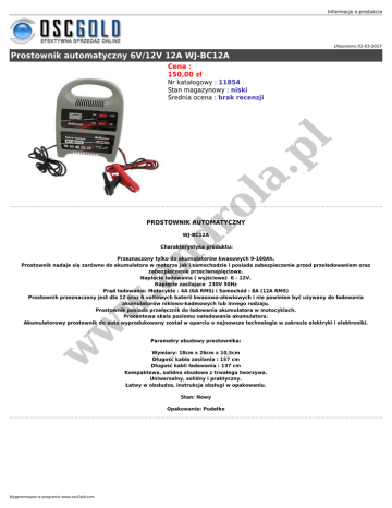 Informacje o produkcie Utworzono 01-03-2017 Prostownik automatyczny 6V/12V 12A WJ-BC12A Cena : 150,00 zł ro la .p l Nr katalogowy : 11854 Stan magazynowy : niski Średnia ocena : brak recenzji PROSTOWNIK AUTOMATYCZNY nd WJ-BC12A Charakterystyka produktu: w w w .a Przeznaczony tylko do akumulatorów kwasowych 9-160Ah. Prostownik nadaje się zarówno do akumulatora w motorze jak i samochodzie i posiada zabezpieczenie przed przeładowaniem oraz zabezpieczenie przeciwnapięciowe. Napięcie ładowania ( wyjściowe) 6 - 12V. Napięcie zasilające 230V 50Hz Prąd ładowania: Motocykle : 4A (6A RMS) i Samochód : 8A (12A RMS) Prostownik przeznaczony jest dla 12 oraz 6 voltowych baterii kwasowo-ołowiowych i nie powinien być używany do ładowania akumulatorów niklowo-kadmowych lub innego rodzaju. Prostownik posiada przełącznik do ładowania akumulatora w motocyklach. Procentowa skala poziomu naładowania akumulatora. Akumulatorowy prostownik do auta wyprodukowany został w oparciu o najnowsze technologie w zakresie elektryki i elektroniki. Parametry obudowy prostownika: Wymiary: 18cm x 26cm x 10,5cm Długość kabla zasilania : 157 cm Długość kabli ładowania : 137 cm Kompaktowa, solidna obudowa z trwałego tworzywa. Uniwersalny, solidny i praktyczny. Łatwy w obsłudze, instrukcja obsługi w opakowaniu. Stan: Nowy Opakowanie: Pudełko Wygenerowano w programie www.oscGold.com