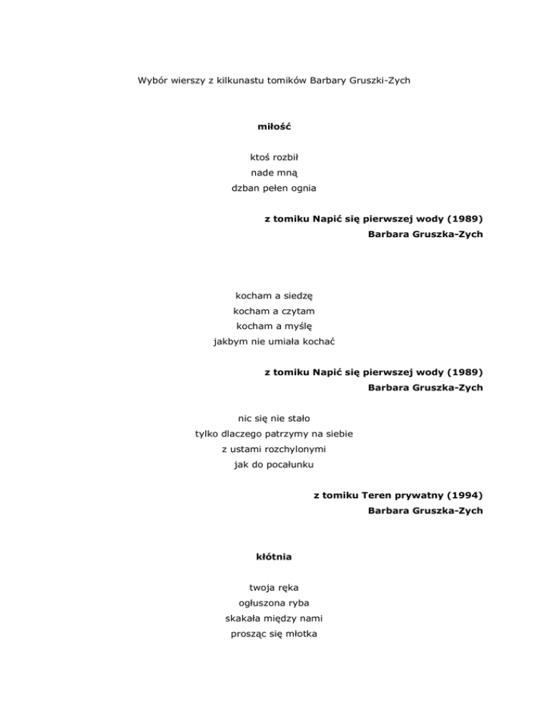 Wybór wierszy z kilkunastu tomików Barbary Gruszki-Zych mi kto rozbi nade mn dzban pe en ognia z tomiku Napi si pierwszej wody (1989) Barbara Gruszka-Zych kocham a siedz kocham a czytam kocham a my jakbym nie umia a kocha z tomiku Napi si pierwszej wody (1989) Barbara Gruszka-Zych nic si nie sta o tylko dlaczego patrzymy na siebie z ustami rozchylonymi jak do poca unku z tomiku Teren prywatny (1994) Barbara Gruszka-Zych ótnia twoja r ka og uszona ryba skaka a mi dzy nami prosz c si m otka z tomiku Teren prywatny (1994) Barbara Gruszka-Zych szpital tu dzieci zamiast nierzyków ustawiaj w szeregach termometry z tomiku Teren prywatny (1994) Barbara Gruszka-Zych usypia obok mnie z kolorow ksi w twardej oprawie ju tyle s ów Andersena Brzechwy mi dzy nami z tomiku Nic si nie sta o (1995) Barbara Gruszka-Zych ejkowi siedzi cicho zdziwiony e go nie przytulam nie zaczynam bajki bez w tpienia pisanie wierszy to stracony czas w kartce nie bije serce nie chce jej si i nie mo na z ni zasn mia trzymaj c za r pod powiekami snu kr y w nim nieobecne spojrzenie matki z tomiku Nic si nie sta o (1995) Barbara Gruszka-Zych zamiast postukuj cych kroków dziadków w ca ym domu s ycha biegaj ce dzieci jak po cichu wyszli z tomiku Nic si nie sta o (1995) Barbara Gruszka-Zych bezwstydnie patrzymy sobie w oczy ale czy przy s siednich stolikach nie kr puj si je gdy my si kochamy nad nietkni tym talerzem z tomiku Nic si nie sta o (1995) Barbara Gruszka-Zych ote jab ko w moim ciele szara mysz ci zaprowadzi z tomiku Nic si nie sta o (1995) Barbara Gruszka-Zych w poci gu wszyscy przechodz cy m czy ni patrz na dziewczyn obok mnie jestem obra ona na sam siebie e pozwala am na wszystko czasowi mo e pomog oby gdyby my zmieni y si miejscami? z tomiku Pali si mój próg (1997) Barbara Gruszka-Zych ród nó ek piersi udek ekspedientka w rozpi tym fartuchu z g ówkami ró owych piersi wystawia si na po arcie adne trzydziestoletnie mi so a towar po dwóch dniach nie wie y z tomiku Pali si mój próg (1997) Barbara Gruszka-Zych obudzi am si w nocy natychmiast zjad am kromk z sardynkami tak zaj temu organizmowi nie przyjdzie na my l by umrze z tomiku Pali si mój próg (1997) Barbara Gruszka-Zych ty to na nerki zachorujesz strasz mnie a ja ju znalaz am sobie chorob mier dobrze j wida tylko trzeba uwa nie przyjrze si cia u sk d przyjdzie z tomiku Pali si mój próg (1997) Barbara Gruszka-Zych cia em w cia o jak kamieniem w wod nie znajdziesz ladu e by o ich dwoje z tomiku Pali si mój próg (1997) Barbara Gruszka-Zych Praga dlaczego je autobusy kiedy my si kochamy przymierzamy nasze cia a czy do siebie pasuj i okazuje si e tak brakuje tylko skrzyde które przywar yby do siebie ka dym piórem i unios y nas nad Vinohrady szpital cmentarz krematorium tylko skrzyd a mog uratowa nas od spalenia dlatego wsuwam swoje ramiona pod twoje a ty unosisz mnie nad l dowiskiem prze cierad a potem w azience mi sp ywa do wi ziennego okienka metalowej kratki zamiast we mnie kr ysz w ciemnych obr czach rur z pulsem przeje aj cych autobusów nad g ow z tomiku Zapinaj c kolczyki (2000) Barbara Gruszka-Zych ) czyzna i kobieta przed kremacj tego po spaleniu jest oko o trzech kilogramów nachyla si osiemdziesi cioma nad tarcz stolika fili anka pe na rudych mrówek ze mietank uski eczek proch cukru nag y ból w plecach trzeba mocno nagina lont kr gos upa eby dobrze ysze oddech kobiety siedz cej naprzeciwko nie wiadomo czy za bia nie otwiera si przepa chusteczk d oni czarna dziura nieobecno ci póki jeszcze ma cia o nie chcia by w ni wpa a potem popio em ze swego serca b dzie czerni brwi krajobrazowi drapa j w czarnej lufie gard a z tomiku Zapinaj c kolczyki (2000) Barbara Gruszka-Zych na odleg kiedy kolejny raz dzwoni am do starszego syna który razem z innymi kolonistami wyszed wieczorem pa si w ciep ym morzu w Jastrz biej Górze us ysza am ju znajomy g os gospodarza budynku - mo e ja opowiem pani jak tu jest bo syn jeszcze nie wróci powiedzia troszcz c si o moje wydatki za telefon poczu am e powinnam zmieni bluzk zapi nie wypada w domowym stroju rozmawia z m który na tak odleg zobaczy kolczyki czyzn e jestem kobiet z tomiku Zapinaj c kolczyki (2000) Barbara Gruszka-Zych mia am anio a nad kiem spisywa moje uczynki pod okiem dziadka siedz cego przy stole z twarz zwrócon jak s ce zawsze w moj stron denerwowa am si czy starczy mu kartek w ksi dze bo szkolne podr czniki dziadka mia y ich po dwie cie a ja ka dego dnia sprawia am tysi c k opotów jemu babci mamie tacie motylom ale dziadek zapewnia e tamta ksi ga ro nie ze mn przybywa jej stron jak mnie osów z bów i centymetrów - doros y cz owiek - mówi ma w niej opisan najmniejsz kiedy si ci nie z gniewu bo uczynki rodz si nieco g biej ni s ycha w ustach i wida w oczach - g adzi przy tym szary p dzel bródki stercz cy z pomalowanej kilkoma zmarszczkami twarzy jakby chcia ug aska wszystkie swoje z e uczynki a potem bra mnie na kolana eby zakry plecami przed anio em i puszczali my samolociki na wie o umyt przez babci pod og a ona udawa a e nie widzi tak jak anio nad kiem z tomiku Zapinaj c kolczyki (2000) Barbara Gruszka-Zych mama myje okna przeciera przechodniom p aszcze nawet nie wiedz e oddali si do czyszczenia z tomiku Zapinaj c kolczyki (2000) Barbara Gruszka-Zych mój tata móg wreszcie porozmawia z profesorem teologii Uniwersytetu w Louvain o s dzie ostatecznym na pytanie jakim w niebie dziemy mówili j zykiem profesor znaj cy ich osiem odpowiedzia e polskim a niebo to wszystko co na ziemi niedopowiedziane i zamilk a tata zbieraj cy dowody na istnienie Boga zdziwi si e nie dostanie ani jednego dokumentu wi cej do swojej wi zanej teczki która opu ci a dwa ócienne w sy tasiemek przestaj c wierzy w sens przechowywania tajemnicy za papierowymi cianami z tomiku Zapinaj c kolczyki (2000) Barbara Gruszka-Zych liwki kupi am ostatniego sierpnia ciemne liwki odkie od s roz ca granatowe pszczo y ce si w przezroczystej siatce apa am je pojedynczo i wk ada am do ust wilgotne wargi uchylonego mi szu dotyka 