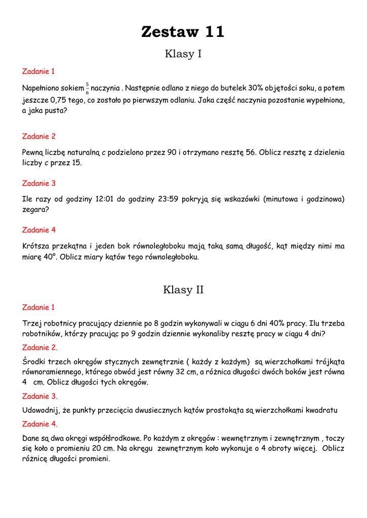 Zestaw 11 Klasy I Zadanie 1 5 Napełniono sokiem 6 naczynia . Następnie odlano z niego do butelek 30% objętości soku, a potem jeszcze 0,75 tego, co zostało po pierwszym odlaniu. Jaka część naczynia pozostanie wypełniona, a jaka pusta? Zadanie 2 Pewną liczbę naturalną c podzielono przez 90 i otrzymano resztę 56. Oblicz resztę z dzielenia liczby c przez 15. Zadanie 3 Ile razy od godziny 12:01 do godziny 23:59 pokryją się wskazówki (minutowa i godzinowa) zegara? Zadanie 4 Krótsza przekątna i jeden bok równoległoboku mają taką samą długość, kąt między nimi ma miarę 40°. Oblicz miary kątów tego równoległoboku. Klasy II Zadanie 1 Trzej robotnicy pracujący dziennie po 8 godzin wykonywali w ciągu 6 dni 40% pracy. Ilu trzeba robotników, którzy pracując po 9 godzin dziennie wykonaliby resztę pracy w ciągu 4 dni? Zadanie 2. Środki trzech okręgów stycznych zewnętrznie ( każdy z każdym) są wierzchołkami trójkąta równoramiennego, którego obwód jest równy 32 cm, a różnica długości dwóch boków jest równa 4 cm. Oblicz długości tych okręgów. Zadanie 3. Udowodnij, że punkty przecięcia dwusiecznych kątów prostokąta są wierzchołkami kwadratu Zadanie 4. Dane są dwa okręgi współśrodkowe. Po każdym z okręgów : wewnętrznym i zewnętrznym , toczy się koło o promieniu 20 cm. Na okręgu zewnętrznym koło wykonuje o 4 obroty więcej. Oblicz różnicę długości promieni. Klasy III Zadanie 1 Test składał się z 20 pytań. Uczeń odpowiedział na wszystkie pytania. Za każdą prawidłową odpowiedź otrzymał dwa punkty, a za każdą błędną stracił jeden punkt. Ostatecznie uczeń otrzymał 16 punktów. Ilu poprawnych, a ilu błędnych odpowiedzi udzielił uczeń? Zadanie 2 Stara legenda głosi, że czeska królewna Libusza obiecała temu z trzech ubiegających się o nią rycerzy oddać rękę, który pierwszy rozwiąże zadanie następującej treści: Ile śliwek mieści się w koszyku, którego połowę całej zawartości i jedną śliwkę odda pierwszemu, drugiemu połowę reszty i jedną śliwkę, wreszcie trzeciemu połowę pozostałych i trzy śliwki, po czym kosz będzie pusty? Zadanie 3 Zespół kosiarzy zamierzał skosić dwie łąki - jedna z nich miała powierzchnię dwa razy większą od drugiej. Przez pół dnia wszyscy kosiarze kosili trawę na pierwszej łące, potem połowa zespołu przeniosła się na mniejszą łąkę, a druga połowa do końca dnia dokończyła koszenie trawy na łące większej. Resztę nieskoszonej małej łąki przez jeden dzień skosił jeden kosiarz. Ilu kosiarzy liczył ten zespół? Zadanie 4 W ciągu czterech tygodni 12 krów zjada trawę z łąki o powierzchni 313 jugiera. Zakładamy, że w ciągu tego całego czasu trawa jednostajnie rośnie. W ciągu dziewięciu tygodni 21 krów zjada trawę z łąki o powierzchni 10 jugierów. Ile krów zje trawę z łąki o powierzchni 24 jugierów w ciągu 18 tygodni?