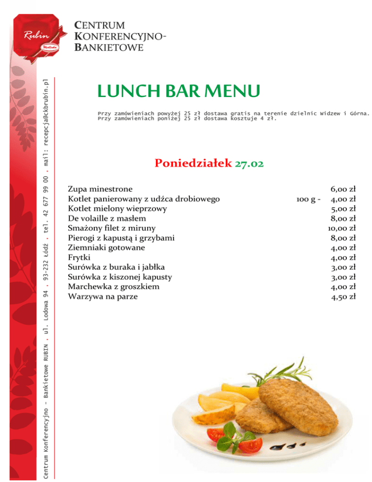 Centrum Konferencyjno - Bankietowe RUBIN . ul. Lodowa 94 . 93-232 Łódź . tel. 42 677 99 00 . mail: [email protected] LUNCH BAR MENU Przy zamówieniach powyżej 25 zł dostawa gratis na terenie dzielnic Widzew i Górna. Przy zamówieniach poniżej 25 zł dostawa kosztuje 4 zł. Poniedziałek 27.02 Zupa minestrone Kotlet panierowany z udźca drobiowego Kotlet mielony wieprzowy De volaille z masłem Smażony filet z miruny Pierogi z kapustą i grzybami Ziemniaki gotowane Frytki Surówka z buraka i jabłka Surówka z kiszonej kapusty Marchewka z groszkiem Warzywa na parze 6,00 zł 100 g - 4,00 zł 5,00 zł 8,00 zł 10,00 zł 8,00 zł 4,00 zł 4,00 zł 3,00 zł 3,00 zł 4,00 zł 4,50 zł Centrum Konferencyjno - Bankietowe RUBIN . ul. Lodowa 94 . 93-232 Łódź . tel. 42 677 99 00 . mail: [email protected] LUNCH BAR MENU Przy zamówieniach powyżej 25 zł dostawa gratis na terenie dzielnic Widzew i Górna. Przy zamówieniach poniżej 25 zł dostawa kosztuje 4 zł. Wtorek 28.02 Zupa meksykańska Karczek w sosie własnym Kotlet schabowy bez kości Filet drobiowy z ananasem Gołąbek z mięsem i ryżem Halibut smażony Łosoś parowany z masłem ziołowym Łosoś parowany z pieprzem cytrynowym Ziemniaki gotowane Ziemniaki opiekane Frytki Kasza gryczana Surówka z marchwi i pora Surówka z kiszonej kapusty Buraczki zasmażane Warzywa na parze 100 g 100 g 100 g 100 g - 6,00 zł 6,00 zł 9,00 zł 7,00 zł 6,00 zł 8,00 zł 9,99 zł 9,99 zł 4,00 zł 4,00 zł 4,00 zł 4,00 zł 3,00 zł 3,00 zł 4,00 zł 4,50 zł Centrum Konferencyjno - Bankietowe RUBIN . ul. Lodowa 94 . 93-232 Łódź . tel. 42 677 99 00 . mail: [email protected] LUNCH BAR MENU Przy zamówieniach powyżej 25 zł dostawa gratis na terenie dzielnic Widzew i Górna. Przy zamówieniach poniżej 25 zł dostawa kosztuje 4 zł. Środa 01.03 Barszcz zabielany Karczek w sosie własnym Schab w sosie własnym Schab w cieście francuskim z pieczarkami Filet z indyka Udko pieczone Łosoś parowany z masłem ziołowym Łosoś parowany z pieprzem cytrynowym Gołąbek z mięsem i ryżem Filet z morszczuka Ziemniaki gotowane Ziemniaki opiekane Frytki Surówka z czerwonej kapusty parzonej Surówka z kiszonej kapusty Buraczki zasmażane Warzywa na parze Kurczak z rożna cały 100 g 100 g 100 g 100 g 100 g 100 g – 100 g - 5,00 zł 6,00 zł 6,00 zł 6,00 zł 9,00 zł 5,00 zł 9,99 zł 9,99 zł 6,00 zł 6,00 zł 4,00 zł 4,00 zł 4,00 zł 3,00 zł 3,00 zł 4,00 zł 4,50 zł 20,00 zł Centrum Konferencyjno - Bankietowe RUBIN . ul. Lodowa 94 . 93-232 Łódź . tel. 42 677 99 00 . mail: [email protected] LUNCH BAR MENU Przy zamówieniach powyżej 25 zł dostawa gratis na terenie dzielnic Widzew i Górna. Przy zamówieniach poniżej 25 zł dostawa kosztuje 4 zł. Czwartek 02.03 Zupa pomidorowa z makaronem Karczek w sosie własnym Polędwiczka wieprzowa z pieczarką Kotlet ułański De volaille z masłem Halibut smażony Kotlet mielony drobiowy Ziemniaki opiekane Ziemniaki gotowane Kluski śląskie Frytki Surówka z pora Surówka z marchwi z chrzanem Surówka z kiszonej kapusty Warzywa na parze Kapusta zasmażana Kurczak z rożna 1/2 Kurczak z rożna cały 100 g 100 g 100 g - 5,00 zł 6,00 zł 9,00 zł 5,00 zł 8,00 zł 8,00 zł 5,00 zł 4,00 zł 4,00 zł 4,00 zł 4,00 zł 3,00 zł 3,00 zł 3,00 zł 4,50 zł 4,00 zł 10,00 zł 20,00 zł Centrum Konferencyjno - Bankietowe RUBIN . ul. Lodowa 94 . 93-232 Łódź . tel. 42 677 99 00 . mail: [email protected] LUNCH BAR MENU Przy zamówieniach powyżej 25 zł dostawa gratis na terenie dzielnic Widzew i Górna. Przy zamówieniach poniżej 25 zł dostawa kosztuje 4 zł. Piątek 03.03 Kapuśniak Schab z farszem pieczarkowym Zraz wieprzowy Panierowany filet z kurczaka Kotlet warzywny Dorsz smażony Pierogi z serem Ziemniaki opiekane Ziemniaki gotowane Frytki Kasza gryczana Surówka z marchwi z chrzanem Surówka z kiszonej kapusty Warzywa na parze Kapusta zasmażana Kurczak z rożna cały 5,00 zł 100 g - 5,50 zł 9,00 zł 8,00 zł 3,90 zł 100 g - 7,50 zł 8,00 zł 4,00 zł 4,00 zł 4,00 zł 4,00 zł 3,00 zł 3,00 zł 4,50 zł 4,00 zł 20,00 zł