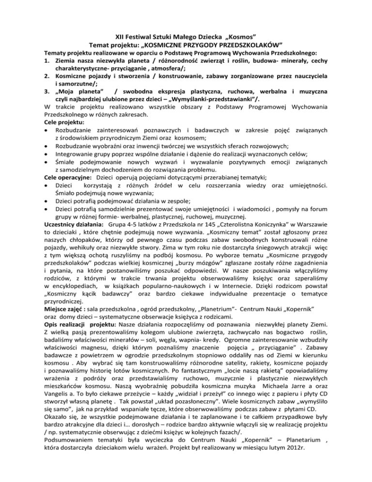 XII Festiwal Sztuki Małego Dziecka „Kosmos” Temat projektu: „KOSMICZNE PRZYGODY PRZEDSZKOLAKÓW” Tematy projektu realizowane w oparciu o Podstawę Programową Wychowania Przedszkolnego: 1. Ziemia nasza niezwykła planeta / różnorodność zwierząt i roślin, budowa- minerały, cechy charakterystyczne- przyciąganie , atmosfera/; 2. Kosmiczne pojazdy i stworzenia / konstruowanie, zabawy zorganizowane przez nauczyciela i samorzutne/; 3. „Moja planeta” / swobodna ekspresja plastyczna, ruchowa, werbalna i muzyczna czyli najbardziej ulubione przez dzieci – „Wymyślanki-przedstawianki”/. W trakcie projektu realizowano wszystkie obszary z Podstawy Programowej Wychowania Przedszkolnego w różnych zakresach. Cele projektu: Rozbudzanie zainteresowań poznawczych i badawczych w zakresie pojęć związanych z środowiskiem przyrodniczym Ziemi oraz kosmosem; Rozbudzanie wyobraźni oraz inwencji twórczej we wszystkich sferach rozwojowych; Integrowanie grupy poprzez wspólne działanie i dążenie do realizacji wyznaczonych celów; Śmiałe podejmowanie nowych wyzwań i wyzwalanie pozytywnych emocji związanych z samodzielnym dochodzeniem do rozwiązania problemu. Cele operacyjne: Dzieci operują pojęciami dotyczącymi przerabianej tematyki; Dzieci korzystają z różnych źródeł w celu rozszerzania wiedzy oraz umiejętności. Śmiało podejmują nowe wyzwania; Dzieci potrafią podejmować działania w zespole; Dzieci potrafią samodzielnie prezentować swoje umiejętności i wiadomości , pomysły na forum grupy w różnej formie- werbalnej, plastycznej, ruchowej, muzycznej. Uczestnicy działania: Grupa 4-5 latków z Przedszkola nr 145 „Czterolistna Koniczynka” w Warszawie to dzieciaki , które chętnie podejmują nowe wyzwania. „Kosmiczny temat” został zgłoszony przez naszych chłopaków, którzy od pewnego czasu podczas zabaw swobodnych konstruowali różne pojazdy, wehikuły oraz niezwykłe stwory. Zima w tym roku nie dostarczyła śniegowych atrakcji więc z tym większą ochotą ruszyliśmy na podbój kosmosu. Po wyborze tematu „Kosmiczne przygody przedszkolaków” podczas wielkiej kosmicznej „burzy mózgów” zgłaszane zostały różne zagadnienia i pytania, na które postanowiliśmy poszukać odpowiedzi. W nasze poszukiwania włączyliśmy rodziców, z którymi w trakcie trwania projektu obserwowaliśmy księżyc oraz szperaliśmy w encyklopediach, w książkach popularno-naukowych i w Internecie. Dzięki rodzicom powstał „Kosmiczny kącik badawczy” oraz bardzo ciekawe indywidualne prezentacje o tematyce przyrodniczej. Miejsce zajęć : sala przedszkolna , ogród przedszkolny, „Planetrium”- Centrum Nauki „Kopernik” oraz domy dzieci – systematyczne obserwacje księżyca z rodzicami. Opis realizacji projektu: Nasze działania rozpoczęliśmy od poznawania niezwykłej planety Ziemi. Z wielką pasją prezentowaliśmy kolegom ulubione zwierzęta, zachwycało nas bogactwo roślin, badaliśmy właściwości minerałów – soli, węgla, wapnia- kredy. Ogromne zainteresowanie wzbudziły właściwości magnesu, dzięki którym poznaliśmy znaczenie pojęcia „ przyciąganie” . Zabawy badawcze z powietrzem w ogrodzie przedszkolnym stopniowo oddaliły nas od Ziemi w kierunku kosmosu . Aby wybrać się tam konstruowaliśmy różnorodne satelity, rakiety, kosmiczne pojazdy i poznawaliśmy historię lotów kosmicznych. Po fantastycznym „locie naszą rakietą” opowiadaliśmy wrażenia z podróży oraz przedstawialiśmy ruchowo, muzycznie i plastycznie niezwykłych mieszkańców kosmosu. Naszą wyobraźnię pobudziła kosmiczna muzyka Michaela Jarre a oraz Vangelis a. To było ciekawe przeżycie – każdy „widział i przeżył” co innego więc z papieru i płyty CD stworzył własną planetę . Tak powstał „układ pozasłoneczny”. Wiele kosmicznych zabaw „wymyśliło się samo”, jak na przykład wspaniałe tęcze, które obserwowaliśmy podczas zabaw z płytami CD. Okazało się, że wszystkie podejmowane działania i te zaplanowane i te całkiem przypadkowe były bardzo atrakcyjne dla dzieci i… dorosłych – rodzice bardzo aktywnie włączyli się w realizację projektu / np. systematycznie obserwując z dziećmi księżyc w kolejnych fazach/. Podsumowaniem tematyki była wycieczka do Centrum Nauki „Kopernik” – Planetarium , która dostarczyła dzieciakom wielu wrażeń. Projekt był realizowany w miesiącu lutym 2012r. Nasze niektóre działania w ramach projektu „Kosmiczne przygody przedszkolaków” Zabawy magnesami Ile księżyców ma Ziemia? Wiemy, gdzie i jak szukać wiadomości o kosmosie. Janek nas nauczył, jak obserwować niebo. Nasz kosmiczny pojazd jest niezwykły nie tylko na zewnątrz ale i …. w środku. Teraz zbudujemy rakietę. Nie jest to łatwa spraw więc zrobimy ją razem. Oto „Butelkowiec 4” Pora na pierwszy lot rakietą. Odliczamy 10 , 9, 8, ……START! Każdy odważny po locie otrzymuje medal kosmonauty oraz opowiada o tym, co przeżył i widział. To bardzo ciekawe historie. Wiemy już , że w kosmosie są niezwykłe planety, śmieszne stworzenia, przedziwne rośliny. Można nawet usłyszeć muzykę gwiazd i porozmawiać z ufoludkiem – „ble, ble” i „gul, gul”. Dla wszystkich , którzy jeszcze tam nie byli, wykonaliśmy z papieru i płyt CD „NASZE PLANETY”. Jeśli chcecie dowiedzieć się o planetach czegoś więcej, zapraszamy do naszego przedszkola , chętnie Wam o nich opowiemy . A może razem wybierzemy się w następną kosmiczną podróż? Nie jest to wcale trudne. Wystarczy tylko otworzyć „magiczne oko wyobraźni”. Opracowanie : Małgorzata Adach i Renata Reszka Przedszkole nr 145 „Czterolistna Koniczynka” Warszawa ul Goszczyńskiego 17a Wyrażamy zgodę na publikację w/w opisanego projektu „Kosmiczne przygody przedszkolaków” opracowanego na XII Festiwal Sztuki Małego Dziecka „Kosmos” Małgorzata Adach Renata Reszka Warszawa dnia 06.04.2012r.