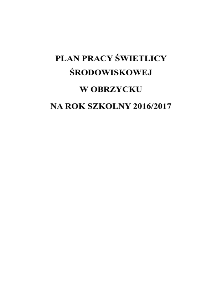 PLAN PRACY ŚWIETLICY ŚRODOWISKOWEJ W OBRZYCKU NA ROK SZKOLNY 2016/2017 WSTĘP Świetlica Środowiskowa w Obrzycku jest placówką wsparcia dziennego o profilu specjalistycznym funkcjonującą po południu. Uczestnikami Świetlicy Środowiskowej są dzieci i młodzież w wieku szkolnym zamieszkujące miasto Obrzycko. Celem Świetlicy jest zapewnienie kompleksowej pomocy dzieciom i młodzieży pochodzącej z rodzin funkcyjnych, dysfunkcyjnych, wspieranie prawidłowego rozwoju emocjonalnego dziecka, kształtowanie pozytywnych postaw i wartości oraz umiejętności funkcjonowania w społeczeństwie. Świetlica Środowiskowa czynna jest od poniedziałku do czwartku w godzinach od 16:00-18:00. Nauczycielami prowadzącymi zajęcia są mgr Łukasz Janc- nauczyciel języka polskiego oraz mgr Angelika Małecka – pedagog specjalny. Raz w miesiącu zajęcia prowadzi mgr Bożena Letkiewicz. Natomiast raz na kwartał zajęcia profilaktyczne prowadzi Marcin Charmaciński instruktor terapii uzależnień. Praca Świetlicy Środowiskowej opiera się na współpracy z domem rodzinnym podopiecznego oraz szkołami i innymi instytucjami w celu podejmowania działań dla dobra dziecka, poznanie środowiska podopiecznego oraz wymianie istotnych informacji na temat wychowanków i ich rodzin. Rekrutacja podopiecznych opiera się na indywidualnym naborze, na podstawie pisemnej zgody rodziców. Często dzieci zgłaszają się do placówki same, zachęcone przez innych podopiecznych Świetlicy. Zadania świetlicy: - organizowanie dzieciom czasu wolnego: pomoc w nauce, zabawy, zajęcia sportowe, wycieczki, aktywnego spędzania czasu oraz uczestnictwo w życiu kulturalnym i społecznym, - dbanie o rozwój zainteresowań i uzdolnień dzieci, - pomoc w kryzysach szkolnych, rodzinnych, rówieśniczych i osobistych, - organizowanie grupowej pracy z dziećmi i indywidualnej pracy z każdym dzieckiem, - prowadzenie zajęć socjoterapeutycznych, wspomagających rozwój emocjonalny, poznawczy i społeczny, - utrzymywanie kontaktów z rodziną dziecka, - zapewnienie opieki wychowawczej. 1. ORGANIZACJA PRACY Z DZIEĆMI SCHEMAT DNIA: 16:00-17;00 - pomoc przy odrabianiu lekcji, motywowanie do nauki, pracy 17: 00-17: 15 – podwieczorek 17: 15-18: 00 – gry i zabawy powiązane z częścią terapeutyczną (arteterapia, socjoterapia, zajęcia sportowe, ruchowe). 2. HARMONOGRAM PRACY MIESIĘCZNEJ 19.09.2016-22.09.2016 * Zajęcia wprowadzające: ustalenie zasad pracy w Świetlicy, przygotowanie regulaminu. * Zabawy integrujące grupę. * Czym jest przyjaźń?- praca w grupach. * Jak stworzyć zespół?- praca w grupach. 26.09.2016-29.09.2016 * Zajęcia plastyczne- wykonywanie przez dzieci jesiennych świeczników. * Zajęcia plastyczne- papierowe jeże. * Zajęcia kulinarne- zdrowe kanapki. * Zabawy ruchowe integrujące grupę. Październik 03.10.2016- 06.10.2016 * Zajęcia plastyczne wspólne wykonywanie gazetki w sali. * Czy istnieje przepis na miłość?- praca indywidualna, praca w grupach, swobodne rozmowy. * Zajęcia plastyczne wykonywanie jesiennych lampionów z doniczek. * Zajęcia integrujące grupę- wspólne zabawy przy wykorzystaniu gier planszowych. 10.10.2016- 13.10.2016 * Zajęcia plastyczne- wykonywanie przez dzieci kartek metodą quillingu z okazji Dnia Edukacji Narodowej. * Zajęcia kulinarne- wykonywanie przez dzieci sałatki warzywnej. * Zajęcia plastyczne- wykonywanie przez dzieci masek halloweenowych. * Zajęcia ruchowe integrujące grupę. 17.10.2016- 20.10.2016 * Praca plastyczna wykonywanie przez dzieci masek hallowenowych c.d. * Praca plastyczna wykonywanie przez dzieci lampionów. * Zajęcia kulinarne- coś słodkiego- naleśniki * Co robić, aby spełniać marzenia- rozmowy dzieci z prowadzącym, zadania w grupach. 24.10.2016- 27.10.2016 * Jak poznać swoje mocne strony?- zajęcia w grupach. * Hallowenowa zabawa w Świetlicy- zabawa integrująca grupę. * Ja wśród innych. Jak dać się lubić? Nabywanie umiejętności kulturalnego zachowania, rozwijanie umiejętności posługiwania się zwrotami grzecznościowymi. Moje zabawy z rówieśnikami. * Higiena odżywiania- co jemy? Kiedy? Dlaczego? Sałatka owocowa. Listopad/ Grudzień 02.11.2016-.03.11.2016 * Przygotowywanie prac na kiermasz świąteczny. - słoiczki, lampki, butelki- metodą decoupage. 05.11.2016- 08.11.2016 * Przygotowywanie prac na kiermasz świąteczny. - bombki, świeczniki. 12.11.2016- 15.11.2016 * Przygotowywanie prac na kiermasz świąteczny. ozdoby z masy solnej, choinki z patyków. *Gry i zabawy stolikowe. 19.11.2016- 22.11.2016 * Przygotowywanie prac na kiermasz świąteczny. - stroiki, świąteczne mydełka. * Zapoznanie dzieci ze zwyczajem andrzejkowym. * Zabawa andrzejkowa. 26.11.2016- 29.11.2016 * Przygotowywanie prac na kiermasz świąteczny. - kartki świąteczne, świeczki. * Odgadywanie i nazywanie uczuć – zabawa związana z pokazywaniem (mimika). Grudzień 05.12.2016- 08.12.2016 * Mikołajki- i ja mogę zostać świętym Mikołajem. Wykonywanie prezentu dla kolegi. * Moje zainteresowania. Pogadanka. *Przygotowania do kiermaszu- pakowanie wykonanych prac. 12.12.2016- 15.12.2016 * Kiermasz świąteczny. * Wykonywanie gazetki w Świetlicy. * Przygotowania do Wigilii. * Wspólna Wigilia z uczestnictwem rodziców.