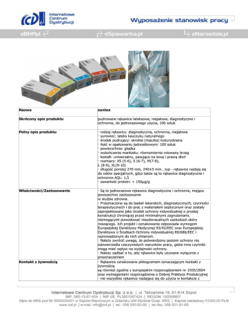 Nazwa santex Skrócony opis produktu pudrowane rękawice lateksowe, niejałowe, diagnostyczne i ochronne, do jednorazowego użycia, 100 sztuk Pełny opis produktu · rodzaj rękawicy: diagnostyczna, ochronna, niejałowa · surowiec: lateks kauczuku naturalnego · środek pudrujący: skrobia (mączka) kukurydziana · ilość w opakowaniu jednostkowym: 100 sztuk · powierzchnia: gładka · wykończenie mankietu: równomiernie rolowany brzeg · kształt: uniwersalny, pasujące na lewą i prawą dłoń · rozmiary: XS (5-6), S (6-7), M(7-8), L (8-9), XL(9-10) · długość poniżej 270 mm, 240±5 mm , typ - rękawice nadają się do celów specjalnych, gdyż także są to rękawice diagnostyczne i ochronne AQL: 1,5 · zawartość protein: < 150µg/g Właściwości/Zastosowanie · Są to jednorazowe rękawice diagnostyczne i ochronne, mające powszechne zastosowanie w służbie zdrowia. · Przeznaczone są do badań lekarskich, diagnostycznych, czynności terapeutycznych i do prac z materiałem septycznym oraz zostały zaprojektowane jako środek ochrony indywidualnej o prostej konstrukcji chroniącej przed minimalnymi zagrożeniami, niemogącymi powodować nieodwracalnych uszkodzeń skóry noszącego. Ich projekt i oznakowanie odpowiada wymogom Europejskiej Dyrektywy Medycznej 93/42/EEC oraz Europejskiej Dyrektywy o Środkach Ochrony indywidualnej 89/686/EEC i wprowadzonym do nich zmianom. · Należy zwrócić uwagę, że potwierdzony poziom ochrony nie odzwierciedla rzeczywistych warunków pracy, gdzie inne czynniki mogą mieć wpływ na wydajności ochrony. · Należy zadbać o to, aby rękawice były używane wyłącznie z przeznaczeniem · Rękawice oznakowane piktogramem oznaczającym kontakt z żywnością są również zgodne z europejskim rozporządzeniem nr 1935/2004 oraz wymaganiami rozporządzenia o Dobrej Praktyce Produkcyjnej · nie wszystkie rękawice nadające się do użycia w kontakcie z Kontakt z żywnością Przechowywanie Czyszczenie Środki ostrożności dotyczące użytkowania i wskazania Składniki/składniki niebezpieczne Piktogramy użyte na opakowaniu, a nie opisane w zharmonizowanych normach Utylizacja żywnością mogą być używane z każdym rodzajem żywności; niektóre rękawice mogą uwalniać zbyt wiele substancji do niektórych rodzajów żywności . Aby dowiedzieć się jakie ograniczenia mogą mieć zastosowanie oraz przy jakich konkretnych rodzajach żywności można używać rękawic, należy zwrócić się do firmy Mercator Medical · zalecane jest przechowywanie rękawicy w suchym miejscu, w temperaturze 5-30°C i chronienie przed oddziaływaniem światła słonecznego i fluorescencyjnego · zalecana wilgotność względna pomieszczania, w którym są przechowywane rękawice to 60+-20% · przechowywać rękawice w odległości nie mniejszej niż 1 m od urządzeń grzejnych · nie przechowywać w bezpośrednim sąsiedztwie rozpuszczalników, olejów, paliw, smarów · rękawice jednorazowe, nie podlegają czyszczeniu · podczas użytkowania rękawic należy stosować łagodne środki myjące i dezynfekcyjne, nie podrażniające skóry rąk · przed nałożeniem rękawic, zalecane jest dokładne osuszanie skóry rąk · po każdorazowym zdjęciu rękawic zlecane jest dokładne umycie rąk, osuszenie i zastosowanie kremu pielęgnacyjnego · należy używać min. 1 pary rękawic do jednego pacjenta i jednej procedury- rękawice jednorazowe · rękawice zanieczyszczone krwią lub płynami ustrojowymi powinny być usunięte jako odpad medyczny · gdy substancja chemiczna przedostanie się do skóry, należy ją natychmiast zmyć dużą ilością wody z dodatkiem mydła. · należy uważać, aby substancje chemiczne nie przedostały się do wnętrza rękawic przez mankiet · przed użyciem należy sprawdzić, czy rękawice nie mają wad lub innych niedoskonałości · w trakcie użytkowania, w przypadku przekłucia, pęknięcia, rozdarcia należy natychmiast zmienić rękawice · unikać rękawic zabrudzony od środka – mogą one wywoływać podrażnienia prowadzące do zapalenia skóry lub poważniejszych urazów · rękawic nie należy używać w styczności z otwartym ogniem oraz do ochrony przed wszelkiego ostrymi narzędziami · rękawice nie są przeznaczone do spawania, do ochrony przed porażeniem elektrycznym, promieniowaniem jonizującym, ani przed działaniem zimnych i gorących przedmiotów · · Niektóre rękawice mogą zawierać składniki, o których wiadomo, iż mogą być ewentualną przyczyną alergii u osób na nie uczulonych, u których mogą rozwijać się kontaktowe podrażnienia i/lub reakcja alergiczna · rękawice z lateksu kauczuku naturalnego- mogą powodować działania alergizujące, włączając reakcje anafilaktyczne · w przypadku wystąpienia reakcji alergicznej należy natychmiast zwrócić się o pomoc lekarską rękawice pudrowane mączką (skrobią) kukurydzianą 100 sztuk rękawic wg wagi Używane rękawice mogą być zanieczyszczone zakaźnymi lub innymi niebezpiecznymi sbstancjami. Należy się ich pozbyć zgodnie z obowiązującymi lokalnymi przepisami. Zakopywanie lub spalanie rękawic ależy przeprowadzać w warunkach kontrolowanych.