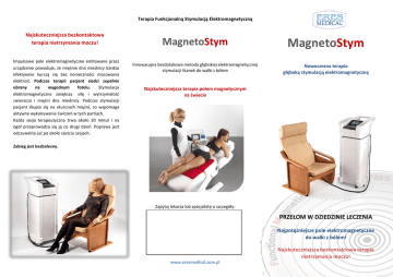 Terapia Funkcjonalną Stymulacją Elektromagnetyczną Najskuteczniejsza bezkontaktowa terapia nietrzymania moczu! Impulsowe pole elektromagnetyczne emitowane przez urządzenie powoduje, że mięśnie dna miednicy bardzo efektywnie kurczą się bez konieczności mocowania elektrod. Podczas terapii pacjent siedzi zupełnie ubrany na wygodnym fotelu. Stymulacja elektromagnetyczna zwiększa siłę i wytrzymałość zwieracza i mięśni dna miednicy. Podczas stymulacji pacjent skupia się na skurczach mięśni, co wspomaga aktywne wykonywanie ćwiczeń w tych partiach. Każda sesja terapeutyczna trwa około 20 minut i na ogół przeprowadza się ją co drugi dzień. Poprawa jest odczuwalna już po około sześciu sesjach. MagnetoStym MagnetoStym Innowacyjna bezdotykowa metoda głębokiej elektromagnetycznej stymulacji tkanek do walki z bólem Nowoczesna terapia głęboką stymulacją elektromagnetyczną Najskuteczniejsza terapia polem magnetycznym na świecie Zabieg jest bezbolesny. Zapytaj lekarza lub specjalistę o szczegóły: PRZEŁOM W DZIEDZINIE LECZENIA Najpotężniejsze pole elektromagnetyczne do walki z bólem! Najskuteczniejsza bezkontaktowa terapia nietrzymania moczu! www.eresmedical.com.pl JAK DZIAŁA GŁĘBOKA STYMULACJA ELEKTROMAGNETYCZNA? DLA KOGO? DLACZEGO STYMULACJA ELEKTROMAGNETYCZNA? Jeśli dotyka Cię jedna z poniższych dolegliwości – ta terapia jest dla Ciebie: Organizm ludzki z fizycznego punktu widzenia to zespół przewodników, półprzewodników i izolatorów, na które mają wpływ różne typy zewnętrznej energii, np. prąd, pole magnetyczne, światło, temperatura etc. Charakterystyczną cechą pola magnetycznego jest przenikanie przez wszystkie struktury ustroju. Cecha ta odróżnia pole magnetyczne od innych postaci energii, które ulegają pochłonięciu na niewielkiej głębokości tkanek. Głębokość efektywnej stymulacji polem elektromagnetycznym za pomocą urządzenia MagnetoSTYM sięga do 10cm. Indukcja ta jest około 150 razy większa od najmocniejszych stosowanych do tej pory aparatów do magnetoterapii. Skuteczny i szybki powrót do sprawności fizycznej Bezinwazyjne, bezbolesne zabiegi Bardzo wysoka skuteczność w leczeniu bólu stawów i mięśni Zabiegi na miejsca niedostępne dla innych terapii Możliwość wykonywania zabiegów przez ubrania z tkanin naturalnych Brak efektów ubocznych Bardzo szybki i trwały efekt - schorzenia kręgosłupa: np. ostry/przewlekły ból, rwa kulszowa, zmiany zwyrodnieniowe - zaburzenia układu nerwowego - zaburzenia układu mięśniowo-szkieletowego: np. zwyrodnienie stawów, zamrożony bark - rehabilitacja sportowa: osłabienie i zaniki mięśni - złamania oraz trudno gojące się rany i owrzodzenia troficzne JAK TO WYGLĄDA? - zaburzenia układu moczowo-płciowego: nietrzymanie moczu u kobiet - problemy z mięśniami dna miednicy Terapia aparatem MagnetoSTYM korzystnie wpływa na krążenie obwodowe, natlenowanie krwi, wzmożenie wymiany jonów oraz stymulację reakcji biochemicznych w organizmie. Dzięki temu znacznie przyspiesza odbudowę i regenerację tkanek. Terapeuta, za pomocą innowacyjnych rozwiązań aparatu, takich jak regulacja kształtu linii pola magnetycznego i częstotliwości impulsów od 1-80Hz, może znacznie lepiej dopasować parametry do indywidualnych potrzeb Pacjenta i jednocześnie skuteczniej zwalczyć źródło bólu. - problemy pooperacyjne i poporodowe u kobiet - problemy z prostatą i zaburzeniami erekcji u mężczyzn Ból kolana Ból barku Przeciwwskazania dla terapii: Osłabienie i zanik mięśni Nietrzymanie moczu – terapia bezkontaktowa ciąża, choroba nowotworowa, czynna gruźlica płuc, ciężkie infekcje pochodzenia wirusowego, bakteryjnego i grzybiczego, obecność elektronicznych implantów wspomagających pracę różnych narządów.