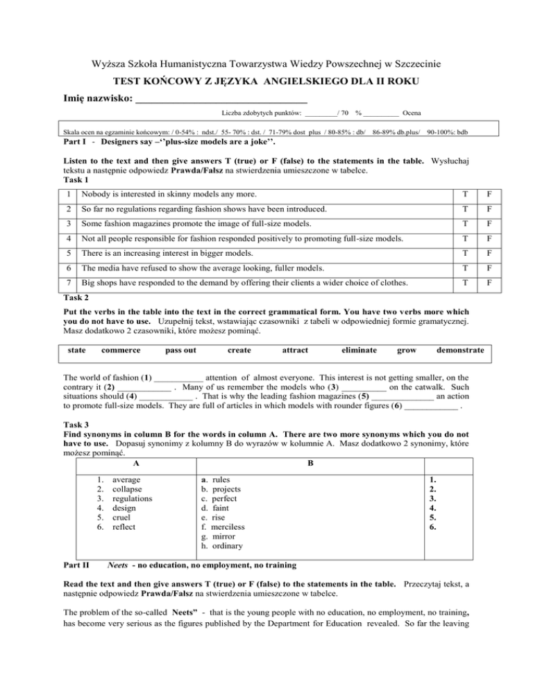Wyższa Szkoła Humanistyczna Towarzystwa Wiedzy Powszechnej w Szczecinie TEST KOŃCOWY Z JĘZYKA ANGIELSKIEGO DLA II ROKU Imię nazwisko: ________________________________ Liczba zdobytych punktów: _________/ 70 % __________ Ocena Skala ocen na egzaminie końcowym: / 0-54% : ndst./ 55- 70% : dst. / 71-79% dost plus / 80-85% : db/ 86-89% db.plus/ 90-100%: bdb Part I - Designers say –‘’plus-size models are a joke’’. Listen to the text and then give answers T (true) or F (false) to the statements in the table. Wysłuchaj tekstu a następnie odpowiedz Prawda/Fałsz na stwierdzenia umieszczone w tabelce. Task 1 1 Nobody is interested in skinny models any more. T F 2 So far no regulations regarding fashion shows have been introduced. T F 3 Some fashion magazines promote the image of full-size models. T F 4 Not all people responsible for fashion responded positively to promoting full-size models. T F 5 There is an increasing interest in bigger models. T F 6 The media have refused to show the average looking, fuller models. T F 7 Big shops have responded to the demand by offering their clients a wider choice of clothes. T F Task 2 Put the verbs in the table into the text in the correct grammatical form. You have two verbs more which you do not have to use. Uzupełnij tekst, wstawiając czasowniki z tabeli w odpowiedniej formie gramatycznej. Masz dodatkowo 2 czasowniki, które możesz pominąć. state commerce pass out create attract eliminate grow demonstrate The world of fashion (1) ___________ attention of almost everyone. This interest is not getting smaller, on the contrary it (2) ____________ . Many of us remember the models who (3) __________ on the catwalk. Such situations should (4) ____________ . That is why the leading fashion magazines (5) ______________ an action to promote full-size models. They are full of articles in which models with rounder figures (6) ____________ . Task 3 Find synonyms in column B for the words in column A. There are two more synonyms which you do not have to use. Dopasuj synonimy z kolumny B do wyrazów w kolumnie A. Masz dodatkowo 2 synonimy, które możesz pominąć. A B 1. 2. 3. 4. 5. 6. Part II average collapse regulations design cruel reflect a. b. c. d. e. f. g. h. rules projects perfect faint rise merciless mirror ordinary 1. 2. 3. 4. 5. 6. Neets - no education, no employment, no training Read the text and then give answers T (true) or F (false) to the statements in the table. Przeczytaj tekst, a następnie odpowiedz Prawda/Fałsz na stwierdzenia umieszczone w tabelce. The problem of the so-called Neets” - that is the young people with no education, no employment, no training, has become very serious as the figures published by the Department for Education revealed. So far the leaving age for all young people in England has been 16, however, from September 2013, all 17-year-olds in England will have to stay in education, training or an apprenticeship scheme. And from September 2015 this becomes compulsory for all 18-year-olds. According to the spokesman for the Department for Education, this is done to narrow the gap between the richest and poorest and give all young people, regardless of their background, the best opportunities to progress their careers. However, it has been suggested by a committee of MPs who want to copy a model from Holland that the Neets should not receive state benefits if they are not working, training or in education. This project is aimed at reducing the number of young people staying at home and doing nothing. Looking at the results of such a policy in Holland, where the numbers of young people without jobs are quite low, they are sure that generous benefits systems should be offered to these young people who are willing to start education, training or work. Being described as the Neets gives a young person a kind of a stigma which does not help him or her to progress and get a better life. Unfortunately it has been stated that the previous government did very little to improve the situation of those young people. What is more, many colleges have suffered damaging cuts in expenses, the costs of education have increased which prevented many young people who wanted to study, from getting into a course. All of this makes it very difficult for the young people to get a job as without the necessary skills they are left with no chance to improve their situation. Task 1 1 The Department for Education is going to publish the results of the study. T F 2 Until today the school leaving age has been 16. T F 3 All 18-year-olds will have to stay in school from October 2015. T F 4 The authorities are doing their best to help the poorer students. T F 5 Some politicians want to change the system of benefits for young unemployed people. T F 6 France is the country which is an example of good policy towards young people. T F 7 The name Neets has no positive meaning. T F Task 2 Put the verbs in the table into the text in the correct grammatical form. You have two verbs more which you do not have to use. Uzupełnij tekst, wstawiając czasowniki z tabeli w odpowiedniej formie gramatycznej. Masz dodatkowo 3 czasowniki, które możesz pominąć. narrow progress suggest copy receive publish reveal stop throw According to the report which (1) ___________ by the DfE, the situation of young people in England is dramatic. It (2) __________ the real numbers of those not studying or working. There are proposals to raise the age of school leavers to give them better education and in this way (3) __________ their careers. Some politicians claim that if they are not in education or training they should not (4) ________ any benefits. By (5) ___________ this they want to motivate them to do something. They want (6) _________ an example of one European country where the problem of young people’s unemployment has been successfully dealt with. Task 3 (zadania 3) Match the beginnings of the sentences in column A with their endings in column B. zdań 