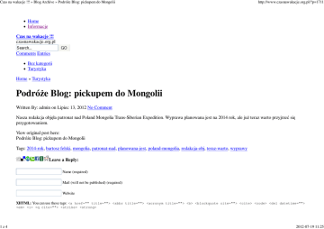 Czas na wakacje !!! » Blog Archive » Podró e Blog: pickupem do Mongolii http://www.czasnawakacje.org.pl/?p=1711 Home Informacje Czas na wakacje !!! czasnawakacje.org.pl Comments Entries Bez kategorii Turystyka Home » Turystyka Podró e Blog: pickupem do Mongolii Written By: admin on Lipiec 13, 2012 No Comment Nasza redakcja obj ła patronat nad Poland Mongolia Trans-Siberian Expedition. Wyprawa planowana jest na 2014 rok, ale ju teraz warto przyjrze si przygotowaniom. View original post here: Podró e Blog: pickupem do Mongolii Tags: 2014-rok, bartosz felski, mongolia, patronat-nad, planowana-jest, poland-mongolia, redakcja-obj, teraz-warto, wyprawy Leave a Reply: Name (required) Mail (will not be published) (required) Website XHTML: You can use these tags: <a href="" title=""> <abbr title=""> <acronym title=""> <b> <blockquote cite=""> <cite> <code> <del datetime=""> <em> <i> <q cite=""> <strike> <strong> 1z4 2012-07-19 11:25 Czas na wakacje !!! » Blog Archive » Podró e Blog: pickupem do Mongolii http://www.czasnawakacje.org.pl/?p=1711 Categories Recent Popular Bez kategorii Turystyka Burgas: zamach terrorystyczny na izraelskich turystów Tajlandia: o 31 procent wi cej turystów Sky Club podsumowuje i apeluje Górno wprowadza opłat klimatyczn wi tokrzyski serial ma obsad 2z4 2012-07-19 11:25 Czas na wakacje !!! » Blog Archive » Podró e Blog: pickupem do Mongolii http://www.czasnawakacje.org.pl/?p=1711 Zaproszenie na debat o polskich organizatorach turystyki wyjazdowej Podró do Chin na China Expo Poland US Airways podnosi ceny za baga by zrówna si z konkurencj SPA wa nym czynnikiem wyboru hotelu dla podró uj cych obywateli Chin empiktravel.pl – turystyczna odsłona Empiku Kategorie Bez kategorii Turystyka Archiwa Lipiec 2012 Czerwiec 2012 Maj 2012 Kwiecie 2012 Marzec 2012 Luty 2012 Stycze 2012 Grudzie 2011 Listopad 2011 Pa dziernik 2011 Wrzesie 2011 Sierpie 2011 Lipiec 2011 Lipiec 2012 P W C P S N 1 2 3 4 5 6 7 8 9 10 11 12 13 14 15 « cze 3z4 2012-07-19 11:25 Czas na wakacje !!! » Blog Archive » Podró e Blog: pickupem do Mongolii http://www.czasnawakacje.org.pl/?p=1711 P W C P S N 16 17 18 19 20 21 22 23 24 25 26 27 28 29 30 31 « cze Meta Zaloguj si Polecamy Monthly Archives Lipiec 2012 Czerwiec 2012 Maj 2012 Kwiecie 2012 Marzec 2012 Luty 2012 Stycze 2012 Grudzie 2011 Listopad 2011 Pa dziernik 2011 Wrzesie 2011 Sierpie 2011 Lipiec 2011 Most Commented RSS Feeds Subscribe to our feed and stay updated. 4z4 2012-07-19 11:25