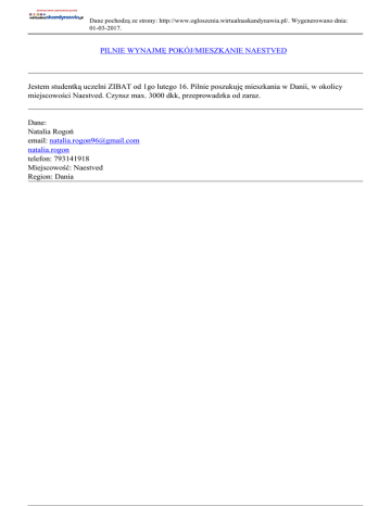 Dane pochodzą ze strony: http://www.ogloszenia.wirtualnaskandynawia.pl/. Wygenerowano dnia: 01-03-2017. PILNIE WYNAJMĘ POKÓJ/MIESZKANIE NAESTVED Jestem studentką uczelni ZIBAT od 1go lutego 16. Pilnie poszukuję mieszkania w Danii, w okolicy miejscowości Naestved. Czynsz max. 3000 dkk, przeprowadzka od zaraz. Dane: Natalia Rogoń email: [email protected] natalia.rogon telefon: 793141918 Miejscowość: Naestved Region: Dania