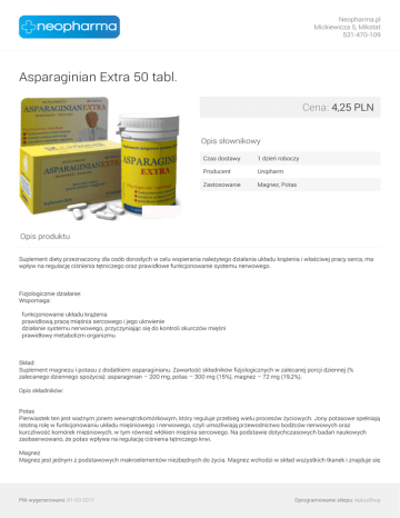 Neopharma.pl Mickiewicza 5, Mikstat 531-470-109 Asparaginian Extra 50 tabl. Cena: 4,25 PLN Opis słownikowy Czas dostawy 1 dzień roboczy Producent Unipharm Zastosowanie Magnez, Potas Opis produktu Suplement diety przeznaczony dla osób dorosłych w celu wspierania należytego działania układu krążenia i właściwej pracy serca, ma wpływ na regulację ciśnienia tętniczego oraz prawidłowe funkcjonowanie systemu nerwowego. Fizjologicznie działanie: Wspomaga: funkcjonowanie układu krążenia prawidłową pracę mięśnia sercowego i jego ukrwienie działanie systemu nerwowego, przyczyniając się do kontroli skurczów mięśni prawidłowy metabolizm organizmu Skład: Suplement magnezu i potasu z dodatkiem asparaginianu. Zawartość składników fizjologicznych w zalecanej porcji dziennej (% zalecanego dziennego spożycia): asparaginian – 200 mg, potas – 300 mg (15%), magnez – 72 mg (19,2%). Opis składników: Potas Pierwiastek ten jest ważnym jonem wewnątrzkomórkowym, który reguluje przebieg wielu procesów życiowych. Jony potasowe spełniają istotną rolę w funkcjonowaniu układu mięśniowego i nerwowego, czyli umożliwiają przewodnictwo bodźców nerwowych oraz kurczliwość komórek mięśniowych, w tym również włókien mięśnia sercowego. Na podstawie dotychczasowych badań naukowych zaobserwowano, że potas wpływa na regulację ciśnienia tętniczego krwi. Magnez Magnez jest jednym z podstawowych makroelementów niezbędnych do życia. Magnez wchodzi w skład wszystkich tkanek i znajduje się Plik wygenerowano: 01-03-2017 Oprogramowanie sklepu: AptusShop Neopharma.pl Mickiewicza 5, Mikstat 531-470-109 przede wszystkim wewnątrz komórek. Wspomaga przebieg wielu procesów życiowych, które nieustannie zachodzą w żywych organizmach. Bierze udział w reakcjach wytwarzania związków wysokoenergetycznych magazynujących energię niezbędną do życia oraz w syntezie DNA. Bierze udział w regulacji układu nerwowego sterującego pracą mięśni, w tym mięśnia sercowego. Jego przemiana jest ściśle powiązana z przemianą wapnia. Magnez hamuje również uwalnianie z zakończeń nerwowych – adrenaliny i neoadrenaliny. Czy wiesz że…. Adrenalina i neoadrenalina są nazywane „hormonami stresu”. Nadmiar tych hormonów podnosi ciśnienie krwi, zwęża naczynia, przyśpiesza czynność serca, wpływa na pracę oskrzeli i przewodu pokarmowego, podnosi stężenie glukozy we krwi, sprzyja zwiększonej wrażliwości na stres. Asparaginian – zwiększa przyswajalność magnezu i potasu. Zawartość opakowania: 50 tabletek do połykania 0,7 g. Dawkowanie: Zalecana porcja dzienna – 1 tabletka tylko dwa razy dziennie Już dwie tabletki dziennie przyczyniają się do poprawy pracy serca i jego ukrwienia, równowagi elektrolitycznej i procesów metabolicznych oraz kontroli skurczów mięśni. Plik wygenerowano: 01-03-2017 Powered by TCPDF (www.tcpdf.org) Oprogramowanie sklepu: AptusShop