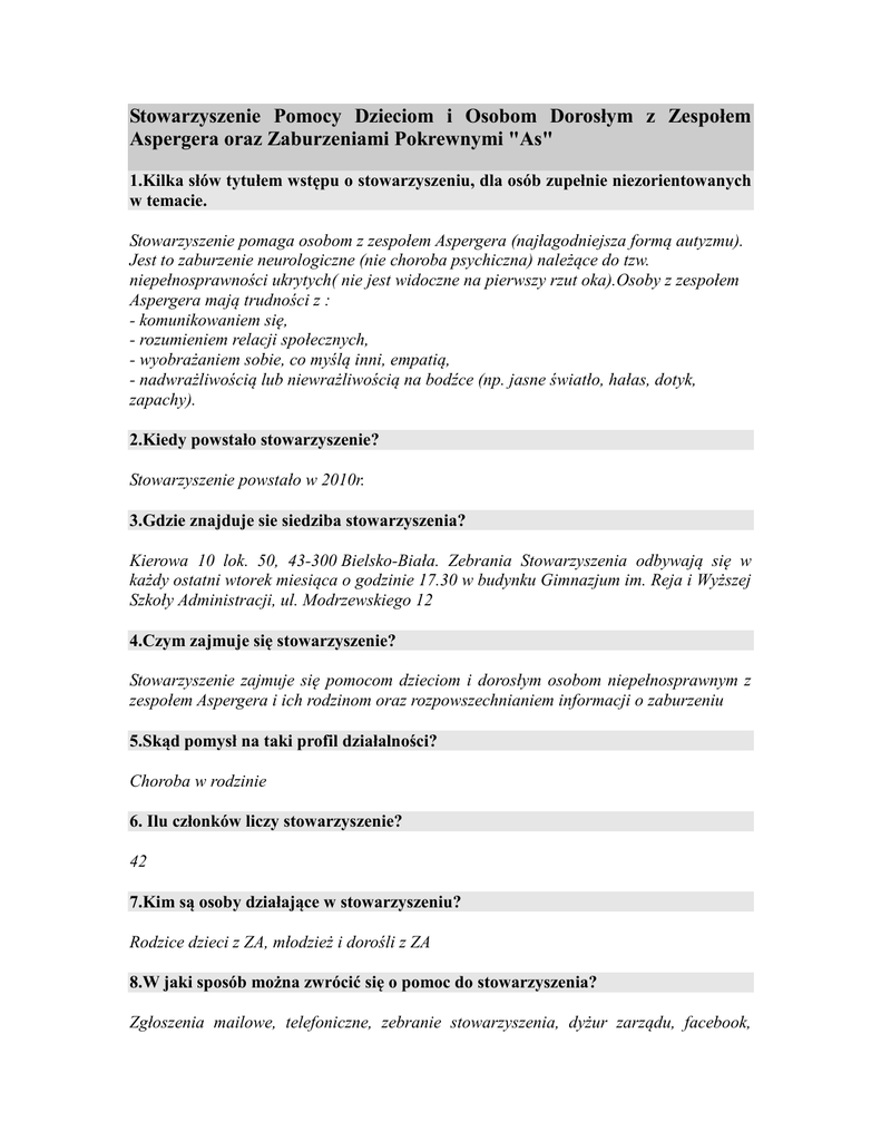 Stowarzyszenie Pomocy Dzieciom i Osobom Dorosłym z Zespołem Aspergera oraz Zaburzeniami Pokrewnymi "As" 1.Kilka słów tytułem wstępu o stowarzyszeniu, dla osób zupełnie niezorientowanych w temacie. Stowarzyszenie pomaga osobom z zespołem Aspergera (najłagodniejsza formą autyzmu). Jest to zaburzenie neurologiczne (nie choroba psychiczna) należące do tzw. niepełnosprawności ukrytych( nie jest widoczne na pierwszy rzut oka).Osoby z zespołem Aspergera mają trudności z : - komunikowaniem się, - rozumieniem relacji społecznych, - wyobrażaniem sobie, co myślą inni, empatią, - nadwrażliwością lub niewrażliwością na bodźce (np. jasne światło, hałas, dotyk, zapachy). 2.Kiedy powstało stowarzyszenie? Stowarzyszenie powstało w 2010r. 3.Gdzie znajduje sie siedziba stowarzyszenia? Kierowa 10 lok. 50, 43-300 Bielsko-Biała. Zebrania Stowarzyszenia odbywają się w każdy ostatni wtorek miesiąca o godzinie 17.30 w budynku Gimnazjum im. Reja i Wyższej Szkoły Administracji, ul. Modrzewskiego 12 4.Czym zajmuje się stowarzyszenie? Stowarzyszenie zajmuje się pomocom dzieciom i dorosłym osobom niepełnosprawnym z zespołem Aspergera i ich rodzinom oraz rozpowszechnianiem informacji o zaburzeniu 5.Skąd pomysł na taki profil działalności? Choroba w rodzinie 6. Ilu członków liczy stowarzyszenie? 42 7.Kim są osoby działające w stowarzyszeniu? Rodzice dzieci z ZA, młodzież i dorośli z ZA 8.W jaki sposób można zwrócić się o pomoc do stowarzyszenia? Zgłoszenia mailowe, telefoniczne, zebranie stowarzyszenia, dyżur zarządu, facebook, strona internetowa (aktualnie w budowie) 9.Jak wygląda codzienna praca w stowarzyszeniu? Przekazywanie wiadomości drogą mailową, odpowiadanie na listy, porady telefoniczne, kluby zainteresowań dla niepełnosprawnych, interwencje w szkołach 10.Od czasu powstania stowarzyszenia w 2010 roku zrealizowanych zostało kilka projektów. Które z nich są najważniejsze i dlaczego? Cykl spotkań rodziców ze specjalistami, arteterapia 11.Jakie stowarzyszenie ma pomysły na przyszłe projekty? 1.terapia 2.szkolenia 3.zatrudnianie 4.współpraca z innymi ngo 12.Gdzie można śledzić aktualne projekty stowarzyszenia? Facebook - www.facebook.com/Stowarzyszenieas/info wkrótce na stronie internetowej (w budowie) 14.Jakie korzyści płyną ze współpracy ze stowarzyszeniem? Aktualna wiedza medyczna, terapie, zajęcia dodatkowe, szkolenia 15.Jakie są największe przeszkody w funkcjonowaniu podmiotu? Brak przeszkolonych terapeutów, brak psychiatrów, a co za tym idzie błędne diagnozy 16.Czy nie czujecie nieraz zniechęcenia? Nie 17.Co jest bolączką trzeciego sektora? Nie jesteśmy dobrze postrzegani przez społeczeństwo Stowarzyszenie Pomocy Dzieciom i Osobom Dorosłym z Zespołem Aspergera oraz Zaburzeniami Pokrewnymi "As" Krajowy Rejestr Sądowy - nr KRS: 0000390203 Główny Urząd Statystyczny - nr REGON: 242625422 Urząd Skarbowy - nr NIP: 937-26-55-251 Forma prawna: stowarzyszenie Adres: Kierowa 10 lok. 50, 43-300 Bielsko-Biała, województwo: śląskie Kontakt: tel.: 692 275 462 E-mail: [email protected] Strona internetowa: w budowie Obszary działań: Przezwyciężanie trudnych sytuacji życiowych, działalność wspierająca Działalność na rzecz osób niepełnosprawnych Przeciwdziałanie bezrobociu, rozwój gospodarczy Działalność na rzecz integracji i reintegracji zawodowej i społecznej osób zagrożonych wykluczeniem społecznym Cele statutowe: inicjowanie i prowadzenie różnych form pomocy osobom niepełnosprawnym z Zespołem Aspergera i zaburzeniami pokrewnymi oraz ich rodzin w sprawach dotyczących ochrony i poprawy zdrowia, rehabilitacji, edukacji i podnoszenia sprawności fizycznej, poprawy warunków socjalnych, ich sytuacji materialnej i adaptacji w społeczeństwie; wspieranie instytucji zajmujących się kształceniem, wychowywaniem i opieką nad osobami z Zespołem Aspergera i zaburzeniami pokrewnymi; działalność charytatywna; ochrona i promocja zdrowia; podejmowanie działań na rzecz osób niepełnosprawnych; działalność wspomagająca rozwój wspólnot i społeczności lokalnych; działalność naukowa, badawcza, edukacja, oświata i wychowanie; przeciwdziałanie patologiom społecznym; promocja i organizacja wolontariatu; działalność wspomagająca technicznie, szkoleniowo, informacyjnie lub finansowo organizacje pozarządowe; pozyskiwanie środków finansowych oraz materialnych służących realizacji celów Stowarzyszenia. Liderzy bielskich organizacji pozarządowych IMIĘ: Monika NAZWISKO: Kłeczek WIEK: ok.50 WYKSZTAŁCENIE: wyższe ZAWÓD: tłumacz przysięgły REPREZENTOWANY PODMIOT ES: Stowarzyszenie Pomocy Dzieciom i Osobom Dorosłym z Zespołem Aspergera oraz Zaburzeniami Pokrewnymi AS FUNKCJA W PODMIOCIE ES: Prezes MOTTO ŻYCIOWE: Nie gadanie a działanie 1.Od kiedy Pani działa w trzecim sektorze? Od zawsze 2.Co wnosi w życie codzienne działanie w organizacji pozarządowej? Satysfakcję 3.Jaki jest Pani największy sukces? Założenie stowarzyszenia 4.Skąd czerpie Pani energię i inspirację do pracy społecznej? Z pomagania niepełnosprawnym, z terapii (perpetum mobile) 5.Czy jest Pani osobą spełnioną? No...coś jeszcze do zrobienia mam 6.Co chciałby Pani zmienić w funkcjonowaniu rzeczywistości bielskich NGO-ów? Wspólne działania, platforma porozumienia, mniej dla sportu więcej na niepełnosprawnych (pieniędzy od miasta), dobra współpraca samorządu z ngo na przykładach innych miast 7.O czym Pani marzy? O lekarstwie na Aspergera (może byłoby mniej naukowców i artystów, ale może nikt by tego nie zauważył) Opinia na temat Inkubatora Społecznej Przedsiębiorczości w BB: 1.Czy ISP jest potrzebny w Bielsku-Białej, prosimy o krótkie uzasadnienie? Tak! Ngo w Bielsku słabo się rozwija. Jest zauważalny mały dostęp do informacji. 2.Co stowarzyszenie zyskało dzięki funkcjonowaniu ISP w BB? Braliśmy udział w szkoleniach, w wizycie studyjnej, spotkaniu wigil