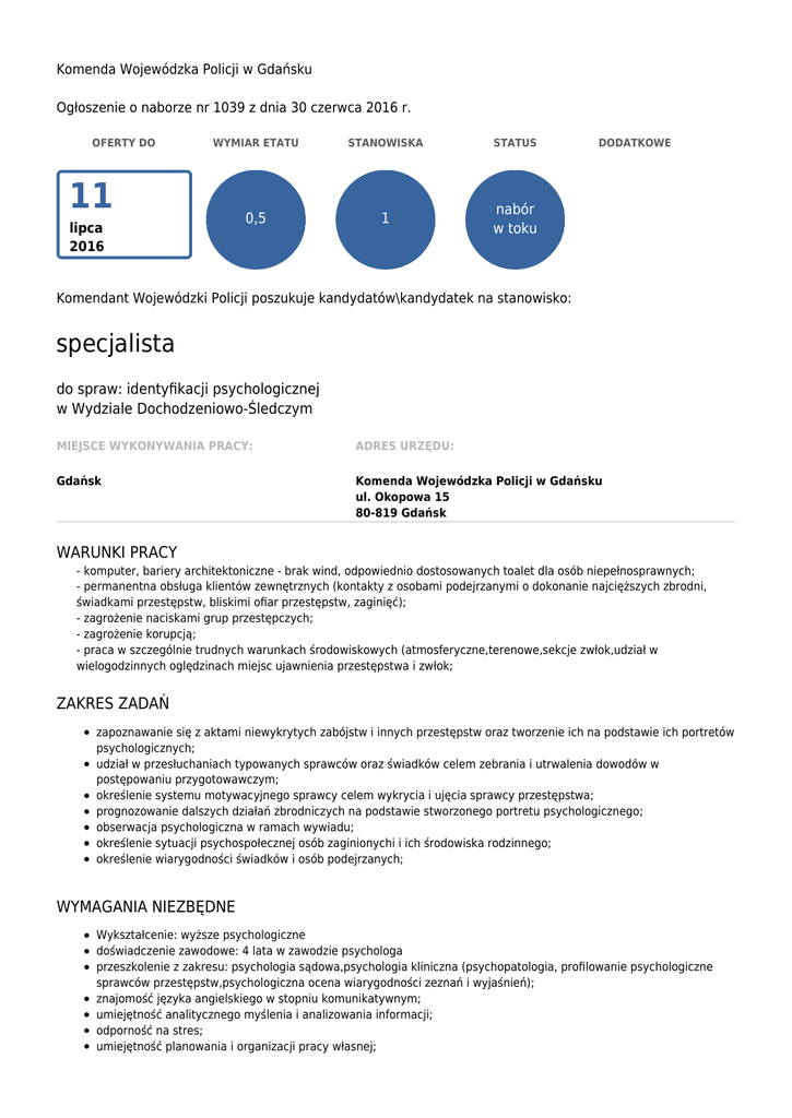 Komenda Wojewódzka Policji w Gdańsku Ogłoszenie o naborze nr 1039 z dnia 30 czerwca 2016 r. OFERTY DO WYMIAR ETATU STANOWISKA STATUS 0,5 1 nabór w toku 11 lipca 2016 DODATKOWE Komendant Wojewódzki Policji poszukuje kandydatów\kandydatek na stanowisko: specjalista do spraw: identyfikacji psychologicznej w Wydziale Dochodzeniowo-Śledczym MIEJSCE WYKONYWANIA PRACY: ADRES URZĘDU: Gdańsk Komenda Wojewódzka Policji w Gdańsku ul. Okopowa 15 80-819 Gdańsk WARUNKI PRACY - komputer, bariery architektoniczne - brak wind, odpowiednio dostosowanych toalet dla osób niepełnosprawnych; - permanentna obsługa klientów zewnętrznych (kontakty z osobami podejrzanymi o dokonanie najcięższych zbrodni, świadkami przestępstw, bliskimi ofiar przestępstw, zaginięć); - zagrożenie naciskami grup przestępczych; - zagrożenie korupcją; - praca w szczególnie trudnych warunkach środowiskowych (atmosferyczne,terenowe,sekcje zwłok,udział w wielogodzinnych oględzinach miejsc ujawnienia przestępstwa i zwłok; ZAKRES ZADAŃ zapoznawanie się z aktami niewykrytych zabójstw i innych przestępstw oraz tworzenie ich na podstawie ich portretów psychologicznych; udział w przesłuchaniach typowanych sprawców oraz świadków celem zebrania i utrwalenia dowodów w postępowaniu przygotowawczym; określenie systemu motywacyjnego sprawcy celem wykrycia i ujęcia sprawcy przestępstwa; prognozowanie dalszych działań zbrodniczych na podstawie stworzonego portretu psychologicznego; obserwacja psychologiczna w ramach wywiadu; określenie sytuacji psychospołecznej osób zaginionychi i ich środowiska rodzinnego; określenie wiarygodności świadków i osób podejrzanych; WYMAGANIA NIEZBĘDNE Wykształcenie: wyższe psychologiczne doświadczenie zawodowe: 4 lata w zawodzie psychologa przeszkolenie z zakresu: psychologia sądowa,psychologia kliniczna (psychopatologia, profilowanie psychologiczne sprawców przestępstw,psychologiczna ocena wiarygodności zeznań i wyjaśnień); znajomość języka angielskiego w stopniu komunikatywnym; umiejętność analitycznego myślenia i analizowania informacji; odporność na stres; umiejętność planowania i organizacji pracy własnej; samodzielność,systematyczność,odpowiedzialność,umiejętność dzielenia się informacjami i wiedzą; poświadczenie bezpieczeństwa uprawniającego do dostępu do informacji niejawnych oznaczonych klauzulą "poufne" lub wyrażenie zgody na przeprowadzenie postępowania sprawdzającego zgodnie z ustawą z dnia 5 sierpnia 2010 r. o ochronie informacji niejawnych (Dz. U. Nr 182, poz. 1228 ze zm.), Posiadanie obywatelstwa polskiego WYMAGANIA DODATKOWE staż pracy: 6 miesięcy w Regionalnym Ośrodku Psychiatrii Sądowej lub innym o podobnym charakterze, biegły psycholog sądowy prawo jazdy kat. B znajomość podstaw procedury karnej; znajomość języka niemieckiego na poziomie komunikatywnym; poświadczenie bezpieczeństwa uprawniającego do dostępu do informacji niejawnych oznaczonych klauzulą "tajne", ściśle tajne" lub wyrażenie zgody na przeprowadzenie postępowania sprawdzającego zgodnie z ustawą z dnia 5 sierpnia 2010 r. o ochronie informacji niejawnych (Dz. U. Nr 182, poz. 1228 ze zm.), DOKUMENTY I OŚWIADCZENIA NIEZBĘDNE Życiorys/CV i list motywacyjny Kopie dokumentów potwierdzających spełnienie wymagania niezbędnego w zakresie wykształcenia Kopie dokumentów potwierdzających spełnienie wymagania niezbędnego w zakresie doświadczenia zawodowego / stażu pracy kopia poświadczenia bezpieczeństwa uprawniającego do dostępu do informacji niejawnych oznaczonych klauzulą "poufne" lub oświadczenie o wyrażeniu zgody na przeprowadzenie postępowania sprawdzającego zgodnie z ustawą z dnia 5 sierpnia 2010 r. o ochronie informacji niejawnych (Dz. U. Nr 182, poz. 1228 ze zm.), Oświadczenie o posiadaniu obywatelstwa polskiego albo kopia dokumentu potwierdzającego posiadanie polskiego obywatelstwa Oświadczenie o wyrażeniu zgody na przetwarzanie danych osobowych do celów naboru DOKUMENTY I OŚWIADCZENIA DODATKOWE Kopie dokumentów potwierdzających spełnienie wymagania dodatkowego w zakresie doświadczenia zawodowego / stażu pracy kopia poświadczenia bezpieczeństwa uprawniającego do dostępu do informacji niejawnych oznaczonych klauzulą "tajne", "ściśle tajne" lub oświadczenie o wyrażeniu zgody na przeprowadzenie postępowania sprawdzającego zgodnie z ustawą z dnia 5 sierpnia 2010 r. o ochronie informacji niejawnych (Dz. U. Nr 182, poz. 1228 ze zm.), kserokopia prawa jazdy TERMINY I MIEJSCE SKŁADANIA DOKUMENTÓW Dokumenty należy złożyć do: 11 lipca 2016 r. Decyduje data: stempla pocztowego / osobistego dostarczenia oferty do urzędu Miejsce składania dokumentów: Komenda Wojewódzka Policji w Gdańsku Okopowa 15 80-819 Gdańsk INNE INFORMACJE: W miesiącu poprzedzającym datę upublicznienia ogłoszenia wskaźnik zatrudnienia osób niepełnosprawnych w urzędzie, w rozumieniu przepisów o rehabilitacji zawodowej i społecznej oraz zatrudnianiu osób niepełnosprawnych, wynosi co najmniej 6%. Proponowane wynagrodzenie: ok. 1 400,00 zł brutto plus prawo do dodatku z tytułu wysługi lat. Oferty odrzucone zostaną komisyjnie zniszczone. Oferty nie spełniające wymogów formalnych, niepodpisane, niekompletne, z brakiem wskazania konkretnego wydziału i stanowiska, przesłane po terminie nie będą rozpatrywane!!! Kandydaci nie zakwalifikowani nie będą powiadamiani telefonicznie ani pisemnie. W przypadku dużej ilości ofert przewidujemy przeprowadzenie testu wiedzy lub umiejętności. Oferty należy składać od poniedziałku do piątku w godzinach od 8:00 do 15:00 w KWP w Gdańsku, w recepcji lub przesyłać listownie. Komenda Wojewódzka Policji w Gdańsku nie ponosi odpowiedzialności za kopiowanie treści ogłoszeń i umieszczenie ich na innych portalach internetowych. Komenda Wojewódzka Policji w Gdańsku ponosi odpowiedzialność tylko i wyłącznie za treść ogłoszeń umieszczonyc