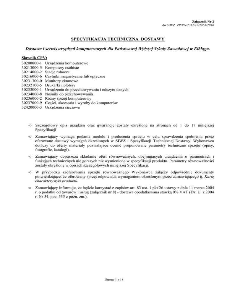 Załącznik Nr 2 do SIWZ ZP/PN/2312/17/2865/2010 SPECYFIKACJA TECHNICZNA DOSTAWY Dostawa i serwis urządzeń komputerowych dla Państwowej WyŜszej Szkoły Zawodowej w Elblągu. Słownik CPV: 30200000-1 Urządzenia komputerowe 30213000-5 Komputery osobiste 30214000-2 Stacje robocze 30216000-6 Czytniki magnetyczne lub optyczne 30231300-0 Monitory ekranowe 30232100-5 Drukarki i plotery 30233000-1 Urządzenia do przechowywania i odczytu danych 30234000-8 Nośniki do przechowywania 30236000-2 RóŜny sprzęt komputerowy 30237000-9 Części, akcesoria i wyroby do komputerów 32420000-3 Urządzenia sieciowe • Szczegółowy opis urządzeń oraz gwarancje zostały określone na stronach od 1 do 17 niniejszej Specyfikacji • Zamawiający wymaga podania modelu i producenta sprzętu w celu sprawdzenia spełnienia przez oferowane dostawy wymagań określonych w SIWZ i Specyfikacji Technicznej Dostawy. Wykonawca dołączy do oferty materiały pozwalające ocenić proponowane parametry techniczne sprzętu (opisy, fotografie, katalogi). • Zamawiający dopuszcza składanie ofert równowaŜnych, obejmujących urządzenia o parametrach i funkcjach technicznych nie gorszych niŜ wymienione w specyfikacji produktu. Parametry równowaŜności zostały określone w opisach szczegółowych niniejszej Specyfikacji. • W przypadku zaoferowania sprzętu równowaŜnego Wykonawca załączy odpowiednie dokumenty potwierdzające, Ŝe oferowany sprzęt odpowiada wymaganiom określonym przez zamawiającego tj. Kartę charakterystyki produktu. • Zamawiający informuje, Ŝe będzie korzystać z zapisów art. 83 ust. 1 pkt 26 ustawy z dnia 11 marca 2004 r. o podatku od towarów i usług (załącznik nr 8) - dostawa opodatkowana stawką 0% VAT (Dz. U. z 2004 r. Nr 54, poz. 535 z późn. zm.). Strona 1 z 18 I cześć zamówienia – Dostawa i serwis urządzeń komputerowych i podzespołów dla Państwowej WyŜszej Szkoły Zawodowej w Elblągu. Słownik CPV: 30200000-1 Urządzenia komputerowe 30213000-5 Komputery osobiste 30214000-2 Stacje robocze 30216000-6 Czytniki magnetyczne lub optyczne 30231300-0 Monitory ekranowe 30233000-1 Urządzenia do przechowywania i odczytu danych 30234000-8 Nośniki do przechowywania 30236000-2 RóŜny sprzęt komputerowy 30237000-9 Części, akcesoria i wyroby do komputerów L.p. Przedmiot Produkt oferowany (model i producent) 1 Czytnik kodów kreskowych 2 Zestaw komputerowy z monitorem 3 Laptop 4 Monitor LCD 22" 5 Monitor LCD 20" 6 Zestaw głośników 7 Dysk twardy 500 GB 8 Głośniki z subwooferem 9 Słuchawki multimedialne Jedn. Ilość szt. 1 szt. 1 szt. 1 szt. 1 szt. 2 szt. 1 szt. 1 szt. 1 szt. 25 11 Laptop 12 Koncentrator USB szt. 1 szt. 1 13 Pamięć RAM 14 Pamięć RAM szt. 1 szt. 1 15 Pamięć USB Flash 16 Procesor szt. 1 szt. 1 16 Pamięć 16 Obudowa szt. 1 szt. 1 16 Zasilacz 16 Napęd optyczny szt. 1 szt. 1 16 Dysk twardy 16 Karta graficzna szt. 1 szt. 1 16 Płyta głóna 17 PrzedłuŜacz kabla USB szt. 1 szt. 1 18 Zasilacz awaryjny 19 Laptop szt. 1 szt. 2 20 Monitor LCD 20" 21 Dyski twarde do serwerów szt. 1 szt. 8 22 Klawiatura USB 23 Zestaw komputerowy z monitorem szt. 10 szt. 1 24 Kontroler SATA 25 Monitor LCD 22" szt. 4 szt. 4 26 Mysz USB 27 Pamięć RAM do komputerów szt. 10 szt. 36 28 Pamięc RAM do serwerów 29 Dyski twarde szt. 13 szt. 6 30 Stacja dokująca 31 Wentylator komputerowy szt. 2 szt. 40 32 Laptop 33 Monitor LCD 20" szt. 1 szt. 1 34 Urządzenie sieciowe/komputer 35 Urządzenie sieciowe/komputer szt. 2 szt. 1 36 Zasilacz uniwersalny szt. 2 Strona 2 z 18 l.p. 1. Czytnik kodów kreskowych – 1 szt. Rodzaj czytnika: ręczny, laserowy Źródło światła: dioda laserowa 650nm +/- 10 nm Odległość odczytu: 0 - 203 mm Rozdzielczość: 0,127mm Szybkość odczytu: 72 skany na sekundę Wzór skanujący: pojedyncza linia skanująca Wymiary: maks. 200 x 80 x 50 mm Dostępne interfejsy: szeregowy RS232, emulacja klawiatury, USB l.p. 2. Komputer miniaturowy z monitorem – 1 szt. Procesor: Prędkość procesora: min. 2,5 GHz Częstotliwość szyny FSB: min. 800 MHz Pojemność pamięci cache: min. 1 MB Dołączony wentylator i radiator: tak TDP: maks. 65 W Obsługujący instrukcje 64-bitowe, dwurdzeniowy Płyta główna: Płyta główna wykonana w standardzie ITX Rodzaj obsługiwanej pamięci: DDR2 Ilość gniazd pamięci: min. 2 Ilość obsługiwanej pamięci: min. 8 GB Interfejs dysków Serial ATA: min. 3 gniazda w standardzie SATA2 Wbudowany układ VGA: tak, z wyjściem D-SUB i DVI-D, obsługująca Pixel Shader w wersji min. 4, Direct X 10 i OpenGL 2.1 Wbudowany układ dźwiękowy: tak Wbudowana karta sieciowa: tak, 10/100/1000 Mbps Porty: min. 8 portów USB, min. 1 port RS-232C Pamięć: Pojemność pamięci: 2 GB (w jednej kości) Prędkość pamięci: 800 MHz Typ pamięci: DDR2 Monitor: Przekątna ekranu: min. 20” Fizyczna rozdzielczość w pionie: min. 900 pikseli Fizyczna rozdzielczość w poziomie: min. 1600 pikseli Jasność: min. 250 cd/m2 Kontrast statyczny: min. 1000:1 Kontrast dynamiczny: min. 40000:1 Czas reakcji matrycy: maks. 5 ms Typ sygnału wejściowego: D-Sub, DVI-D Pobór mocy: maks. 28 W W wyposaŜeniu kabel DVI i zasilający Napęd optyczny: Typ napędu: wewnętrzna nagrywarka DVD, slim Wymiarami, kolorem i maskownicą dopasowana do obudowy komputera W komplecie dodatkowy adapter do podłączenia napędu slim SATA do czteropinowego zasilania HDD Molex Obudowa: Kolor: czarny MoŜliwość ustawienia w pozycji pionowej i poziomej Wymiary maksymalne: 70 x 350 x 250 mm Wewnętrzna przetwornica DC/DC z załączonym zasilaczem zewnętrznym o mocy min. 90 W Strona 3 z 18 Złącza 2 x USB / Audio / Mic na frontowym panelu l.p. 3. Laptop z torbą – 1 szt. Procesor: dwurdzeniowy o częstotliwości min. 2,2GHz i min. 2MB pamięci cache L2 Przekątna ekranu: 15,6” Rozdzielczość ekranu: 1366x768 Pamięć operacyjna: minimum 4GB DDR2 Napęd optyczny: nagrywarka DVD Dysk twardy: minimum 320GB, SATA Komunikacja: karta sieciowa 10/100/1000, moduł blu
